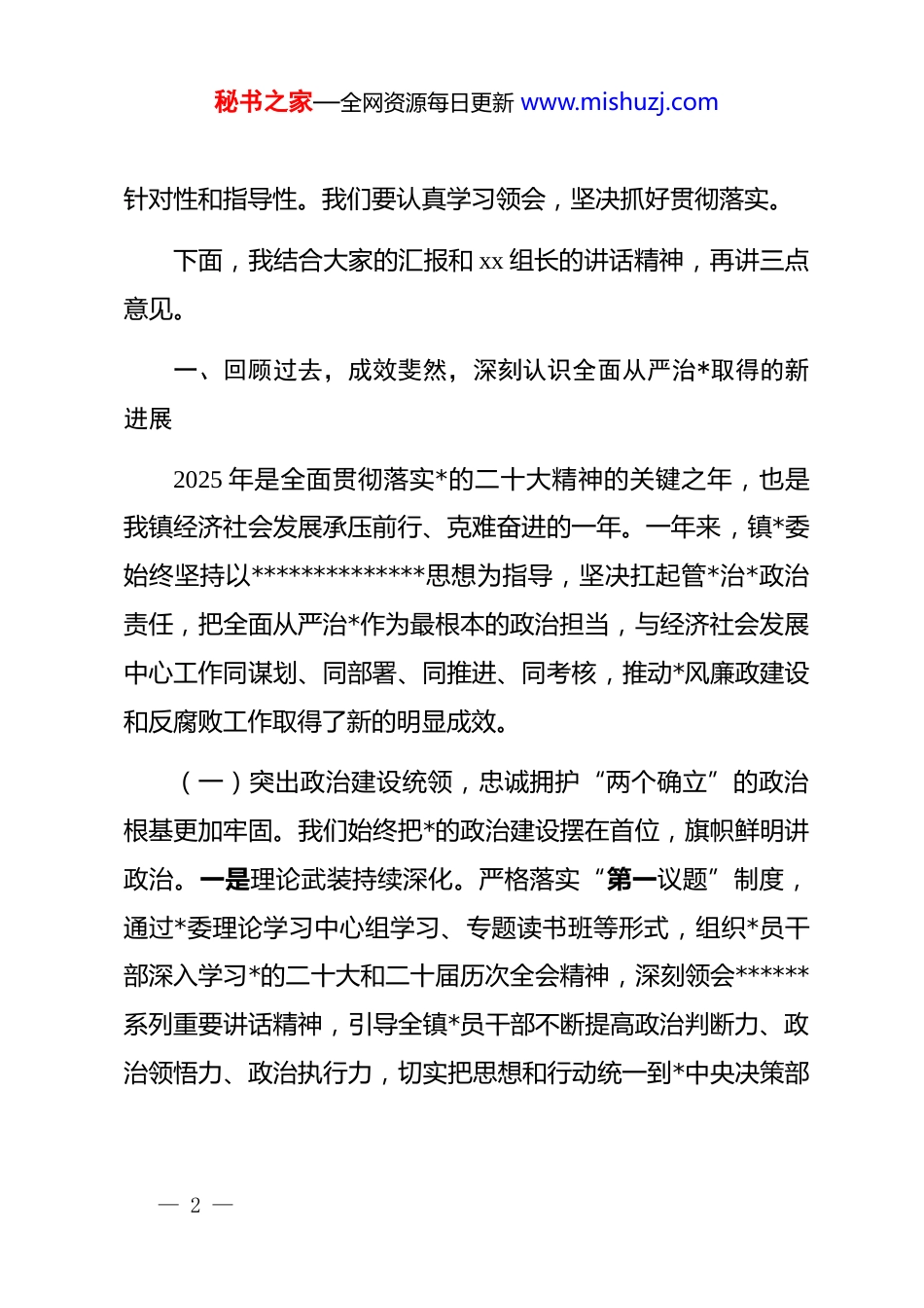 秘书之家—全网资源每日更新 www.mishuzj.com在 xx 镇 2025 年全面从严治*工作专题会暨*风廉政建设和反腐败工作形势分析会上的讲话同志们:今天,我们在这里召开 2025 年全面从严治*工作专题会暨*风廉政建设和反腐败工作形势分析会,主要任务是深入学习贯彻******关于*的自我革命的重要思想,全面总结我镇 2025 年全面从严治*工作,深刻分析当前*风廉政建设和反腐败斗争面临的形势,研究部署下一阶段重点任务。这次会议,既是一次回顾总结、查摆问题的“体检会”,更是一次统一思想、压实责任的“动员会”,对于推动我镇全面从严治*向纵深发展,为全镇经济社会高质量发展提供坚强政治保障,具有十分重要的意义。刚才,xx 同志代表镇纪委汇报了监督责任落实情况,我代表镇*委汇报了主体责任落实情况,对过去一年的工作进行了系统梳理,也对存在的问题进行了深入剖析。区纪委监委派驻区政协机关纪检监察组 xx 组长亲临指导,并对我们的工作给予了充分肯定,指出了存在的问题,提出了明确要求,具有很强的— 1 —秘书之家—全网资源每日更新 www.mishuzj.com针对性和指导性。我们要认真学习领会,坚决抓好贯彻落实。下面,我结合大家的汇报和 xx 组长的讲话精神,再讲三点意见。一、回顾过去,成效斐然,深刻认识全面从严治*取得的新进展2025 年是全面贯彻落实*的二十大精神的关键之年,也是我镇经济社会发展承压前行、克难奋进的一年。一年来,镇*委始终坚持以**************思想为指导,坚决扛起管*治*政治责任,把全面从严治*作为最根本的政治担当,与经济社会发展中心工作同谋划、同部署、同推进、同考核,推动*风廉政建设和反腐败工作取得了新的明显成效。(一)突出政治建设统领,忠诚拥护“两个确立”的政治根基更加牢固。我们始终把*的政治建设摆在首位,旗帜鲜明讲政治。一是理论武装持续深化。严格落实“第一议题”制度,通过*委理论学习中心组学习、专题读书班等形式,组织*员干部深入学习*的二十大和二十届历次全会精神,深刻领会******系列重要讲话精神,引导全镇*员干部不断提高政治判断力、政治领悟力、政治执行力,切实把思想和行动统一到*中央决策部— 2 —秘书之家—全网资源每日更新 www.mishuzj.com署上来。二是政治纪律更加严明。我们始终把严明政治纪律和政治规矩作为生命线,教育引导广大*员干部深刻领悟“两个确立”的决定性意义,增强“四个意识”、坚定“四个自信”、做到“两个维护”。坚决贯彻落实上级*委、政府的各项决策部署,确保政令畅通、令行禁止,以实际行动诠释对*的绝对忠诚。三是政治生态持续向好。通过严肃*内政治生活,严格执行民主集中制、“三重一大”事项集体决策等制度,*内政治生活的政治性、时代性、原则性、战斗性显著增强,营造了风清气正、干事创业的良好政治生态。(二)压实管*治*责任,“两个责任”同向发力的工作格局更加完善。我们牢固树立“抓好 dj 是最大政绩”的理念,层层传导压力,环环扣紧责任。一是主体责任扛得更稳。镇*委切实履行全面从含治*主体责任,全年召开*风廉政建设专题会议4 次,定期分析研判形势,研究解决重大问题。我作为*委书记,认真履行“第一责任人”职责,对重要工作亲自部署、重大问题亲自过问、重点环节亲自协调。班子成员严格落实“一岗双责”,将*风廉政建设融入分管业务工作,形成了*委统一领导、*政齐抓共管、纪委组织协调、部门各负其责的工作格局。二是监督责任落得更实。镇纪委聚焦主责主业,深化运用“四种形— 3 —秘书之家—全网资源每日更新 www.mishuzj.com态”,强化监督执纪问责。全年共处置问题线索 32 条,立案审查 11 件,给予 dj 政务处分 13 人,挽回经济损失 120 余万元。通过精准监督、靶向执纪,释放了越往后执纪越严的强烈信号。三是制度笼子扎得更紧。我们坚持用制度管权、管事、管人,修订完善了《xx 镇“三重一大”事项决策制度实施办法》《xx镇农村集体“三资”管理办法》等一批管长远、固根本的制度,从源头上堵塞了廉政风险漏洞。(三)深化正风肃纪反腐,激浊扬清、向上向善的发展氛围更加浓厚。我们坚持以钉钉子精神纠治“...