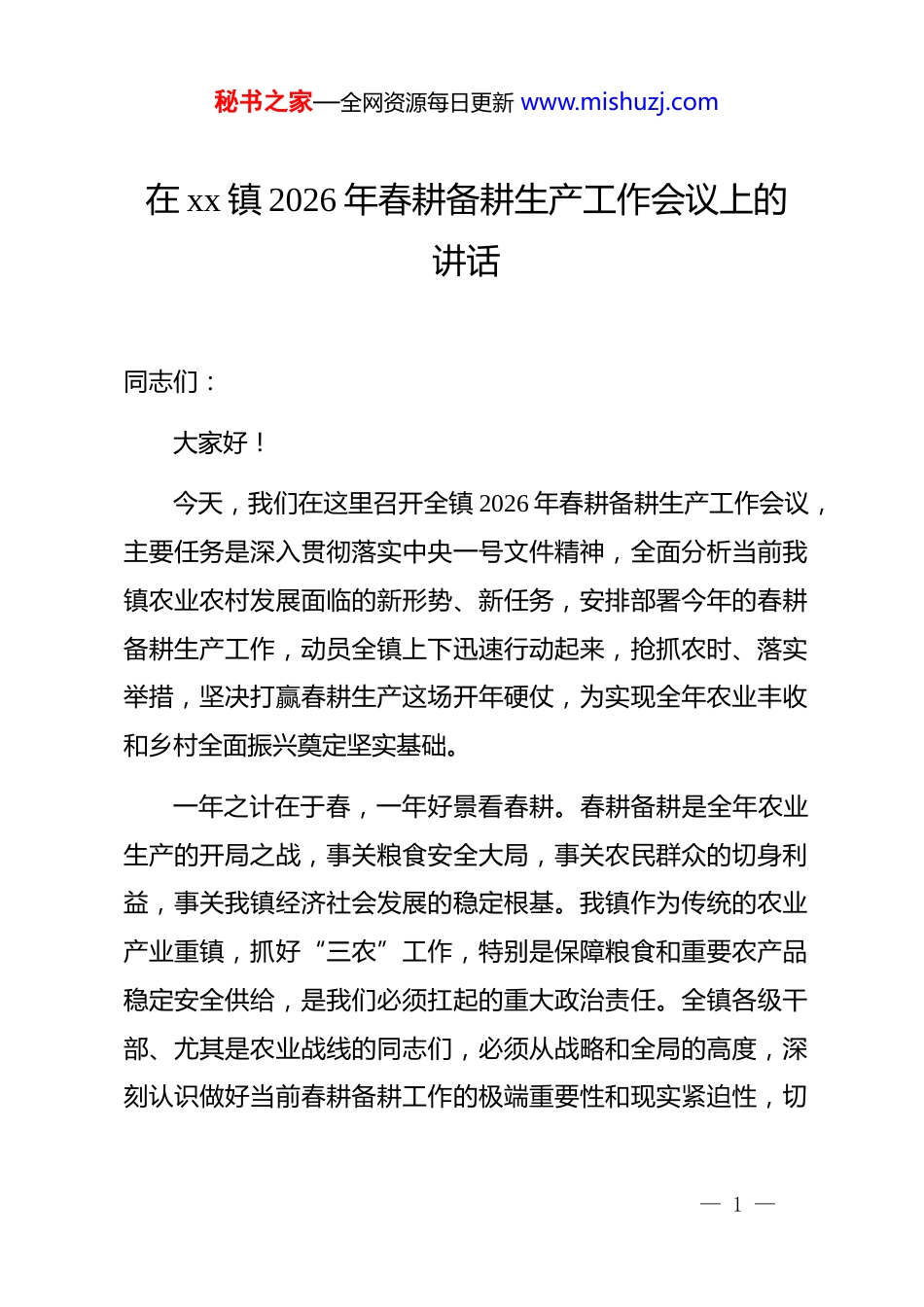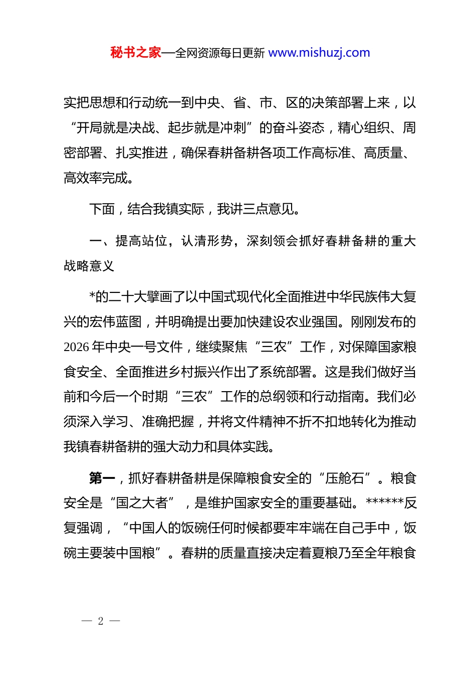秘书之家—全网资源每日更新 www.mishuzj.com在 xx 镇 2026 年春耕备耕生产工作会议上的讲话同志们:大家好!今天,我们在这里召开全镇 2026 年春耕备耕生产工作会议,主要任务是深入贯彻落实中央一号文件精神,全面分析当前我镇农业农村发展面临的新形势、新任务,安排部署今年的春耕备耕生产工作,动员全镇上下迅速行动起来,抢抓农时、落实举措,坚决打赢春耕生产这场开年硬仗,为实现全年农业丰收和乡村全面振兴奠定坚实基础。一年之计在于春,一年好景看春耕。春耕备耕是全年农业生产的开局之战,事关粮食安全大局,事关农民群众的切身利益,事关我镇经济社会发展的稳定根基。我镇作为传统的农业产业重镇,抓好“三农”工作,特别是保障粮食和重要农产品稳定安全供给,是我们必须扛起的重大政治责任。全镇各级干部、尤其是农业战线的同志们,必须从战略和全局的高度,深刻认识做好当前春耕备耕工作的极端重要性和现实紧迫性,切— 1 —秘书之家—全网资源每日更新 www.mishuzj.com实把思想和行动统一到中央、省、市、区的决策部署上来,以“开局就是决战、起步就是冲刺”的奋斗姿态,精心组织、周密部署、扎实推进,确保春耕备耕各项工作高标准、高质量、高效率完成。下面,结合我镇实际,我讲三点意见。一、提高站位,认清形势,深刻领会抓好春耕备耕的重大战略意义*的二十大擘画了以中国式现代化全面推进中华民族伟大复兴的宏伟蓝图,并明确提出要加快建设农业强国。刚刚发布的2026 年中央一号文件,继续聚焦“三农”工作,对保障国家粮食安全、全面推进乡村振兴作出了系统部署。这是我们做好当前和今后一个时期“三农”工作的总纲领和行动指南。我们必须深入学习、准确把握,并将文件精神不折不扣地转化为推动我镇春耕备耕的强大动力和具体实践。第一,抓好春耕备耕是保障粮食安全的“压舱石”。粮食安全是“国之大者”,是维护国家安全的重要基础。******反复强调,“中国人的饭碗任何时候都要牢牢端在自己手中,饭碗主要装中国粮”。春耕的质量直接决定着夏粮乃至全年粮食— 2 —秘书之家—全网资源每日更新 www.mishuzj.com的收成。我镇耕地资源相对有限,保障粮食播种面积和产量稳定,任务艰巨、责任重大。我们必须坚决克服麻痹思想和侥幸心理,把稳定粮食生产作为硬任务来抓,把每一寸耕地都转化为实实在在的生产力,确保粮食播种面积只增不减,为全区、全市的粮食安全大局贡献 xx 力量。第二,抓好春耕备耕是促进农民增收的“金钥匙”。农业是我们的基础产业,农民是我们的衣食父母。农业兴不兴、农村美不美、农民富不富,关键看产业发展和农民收入。春耕备耕不仅是播种希望,更是播种财富。通过科学规划种植结构,大力发展特色产业,推广应用先进技术,能够有效提升农业生产的附加值和比较效益。我们要将政策红利、科技红利、市场红利紧密结合,引导农民群众在稳定粮食生产的基础上,因地制宜发展高附加值的经济作物,实现“一地多用、一季多收”,让广大农民的“钱袋子”在辛勤耕耘后鼓起来,切实增强他们的获得感、幸福感和安全感。第三,抓好春耕备耕是推进乡村振兴的“发动机”。产业振兴是乡村全面振兴的基础和关键。春耕生产搞得好,农业产业根基就牢固,乡村振兴就有了最坚实的支撑。我们要以春耕备耕为契机,统筹推进产业提质增效、人居环境整治、乡风文— 3 —秘书之家—全网资源每日更新 www.mishuzj.com明建设和乡村治理现代化。通过推广绿色生产方式,发展生态循环农业,把“绿水青山”的生态优势转化为“金山银山”的发展优势,实现农业增效、农民增收、农村增绿的有机统一,为建设宜居宜业和美乡村注入源源不断的动力。二、聚焦关键,精准发力,全面掀起春耕备耕生产的工作热潮做好今年的春耕备耕工作,任务繁重,时间紧迫。全镇上下必须紧紧围绕“稳面积、优结构、提单产、增效益”的目标,抓住关键环节,细化工作措施,以钉钉子精神抓好落实,全力打好春耕生产的主动仗。(一)突出“稳”字当头,坚决守住粮食生产安全底线。稳定粮食播种面积是硬指标,是底线任务,没有任何商量的余地。一要严格落实耕地保护制度。要像保护大熊...