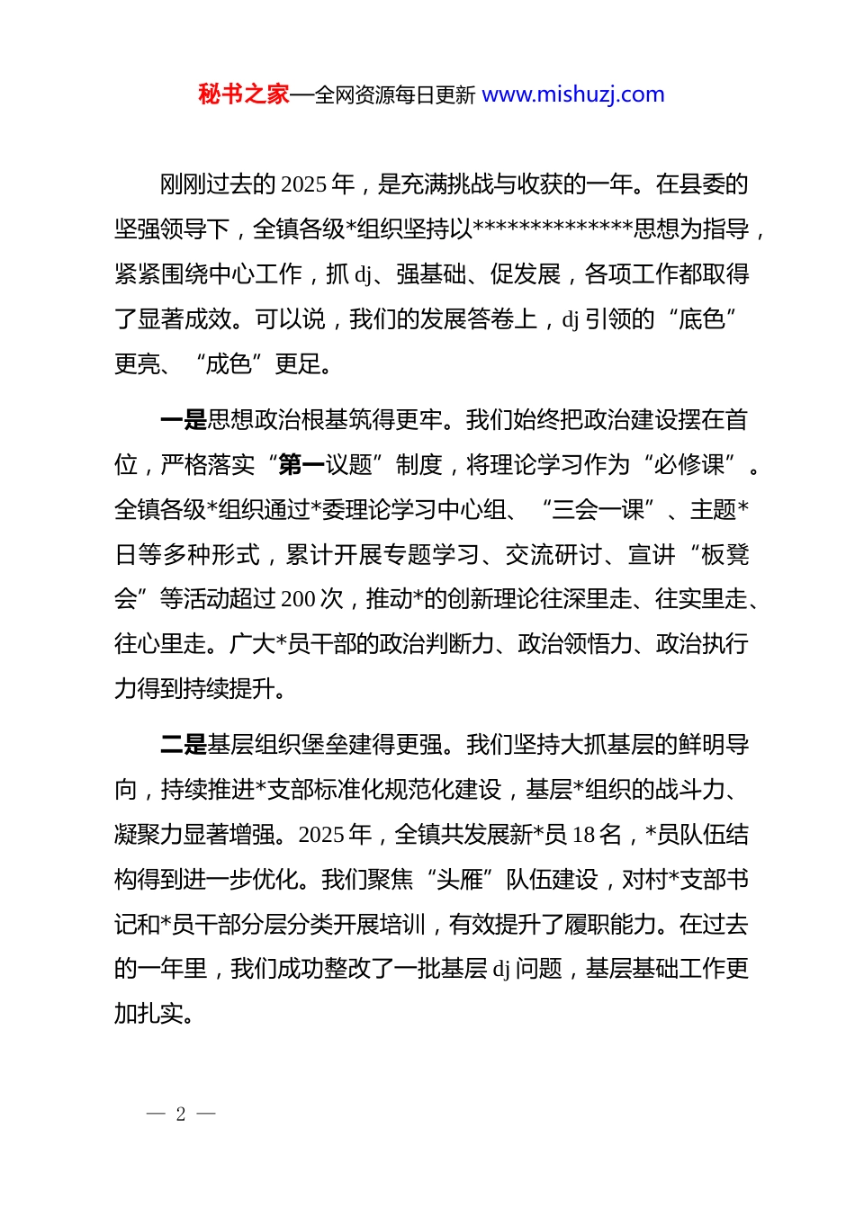 秘书之家—全网资源每日更新 www.mishuzj.com在 xx 镇 2026 年第一季度基层 dj 重点工作安排部署会议上的讲话同志们:今天我们在这里召开全镇 2026 年第一季度基层 dj 重点工作安排部署会议,主要任务是深入学习贯彻**************思想和*的二十大及二十届历次全会精神,传达落实全国组织部长会议和省委全面深化改革委员会会议的最新要求,总结回顾我镇2025 年基层 dj 工作,分析当前面临的形势和任务,并对今年第一季度乃至全年的基层 dj 工作进行全面部署。2026 年是实施“十五五”规划的开局之年,也是我们*成立 105 周年,做好今年的各项工作意义重大、责任重大。开局关系全局,起步决定后势。全镇各级*组织和广大*员干部必须以“开年即冲刺”的姿态,迅速把思想和行动统一到镇*委的决策部署上来,以高质量 dj 引领 xx 镇高质量发展,为“十五五”规划的宏伟蓝图开好局、起好步。下面,我讲三点意见。一、肯定成绩,总结经验,在回顾过去中坚定发展信心— 1 —秘书之家—全网资源每日更新 www.mishuzj.com刚刚过去的 2025 年,是充满挑战与收获的一年。在县委的坚强领导下,全镇各级*组织坚持以**************思想为指导,紧紧围绕中心工作,抓 dj、强基础、促发展,各项工作都取得了显著成效。可以说,我们的发展答卷上,dj 引领的“底色”更亮、“成色”更足。一是思想政治根基筑得更牢。我们始终把政治建设摆在首位,严格落实“第一议题”制度,将理论学习作为“必修课”。全镇各级*组织通过*委理论学习中心组、“三会一课”、主题*日等多种形式,累计开展专题学习、交流研讨、宣讲“板凳会”等活动超过 200 次,推动*的创新理论往深里走、往实里走、往心里走。广大*员干部的政治判断力、政治领悟力、政治执行力得到持续提升。二是基层组织堡垒建得更强。我们坚持大抓基层的鲜明导向,持续推进*支部标准化规范化建设,基层*组织的战斗力、凝聚力显著增强。2025 年,全镇共发展新*员 18 名,*员队伍结构得到进一步优化。我们聚焦“头雁”队伍建设,对村*支部书记和*员干部分层分类开展培训,有效提升了履职能力。在过去的一年里,我们成功整改了一批基层 dj 问题,基层基础工作更加扎实。— 2 —秘书之家—全网资源每日更新 www.mishuzj.com三是 dj 引领发展融得更深。我们深刻认识到,dj 工作如果脱离了中心工作,就会成为“无源之水、无本之木”。一年来,我们坚持把 dj 工作融入全镇发展大局,探索形成的“dj+”模式成效斐然。在 dj 引领产业发展方面,我们成功打造了半夏、羊肚菌、草莓等特色种植产业,其中仅半夏种植一项,年产值就超过了 5000 万元,有力带动了群众增收致富。我们积极推广“*支部+合作社+基地+农户”的发展模式,将*组织的政治优势、组织优势转化为产业发展的强大动能。截至 2025 年底,全镇村集体经济平均值达到了 64.2 万元,人均纯收入实现了5.9%的稳健增长这些数据背后,是 dj 引领下实实在在的发展成果。四是服务群众渠道通得更畅。我们始终把人民群众的“急难愁盼”放在心上,将 dj 工作的落脚点放在为民服务上。我们持续深化和用好 xx 民事直说“1234”工作法这一 dj 品牌,全年累计收集并高效办结群众反映的各类事项超过百件,办结率达到 99%成功化解了各类矛盾纠纷 42 件,让群众切身感受到了*组织的温暖和力量。同时,我们广泛开展了对生活困难*员、老*员的走访慰问活动,传递了组织的关怀,增强了*员的归属感和荣誉感。— 3 —秘书之家—全网资源每日更新 www.mishuzj.com这些成绩的取得,是上级*委正确领导的结果,是全镇各级*组织和广大*员干部群众团结拼搏、共同努力的结果。在此,我代表镇*委,向大家表示衷心的感谢和崇高的敬意!在肯定成绩的同时,我们也要清醒地看到工作中存在的不足,比如,个别*组织的政治功能和组织功能发挥还不够充分,dj 与业务工作的融合深度和广度还有待拓展,少数*员的先锋模范作用体现得还不够明显。对于这些问题,我们必须高度重视,在今后的工作中采取有力措施,切实加以解决。二、认清形势,把握机遇,在精准研判中明确前进方向同...