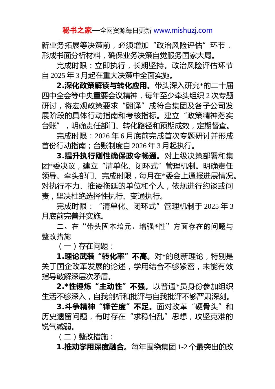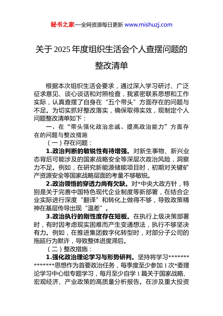 秘书之家—全网资源每日更新 www.mishuzj.com关于 2025 年度组织生活会个人查摆问题的整改清单根据本次组织生活会要求,通过深入学习研讨、广泛征求意见、谈心谈话和对照检查,我紧密联系思想和工作实际,认真查摆了自身在“五个带头”方面存在的问题与不足。为切实抓好整改落实,确保取得实效,现制定个人问题整改清单如下:一、在“带头强化政治忠诚、提高政治能力”方面存在的问题与整改措施(一)存在问题:1.政治判断的敏锐性有待增强。对新生事物、新兴业态背后可能涉及的国家战略安全等深层次政治风险,洞察力不足。例如,在研究新能源储能项目时,初期对关键矿产资源安全等国家战略层面的考量不够敏锐。2.政治领悟的穿透力尚有欠缺。对*中央大政方针,特别是关于完善中国特色现代企业制度等新部署,在结合企业实际进行深度“翻译”和转化上做得不够,导致政策精神在基层传导出现“温差”。3.政治执行的刚性度存在短板。在执行上级决策部署时,有时因考虑现实困难而产生变通想法,执行不够坚决有力。例如,在推进集团数字化转型时,对部分子公司的拖延行为默许,导致整体进度滞后。(二)整改措施:1.强化政治理论学习与形势研判。坚持将学习**************思想作为首要政治任务,每季度至少参加 1 次*委理论学习中心组专题学习,每月至少自学 1 篇关于国家战略、宏观经济、产业政策的高质量分析报告。在涉及重大投资秘书之家—全网资源每日更新 www.mishuzj.com新业务拓展等决策前,必须增加“政治风险评估”环节,形成书面分析材料,确保业务决策自觉服务国家大局。完成时限:立即执行,长期坚持。政治风险评估环节自 2025 年 3 月起在重大决策中全面实施。2.深化政策解读与转化应用。带头深入研究*的二十届四中全会等中央重要会议精神,每年至少牵头组织 2 次专题研讨,将宏观政策要求“翻译”成符合集团及各子公司发展阶段的具体行动指南和考核指标。建立“政策精神落实台账”,明确责任部门、转化路径和预期成效,定期督查。完成时限:2026 年 6 月底前完成首次专题研讨并形成首份行动指南;台账制度自 2026 年 3 月起执行。3.提升执行刚性确保政令畅通。对上级决策部署和集团*委决议,建立“清单化、闭环式”管理机制。明确责任领导、牵头部门、完成时限,每月在*委会上通报进展情况。对执行不力、推诿拖延的单位和个人,依规进行约谈或问责,坚决杜绝选择性执行、变通执行。完成时限:“清单化、闭环式”管理机制于 2025 年 3月底前完善并实施。二、在“带头固本培元、增强*性”方面存在的问题与整改措施(一)存在问题:1.理论武装“转化率”不高。对*的创新理论,特别是关于国企改革发展的论述,学用结合不够紧密,未能有效指导破解深层次矛盾。2.*性锤炼“主动性”不强。以普通*员身份参加组织生活不够深入,自我剖析和批评与自我批评不够严肃深刻。3.斗争精神“锋芒度”不足。面对改革“硬骨头”和历史遗留问题,有时存在“求稳怕乱”思想,攻坚克难的锐气减弱。(二)整改措施:1.推动学用深度融合。每年围绕集团 1-2 个最突出的改秘书之家—全网资源每日更新 www.mishuzj.com革发展难题(如存量资产盘活、新兴产业培育),确定个人重点调研课题,深入一线摸清情况,运用*的创新理论寻找破解之道,形成高质量调研报告并在*委会上专题汇报,推动成果转化。完成时限:2026 年 4 月底前确定调研课题,10 月底前完成调研并形成报告。2.严肃*内政治生活。严格执行双重组织生活制度,每年至少以普通*员身份在所在支部参加 4 次组织生活。带头开展深刻的自我批评,诚恳接受*员评议。在 2025 年度的组织生活会上,就改革攻坚中的畏难情绪等问题进行重点剖析。完成时限:长期坚持。2026 年支部组织生活会前完成深刻自我剖析材料。3.发扬攻坚克难斗争精神。主动认领 1-2 项集团内最难推动的改革任务或历史遗留问题(如亏损子公司转型),亲自担任攻坚组长,制定详细方案,明确时间表、路线图定期调度,一抓到底,确保取得实质性突破。完成时限:2026 年 3 月底前确定攻坚任务并启动,年内取得阶段性明显成效。三、在“带头敬畏...