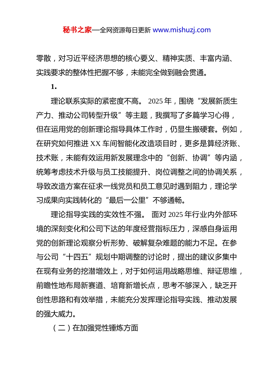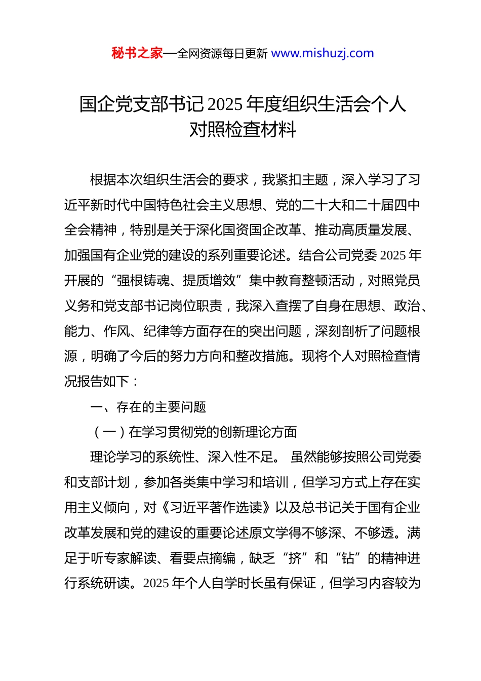 秘书之家—全网资源每日更新 www.mishuzj.com国企党支部书记 2025 年度组织生活会个人对照检查材料 根据本次组织生活会的要求,我紧扣主题,深入学习了习近平新时代中国特色社会主义思想、党的二十大和二十届四中全会精神,特别是关于深化国资国企改革、推动高质量发展、加强国有企业党的建设的系列重要论述。结合公司党委 2025 年开展的“强根铸魂、提质增效”集中教育整顿活动,对照党员义务和党支部书记岗位职责,我深入查摆了自身在思想、政治、能力、作风、纪律等方面存在的突出问题,深刻剖析了问题根源,明确了今后的努力方向和整改措施。现将个人对照检查情况报告如下:一、存在的主要问题(一)在学习贯彻党的创新理论方面理论学习的系统性、深入性不足。 虽然能够按照公司党委和支部计划,参加各类集中学习和培训,但学习方式上存在实用主义倾向,对《习近平著作选读》以及总书记关于国有企业改革发展和党的建设的重要论述原文学得不够深、不够透。满足于听专家解读、看要点摘编,缺乏“挤”和“钻”的精神进行系统研读。2025 年个人自学时长虽有保证,但学习内容较为秘书之家—全网资源每日更新 www.mishuzj.com零散,对习近平经济思想的核心要义、精神实质、丰富内涵、实践要求的整体性把握不够,未能完全做到融会贯通。1.理论联系实际的紧密度不高。 2025 年,围绕“发展新质生产力、推动公司转型升级”等主题,我撰写了多篇学习心得,但在运用党的创新理论指导具体工作时,仍显生搬硬套。例如,在研究如何推进 XX 车间智能化改造项目时,更多是算经济账、技术账,未能有效运用新发展理念中的“创新、协调”等内涵,统筹考虑技术升级与员工技能提升、岗位调整之间的协调关系,导致改造方案在征求一线党员和员工意见时遇到阻力,理论学习成果向实践转化的“最后一公里”不够通畅。理论指导实践的实效性不强。 面对 2025 年行业内外部环境的深刻变化和公司下达的年度经营指标压力,深感自身运用党的创新理论观察分析形势、破解复杂难题的能力不足。在参与公司“十四五”规划中期调整的讨论时,提出的建议多集中在现有业务的挖潜增效上,对于如何运用战略思维、辩证思维,前瞻性地布局新赛道、培育新增长点,思考不够深入,缺乏开创性思路和有效举措,未能充分发挥理论指导实践、推动发展的强大威力。(二)在加强党性锤炼方面秘书之家—全网资源每日更新 www.mishuzj.com政治修养的锤炼深度有待加强。 作为支部书记,日常工作头绪繁多,有时会陷入事务主义,对政治修养的锤炼有所松懈,未能时刻对照党章党规检视自身言行。2025 年 9 月,在处理一起涉及外协单位的合同纠纷时,更多是从法律条款和商业利益角度出发进行谈判,未能从维护国有企业形象、保障员工队伍稳定、防范化解重大风险的政治高度来审视和处置问题,政治判断力、政治领悟力、政治执行力有待进一步提升。纪律规矩的执行刚性有待强化。 对自我要求有时不够严格,存在“随大流”心态。2025 年第二季度,公司党委组织的两次重要会议,我虽都参加了,但其中一次因处理部门琐事未能按时到场,尽管事后补了假,但提前未严格履行书面请假手续。作为支部书记,本应是遵规守纪的标杆,却在细节上打了折扣,未能给支部党员作出表率,反映出纪律观念和规矩意识树得不够牢。斗争精神的磨砺韧劲有待增强。 面对企业改革发展中的深层次矛盾和困难,有时存在畏难情绪和“绕道走”思想。2025年,在推进三项制度改革、优化部分岗位人员配置时,面对个别不理解、不配合的老员工,我缺乏动真碰硬的勇气和耐心细致的沟通,担心激化矛盾,导致该项工作推进缓慢、成效不彰。这种“爱惜羽毛”、不敢担当的表现,实质上是斗争精神不强、秘书之家—全网资源每日更新 www.mishuzj.com攻坚锐气不足的体现。(三)在联系服务职工群众方面深入基层听取民意的扎实度不够。 翻看 2025 年的工作记录,虽然按规定参加了领导干部联系点活动、开展了多次基层调研,但调研质量有待提高。有时是“走马观花”式地到车间转转、与班组长聊聊,真正沉下心来与一线普通职工,特别是青年员工、困难职工面对面、心贴心交...