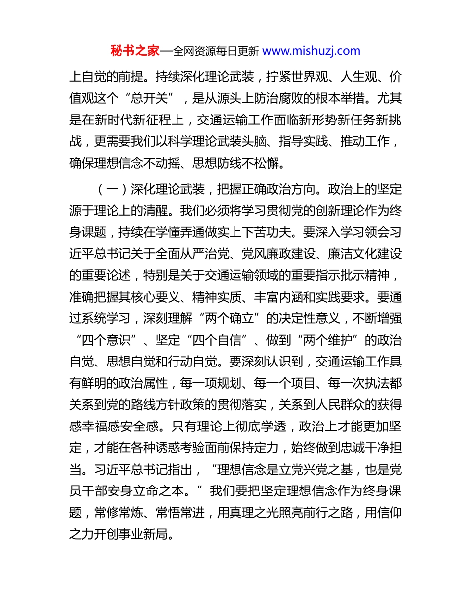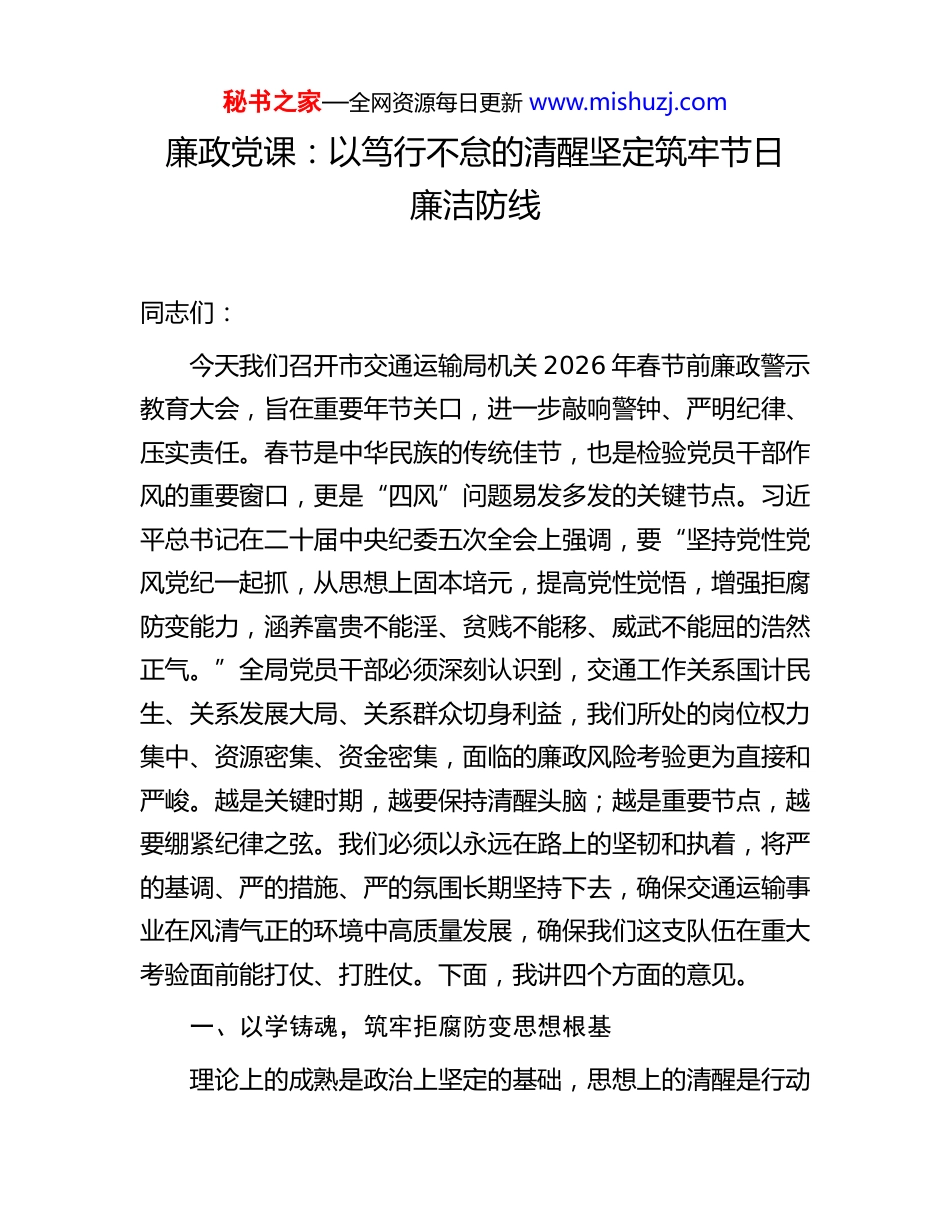 秘书之家—全网资源每日更新 www.mishuzj.com廉政党课:以笃行不怠的清醒坚定筑牢节日廉洁防线同志们:今天我们召开市交通运输局机关 2026 年春节前廉政警示教育大会,旨在重要年节关口,进一步敲响警钟、严明纪律、压实责任。春节是中华民族的传统佳节,也是检验党员干部作风的重要窗口,更是“四风”问题易发多发的关键节点。习近平总书记在二十届中央纪委五次全会上强调,要“坚持党性党风党纪一起抓,从思想上固本培元,提高党性觉悟,增强拒腐防变能力,涵养富贵不能淫、贫贱不能移、威武不能屈的浩然正气。”全局党员干部必须深刻认识到,交通工作关系国计民生、关系发展大局、关系群众切身利益,我们所处的岗位权力集中、资源密集、资金密集,面临的廉政风险考验更为直接和严峻。越是关键时期,越要保持清醒头脑;越是重要节点,越要绷紧纪律之弦。我们必须以永远在路上的坚韧和执着,将严的基调、严的措施、严的氛围长期坚持下去,确保交通运输事业在风清气正的环境中高质量发展,确保我们这支队伍在重大考验面前能打仗、打胜仗。下面,我讲四个方面的意见。一、以学铸魂,筑牢拒腐防变思想根基理论上的成熟是政治上坚定的基础,思想上的清醒是行动秘书之家—全网资源每日更新 www.mishuzj.com上自觉的前提。持续深化理论武装,拧紧世界观、人生观、价值观这个“总开关”,是从源头上防治腐败的根本举措。尤其是在新时代新征程上,交通运输工作面临新形势新任务新挑战,更需要我们以科学理论武装头脑、指导实践、推动工作,确保理想信念不动摇、思想防线不松懈。(一)深化理论武装,把握正确政治方向。政治上的坚定源于理论上的清醒。我们必须将学习贯彻党的创新理论作为终身课题,持续在学懂弄通做实上下苦功夫。要深入学习领会习近平总书记关于全面从严治党、党风廉政建设、廉洁文化建设的重要论述,特别是关于交通运输领域的重要指示批示精神,准确把握其核心要义、精神实质、丰富内涵和实践要求。要通过系统学习,深刻理解“两个确立”的决定性意义,不断增强“四个意识”、坚定“四个自信”、做到“两个维护”的政治自觉、思想自觉和行动自觉。要深刻认识到,交通运输工作具有鲜明的政治属性,每一项规划、每一个项目、每一次执法都关系到党的路线方针政策的贯彻落实,关系到人民群众的获得感幸福感安全感。只有理论上彻底学透,政治上才能更加坚定,才能在各种诱惑考验面前保持定力,始终做到忠诚干净担当。习近平总书记指出,“理想信念是立党兴党之基,也是党员干部安身立命之本。”我们要把坚定理想信念作为终身课题,常修常炼、常悟常进,用真理之光照亮前行之路,用信仰之力开创事业新局。秘书之家—全网资源每日更新 www.mishuzj.com(二)严守政治纪律,恪守清正廉洁本分。政治纪律是最重要、最根本、最关键的纪律。遵守党的政治纪律和政治规矩,最核心的就是坚持党的领导,同党中央保持高度一致,自觉维护党中央权威。对于交通运输部门的党员干部而言,严守政治纪律,就是要坚决贯彻执行党中央关于经济社会发展的各项决策部署,特别是关于建设交通强国、构建现代化综合交通运输体系的战略安排,确保令行禁止、政令畅通。要坚决反对“七个有之”,坚决抵制任何形式的“低级红”、“高级黑”,决不允许搞上有政策、下有对策,决不允许有令不行、有禁不止。要自觉规范政治言行,不在公开场合或网络平台发表与党的路线方针政策相违背的言论,不传播政治谣言和小道消息。要深刻认识到,廉洁从政是党员干部必须守住的底线,也是对党忠诚的具体体现。要时刻自重自省自警自励,做到慎独慎初慎微慎友,净化社交圈、生活圈、朋友圈,管好自己、管好家人、管好身边人,始终保持共产党人的政治本色和廉洁操守,确保权力在正确的轨道上运行。(三)坚定文化自信,涵养高尚道德情操。中华优秀传统文化中蕴含着丰富的廉政思想资源,革命文化和社会主义先进文化更是我们党砥砺初心、勇担使命的强大精神支撑。加强廉洁文化建设,是增强党员干部拒腐防变能力的治本之策。我们要善于从中华优秀传统文化中汲取崇德尚廉、持廉守正的智慧,弘扬忠诚老实、公道正派、实事求是...