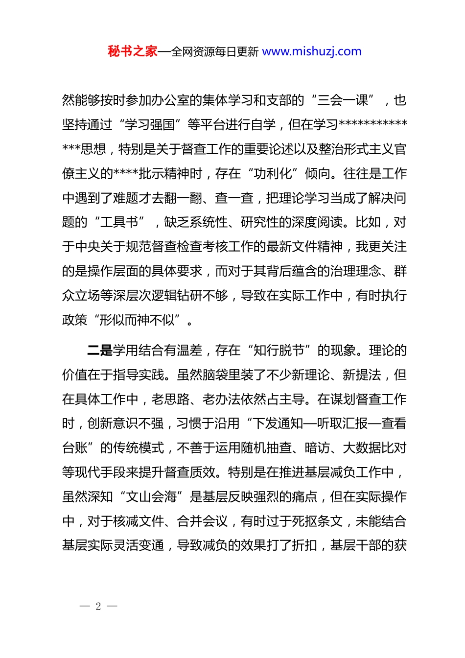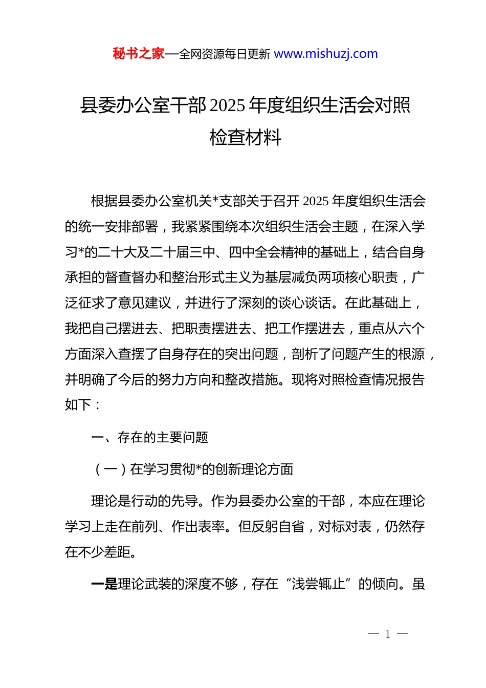 秘书之家—全网资源每日更新 www.mishuzj.com县委办公室干部 2025 年度组织生活会对照检查材料根据县委办公室机关*支部关于召开 2025 年度组织生活会的统一安排部署,我紧紧围绕本次组织生活会主题,在深入学习*的二十大及二十届三中、四中全会精神的基础上,结合自身承担的督查督办和整治形式主义为基层减负两项核心职责,广泛征求了意见建议,并进行了深刻的谈心谈话。在此基础上,我把自己摆进去、把职责摆进去、把工作摆进去,重点从六个方面深入查摆了自身存在的突出问题,剖析了问题产生的根源,并明确了今后的努力方向和整改措施。现将对照检查情况报告如下:一、存在的主要问题(一)在学习贯彻*的创新理论方面理论是行动的先导。作为县委办公室的干部,本应在理论学习上走在前列、作出表率。但反躬自省,对标对表,仍然存在不少差距。一是理论武装的深度不够,存在“浅尝辄止”的倾向。虽— 1 —秘书之家—全网资源每日更新 www.mishuzj.com然能够按时参加办公室的集体学习和支部的“三会一课”,也坚持通过“学习强国”等平台进行自学,但在学习**************思想,特别是关于督查工作的重要论述以及整治形式主义官僚主义的****批示精神时,存在“功利化”倾向。往往是工作中遇到了难题才去翻一翻、查一查,把理论学习当成了解决问题的“工具书”,缺乏系统性、研究性的深度阅读。比如,对于中央关于规范督查检查考核工作的最新文件精神,我更关注的是操作层面的具体要求,而对于其背后蕴含的治理理念、群众立场等深层次逻辑钻研不够,导致在实际工作中,有时执行政策“形似而神不似”。二是学用结合有温差,存在“知行脱节”的现象。理论的价值在于指导实践。虽然脑袋里装了不少新理论、新提法,但在具体工作中,老思路、老办法依然占主导。在谋划督查工作时,创新意识不强,习惯于沿用“下发通知—听取汇报—查看台账”的传统模式,不善于运用随机抽查、暗访、大数据比对等现代手段来提升督查质效。特别是在推进基层减负工作中,虽然深知“文山会海”是基层反映强烈的痛点,但在实际操作中,对于核减文件、合并会议,有时过于死抠条文,未能结合基层实际灵活变通,导致减负的效果打了折扣,基层干部的获— 2 —秘书之家—全网资源每日更新 www.mishuzj.com得感不强。三是运用*的创新理论破解难题的能力不足。面对当前改革发展中的复杂矛盾,比如如何统筹“督帮结合”,既指出问题又帮助基层协调解决困难;如何在刚性执行县委决策与体恤基层辛苦之间找到平衡点,我感到办法不多、能力欠缺。有时习惯于当“二传手”,把上级文件转发下去;当“传声筒”,把基层情况汇报上去,缺乏运用马克思主义立场观点方法去分析问题、提出建设性意见的自觉和能力。去年在牵头开展一项关于优化营商环境的专项督查时,面对一些部门反映的体制机制障碍,我只是简单地把问题汇总上报,未能深入分析根源并提出有操作性的破解路径,参谋助手作用发挥不到位。(二)在加强*性锤炼方面*性是*员干部立身、立业、立言、立德的基石。作为县委枢纽机关的干部,更应时刻绷紧*性这根弦,但实际表现仍有差距。一是政治敏锐性不够强。身处县委办,离决策层近,但有时对“国之大者”领会不深,对县委决策部署背后的政治考量理解不透。在督查工作中,有时单纯从业务角度看问题,就督— 3 —秘书之家—全网资源每日更新 www.mishuzj.com查抓督查,未能站在讲政治的高度去审视工作落实中存在的偏差。比如,在督查乡村振兴政策落实情况时,更多关注项目进度、资金拨付等硬指标,对干部作风、群众满意度等软指标重视不够,未能透过业务问题看到政治责任是否压实。二是斗争精神有所弱化。督查工作本质上是“得罪人”的活儿,需要动真碰硬。但在实际工作中,有时存在“老好人”思想,怕得罪人、怕伤和气。在反馈督查问题时,有时会不自觉地“降调子”“打包票”,对一些细枝末节的问题一笔带过,对一些敏感问题点到为止,不敢揭短亮丑。特别是在涉及一些强势部门或历史遗留问题时,存在畏难情绪,缺乏“啃硬骨头”的勇气和一抓到底的韧劲。在协调推进基层减负工作时,面对个别部门以“工作需要...