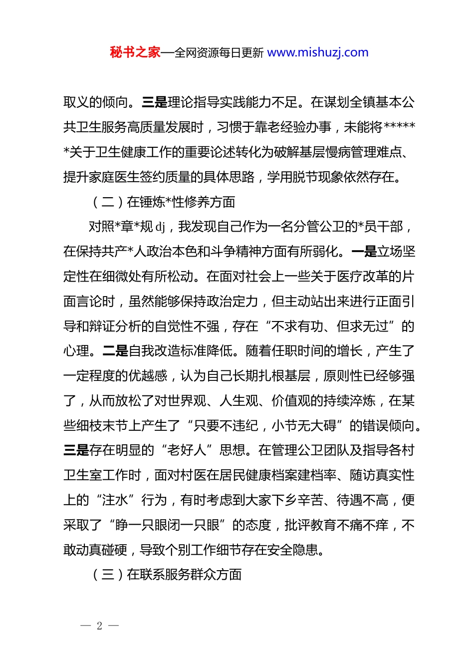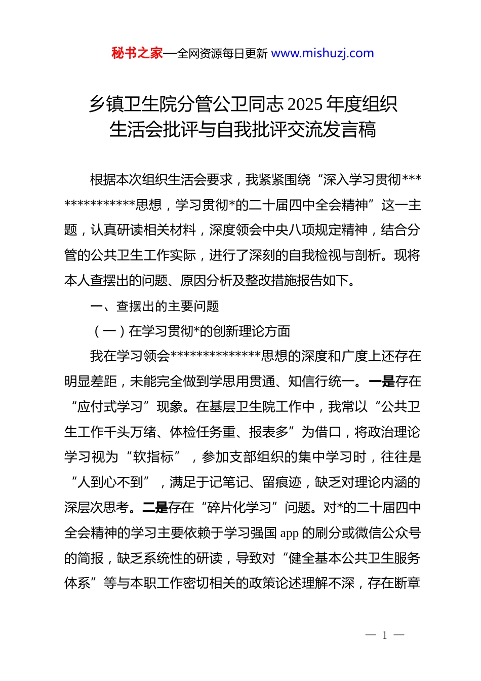 秘书之家—全网资源每日更新 www.mishuzj.com乡镇卫生院分管公卫同志 2025 年度组织生活会批评与自我批评交流发言稿根据本次组织生活会要求,我紧紧围绕“深入学习贯彻**************思想,学习贯彻*的二十届四中全会精神”这一主题,认真研读相关材料,深度领会中央八项规定精神,结合分管的公共卫生工作实际,进行了深刻的自我检视与剖析。现将本人查摆出的问题、原因分析及整改措施报告如下。一、查摆出的主要问题(一)在学习贯彻*的创新理论方面我在学习领会**************思想的深度和广度上还存在明显差距,未能完全做到学思用贯通、知信行统一。一是存在“应付式学习”现象。在基层卫生院工作中,我常以“公共卫生工作千头万绪、体检任务重、报表多”为借口,将政治理论学习视为“软指标”,参加支部组织的集中学习时,往往是“人到心不到”,满足于记笔记、留痕迹,缺乏对理论内涵的深层次思考。二是存在“碎片化学习”问题。对*的二十届四中全会精神的学习主要依赖于学习强国 app 的刷分或微信公众号的简报,缺乏系统性的研读,导致对“健全基本公共卫生服务体系”等与本职工作密切相关的政策论述理解不深,存在断章— 1 —秘书之家—全网资源每日更新 www.mishuzj.com取义的倾向。三是理论指导实践能力不足。在谋划全镇基本公共卫生服务高质量发展时,习惯于靠老经验办事,未能将******关于卫生健康工作的重要论述转化为破解基层慢病管理难点、提升家庭医生签约质量的具体思路,学用脱节现象依然存在。(二)在锤炼*性修养方面对照*章*规 dj,我发现自己作为一名分管公卫的*员干部,在保持共产*人政治本色和斗争精神方面有所弱化。一是立场坚定性在细微处有所松动。在面对社会上一些关于医疗改革的片面言论时,虽然能够保持政治定力,但主动站出来进行正面引导和辩证分析的自觉性不强,存在“不求有功、但求无过”的心理。二是自我改造标准降低。随着任职时间的增长,产生了一定程度的优越感,认为自己长期扎根基层,原则性已经够强了,从而放松了对世界观、人生观、价值观的持续淬炼,在某些细枝末节上产生了“只要不违纪,小节无大碍”的错误倾向。三是存在明显的“老好人”思想。在管理公卫团队及指导各村卫生室工作时,面对村医在居民健康档案建档率、随访真实性上的“注水”行为,有时考虑到大家下乡辛苦、待遇不高,便采取了“睁一只眼闭一只眼”的态度,批评教育不痛不痒,不敢动真碰硬,导致个别工作细节存在安全隐患。(三)在联系服务群众方面— 2 —秘书之家—全网资源每日更新 www.mishuzj.com虽然身处基层医疗一线,但我在全心全意为人民服务的宗旨意识上还不够牢固,存在服务意识退化的情况。一是对群众呼声的主动倾听不足。日常工作多是在办公室看数据、审报表,下乡调研往往是陪同上级检查或督导进度,真正坐到老百姓炕头听取关于老人体检、疫苗接种服务意见的时间极少。二是对待群众缺乏耐心。在流感疫苗接种高峰或慢病体检现场,面对咨询政策的群众,有时因工作压力大、重复提问多而表现出急躁情绪,言语不够温和,虽然没有发生正面冲突,但“门好进、脸好看、事难办”的潜倾向在态度上有所抬头。三是为群众办实事不够扎实。在推行家医签约服务时,更多关注的是签约率的指标完成,而忽视了签约后的实质性履约服务,导致部分患病群众反映“签而不约”,自己虽然意识到了这些问题,但在协调解决药品供给、入户诊疗便利化等实际困难上招数不多,未能真正打通服务群众的“最后一公里”。(四)在发挥先锋模范作用方面对照优秀共产*员的标准,我发现自己在急难险重任务面前的冲锋劲头和日常工作中的业务精进程度都有所滑坡。一是在攻坚克难上存在“躺平”心态。面对近年来公卫信息化改造、智慧医疗介入等新要求,自己作为分管领导,产生了畏难情绪,认为自己年龄偏大、电脑技术底子薄,习惯于将这些技术活儿— 3 —秘书之家—全网资源每日更新 www.mishuzj.com推给年轻干部,自己只当“甩手掌柜”,缺乏带头学习、带头攻关的魄力。二是在日常岗位上干劲不足。相比于刚参工时的激情,现在出现了“吃老本”现象,工作按部就班,缺乏创新意识...