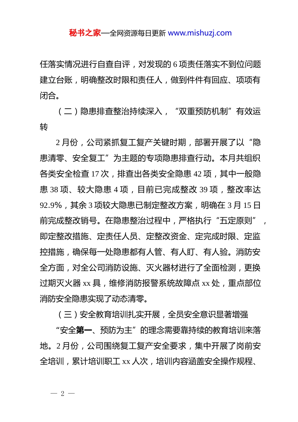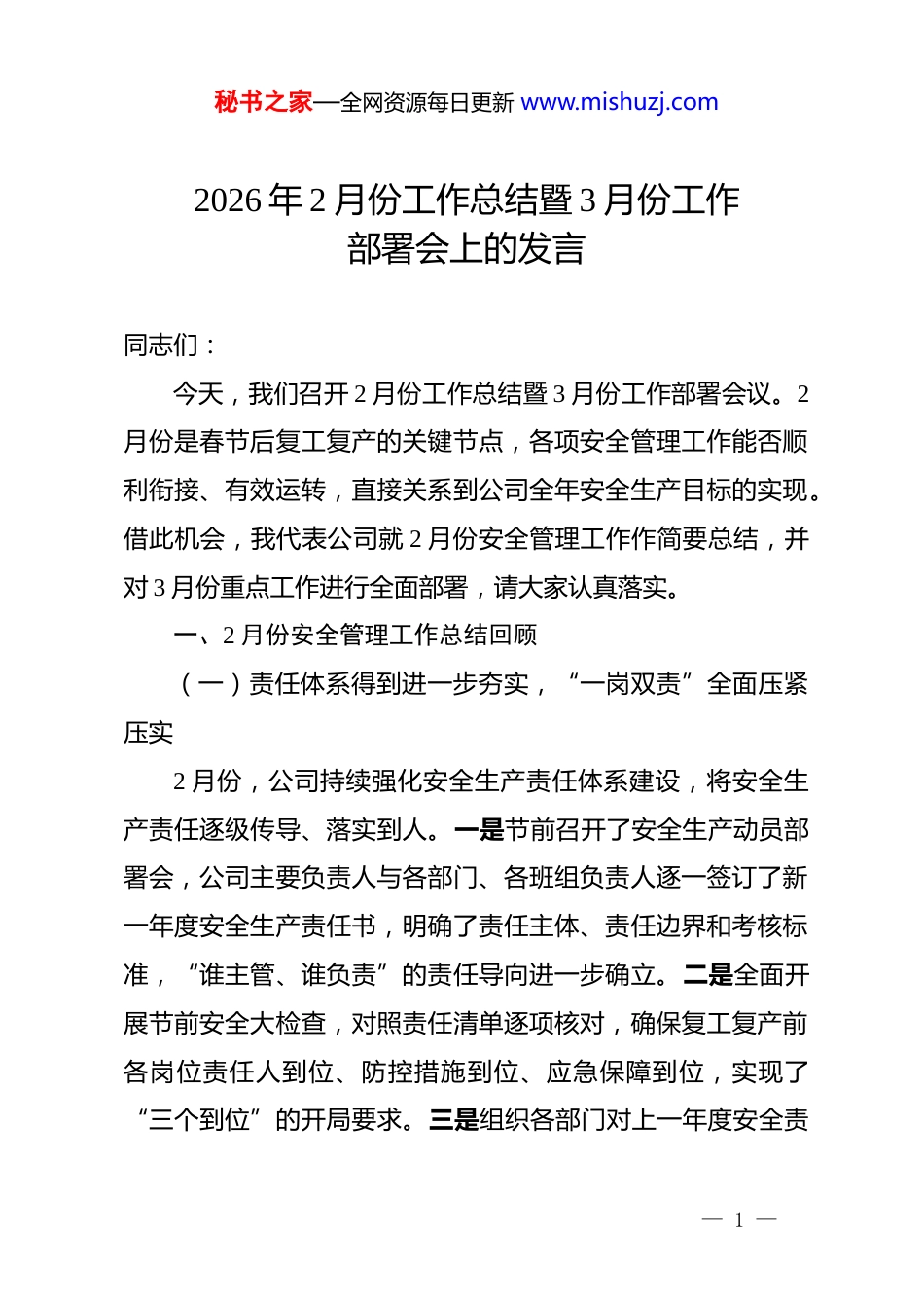 秘书之家—全网资源每日更新 www.mishuzj.com2026 年 2 月份工作总结暨 3 月份工作部署会上的发言同志们:今天,我们召开 2 月份工作总结暨 3 月份工作部署会议。2月份是春节后复工复产的关键节点,各项安全管理工作能否顺利衔接、有效运转,直接关系到公司全年安全生产目标的实现。借此机会,我代表公司就 2 月份安全管理工作作简要总结,并对 3 月份重点工作进行全面部署,请大家认真落实。一、2 月份安全管理工作总结回顾(一)责任体系得到进一步夯实,“一岗双责”全面压紧压实2 月份,公司持续强化安全生产责任体系建设,将安全生产责任逐级传导、落实到人。一是节前召开了安全生产动员部署会,公司主要负责人与各部门、各班组负责人逐一签订了新一年度安全生产责任书,明确了责任主体、责任边界和考核标准,“谁主管、谁负责”的责任导向进一步确立。二是全面开展节前安全大检查,对照责任清单逐项核对,确保复工复产前各岗位责任人到位、防控措施到位、应急保障到位,实现了“三个到位”的开局要求。三是组织各部门对上一年度安全责— 1 —秘书之家—全网资源每日更新 www.mishuzj.com任落实情况进行自查自评,对发现的 6 项责任落实不到位问题建立台账,明确整改时限和责任人,做到件件有回应、项项有闭合。(二)隐患排查整治持续深入,“双重预防机制”有效运转2 月份,公司紧抓复工复产关键时期,部署开展了以“隐患清零、安全复工”为主题的专项隐患排查行动。本月共组织各类安全检查 17 次,排查出各类安全隐患 42 项,其中一般隐患 38 项、较大隐患 4 项,目前已完成整改 39 项,整改率达92.9%,其余 3 项较大隐患已制定整改方案,明确在 3 月 15 日前完成整改销号。在隐患整治过程中,严格执行“五定原则”,即定整改措施、定责任人员、定整改资金、定完成时限、定监控措施,确保每一处隐患都有人管、有人盯、有人验。消防安全方面,对全公司消防设施、灭火器材进行了全面检测,更换过期灭火器 xx 具,维修消防报警系统故障点 xx 处,重点部位消防安全隐患实现了动态清零。(三)安全教育培训扎实开展,全员安全意识显著增强“安全第一、预防为主”的理念需要靠持续的教育培训来落地。2 月份,公司围绕复工复产安全要求,集中开展了岗前安全培训,累计培训职工 xx 人次,培训内容涵盖安全操作规程、— 2 —秘书之家—全网资源每日更新 www.mishuzj.com应急处置流程、危险源辨识方法等核心模块。一是针对新入职和节后返岗人员,重点开展了“三级安全教育”,确保每一名员工在上岗前都掌握本岗位安全操作要求。二是对特种作业人员和关键岗位人员进行了专项技能培训,组织 xx 名特种作业人员参加复证培训,持证上岗率保持 100%。三是在班前会、晨会等日常活动中穿插安全知识宣讲,以案例警示引导职工将安全意识内化于心、外化于行,本月职工安全违章行为同比下降xx%。(四)应急管理体系持续完善,实战应对能力稳步提升2 月份,公司修订完善了《综合安全生产应急预案》及 xx个专项预案,结合冬春季节特点,针对性补充了低温雨雪、大风天气等自然灾害应对措施,预案体系的针对性和可操作性进一步提升。本月共组织应急演练 2 次,其中消防疏散演练 1 次、危险作业应急处置演练 1 次,参演人员合计 xx 人,演练总体达到预期效果,但也暴露出部分职工疏散路线不熟悉、应急器材使用不熟练等问题,已纳入后续培训整改计划。应急物资方面,完成了应急救援物资的全面清查补充,应急药箱、防护器具、通讯设备等配置均符合规定标准。二、2 月份存在的主要问题与不足(一)安全管理薄弱环节依然存在,“最后一公里”落实— 3 —秘书之家—全网资源每日更新 www.mishuzj.com仍有差距总体来看,2 月份安全管理工作取得了一定成效,但对照公司安全管理高标准要求,还存在一些不容忽视的问题。一是部分基层班组安全主体责任意识还不够强,存在“等上级检查才整改”的被动应付心态,隐患自查自报的主动性有待进一步激发。二是个别岗位操作人员对安全规程的执行存在走过场现象,习惯性违章行为时有发生,说明安全教...