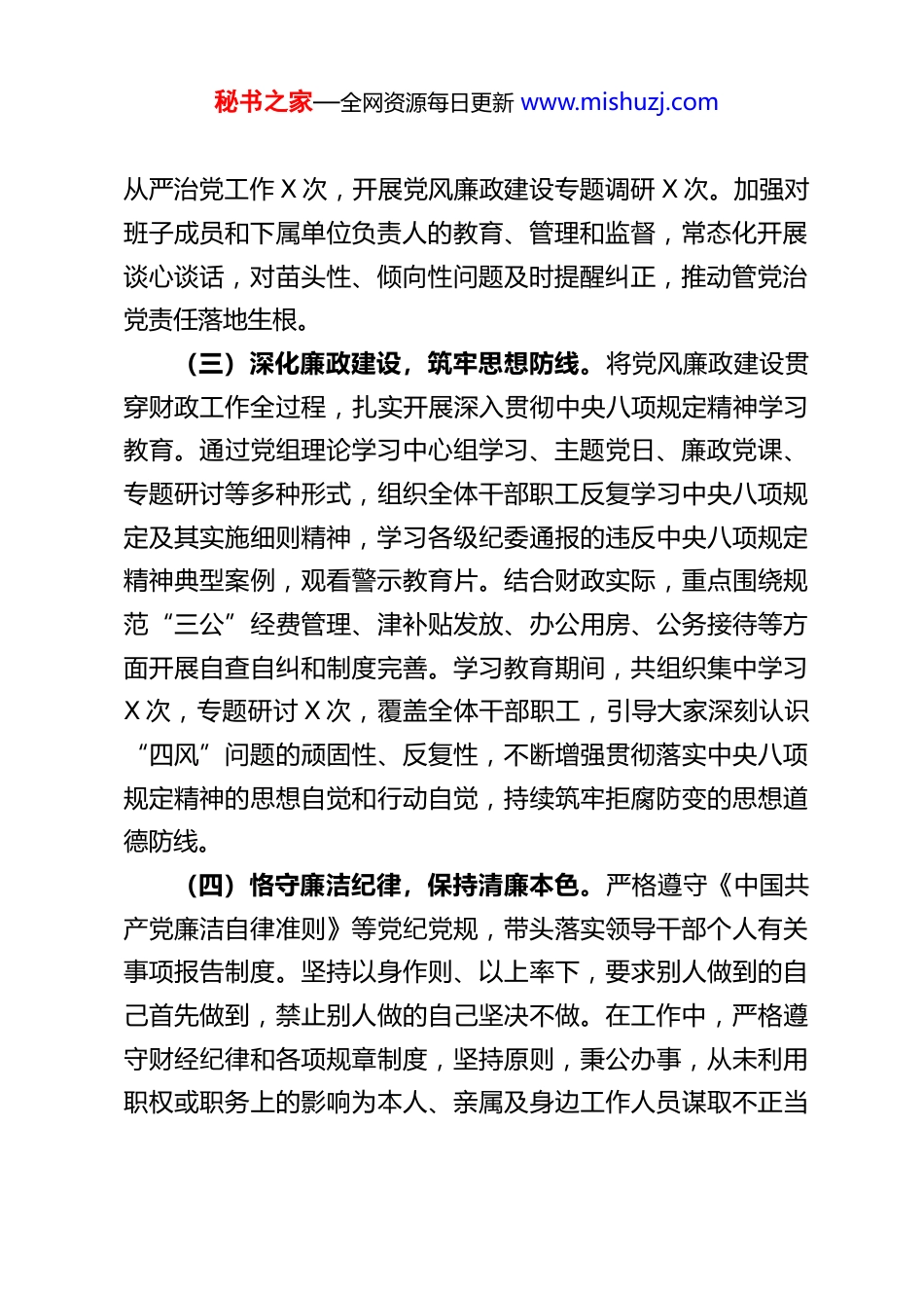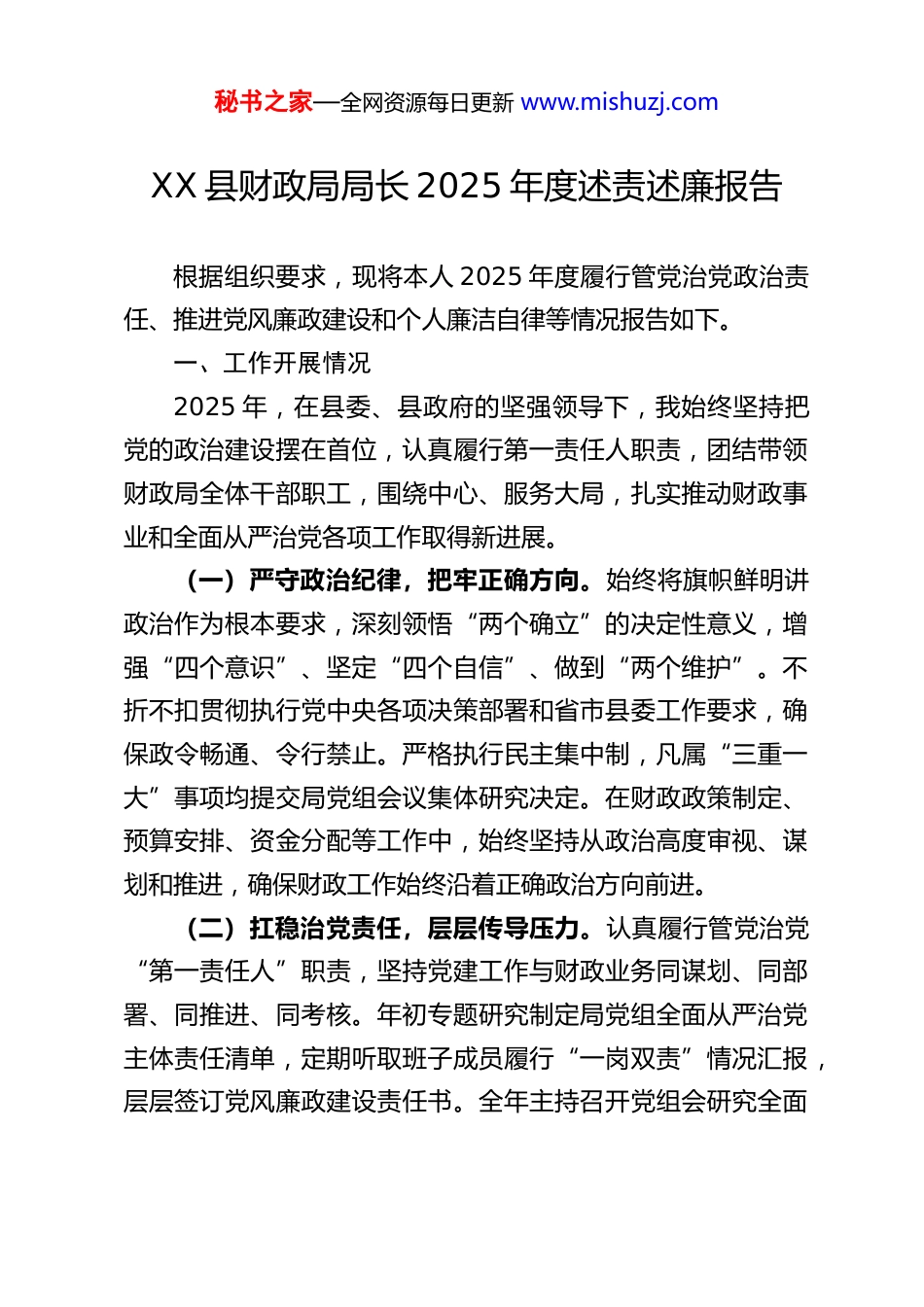 秘书之家—全网资源每日更新 www.mishuzj.comXX 县财政局局长 2025 年度述责述廉报告根据组织要求,现将本人 2025 年度履行管党治党政治责任、推进党风廉政建设和个人廉洁自律等情况报告如下。一、工作开展情况2025 年,在县委、县政府的坚强领导下,我始终坚持把党的政治建设摆在首位,认真履行第一责任人职责,团结带领财政局全体干部职工,围绕中心、服务大局,扎实推动财政事业和全面从严治党各项工作取得新进展。(一)严守政治纪律,把牢正确方向。始终将旗帜鲜明讲政治作为根本要求,深刻领悟“两个确立”的决定性意义,增强“四个意识”、坚定“四个自信”、做到“两个维护”。不折不扣贯彻执行党中央各项决策部署和省市县委工作要求,确保政令畅通、令行禁止。严格执行民主集中制,凡属“三重一大”事项均提交局党组会议集体研究决定。在财政政策制定、预算安排、资金分配等工作中,始终坚持从政治高度审视、谋划和推进,确保财政工作始终沿着正确政治方向前进。(二)扛稳治党责任,层层传导压力。认真履行管党治党“第一责任人”职责,坚持党建工作与财政业务同谋划、同部署、同推进、同考核。年初专题研究制定局党组全面从严治党主体责任清单,定期听取班子成员履行“一岗双责”情况汇报,层层签订党风廉政建设责任书。全年主持召开党组会研究全面秘书之家—全网资源每日更新 www.mishuzj.com从严治党工作 X 次,开展党风廉政建设专题调研 X 次。加强对班子成员和下属单位负责人的教育、管理和监督,常态化开展谈心谈话,对苗头性、倾向性问题及时提醒纠正,推动管党治党责任落地生根。(三)深化廉政建设,筑牢思想防线。将党风廉政建设贯穿财政工作全过程,扎实开展深入贯彻中央八项规定精神学习教育。通过党组理论学习中心组学习、主题党日、廉政党课、专题研讨等多种形式,组织全体干部职工反复学习中央八项规定及其实施细则精神,学习各级纪委通报的违反中央八项规定精神典型案例,观看警示教育片。结合财政实际,重点围绕规范“三公”经费管理、津补贴发放、办公用房、公务接待等方面开展自查自纠和制度完善。学习教育期间,共组织集中学习X 次,专题研讨 X 次,覆盖全体干部职工,引导大家深刻认识“四风”问题的顽固性、反复性,不断增强贯彻落实中央八项规定精神的思想自觉和行动自觉,持续筑牢拒腐防变的思想道德防线。(四)恪守廉洁纪律,保持清廉本色。严格遵守《中国共产党廉洁自律准则》等党纪党规,带头落实领导干部个人有关事项报告制度。坚持以身作则、以上率下,要求别人做到的自己首先做到,禁止别人做的自己坚决不做。在工作中,严格遵守财经纪律和各项规章制度,坚持原则,秉公办事,从未利用职权或职务上的影响为本人、亲属及身边工作人员谋取不正当秘书之家—全网资源每日更新 www.mishuzj.com利益。注重家风建设,管好亲属和身边工作人员,自觉净化社交圈、生活圈、朋友圈,保持清正廉洁的政治本色。(五)抓实意识形态,巩固思想阵地。严格落实意识形态工作责任制,将意识形态工作纳入局党组重要议事日程和党建工作责任制。定期分析研判财政领域意识形态风险点,特别是关注涉及民生资金、财税政策等方面的网络舆情和社会心态。加强财政门户网站、微信公众号等阵地建设和管理,牢牢掌握意识形态工作领导权、管理权、话语权。组织干部职工深入学习党的创新理论,弘扬社会主义核心价值观,确保财政队伍在理想信念、价值理念、道德观念上紧紧团结在一起。(六)狠抓整改落实,做好巡察“后半篇文章”。高度重视县委巡视巡察反馈意见的整改落实工作,将其作为重大政治任务抓紧抓实。对巡察反馈的问题,主动认领、照单全收,牵头制定整改方案,细化整改措施,明确责任领导和完成时限。坚持“当下改”与“长久立”相结合,在集中解决巡察指出具体问题的同时,深入剖析问题根源,举一反三,修订完善了预算管理、内部控制、机关运行等方面制度 X 项,着力构建堵塞漏洞、解决问题的长效机制。截至目前,巡察反馈的 X 个问题已全部整改完成或取得阶段性成效。二、存在的主要问题在总结成绩的同时,对照新时代全面从严治党的新要求...