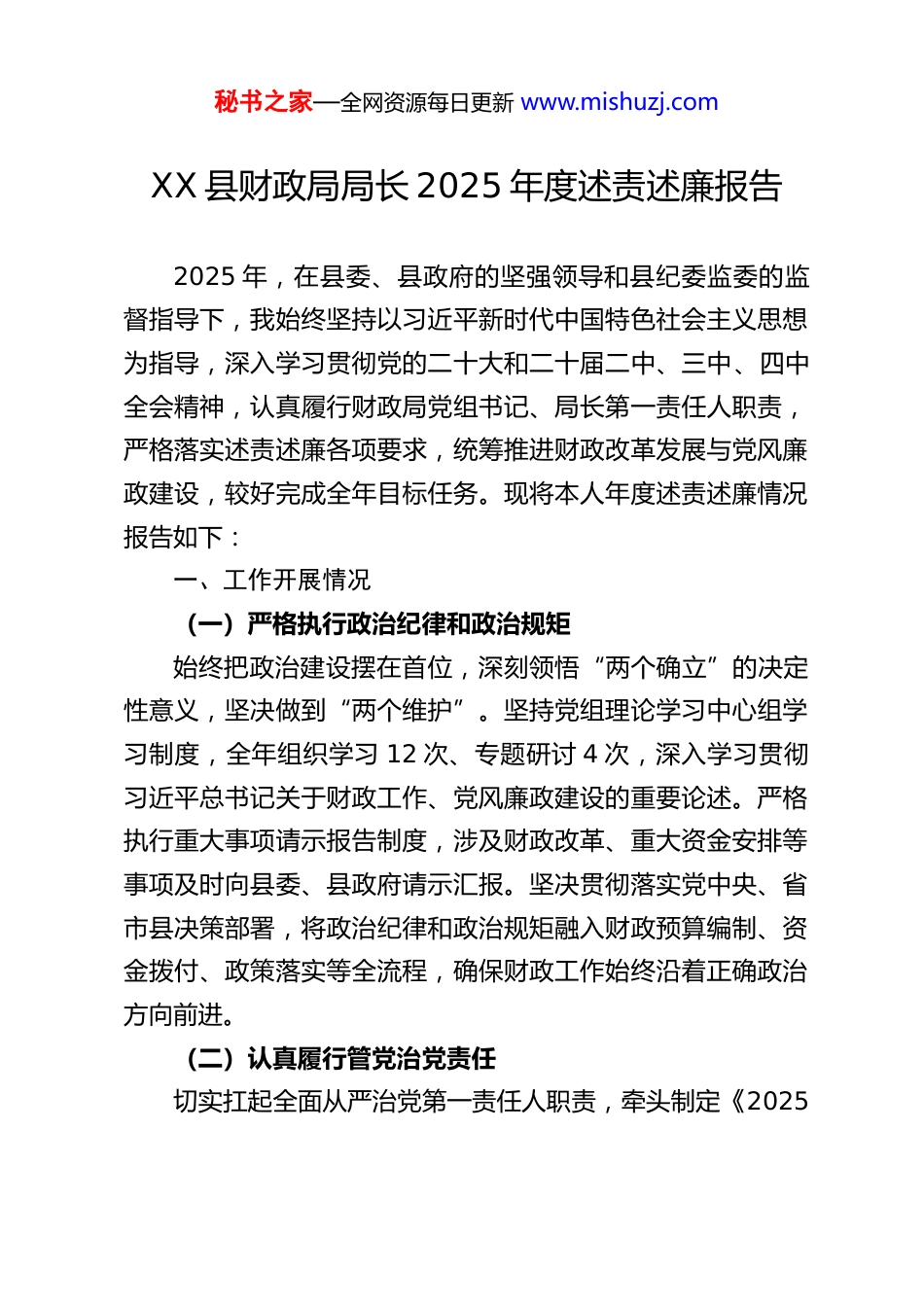 秘书之家—全网资源每日更新 www.mishuzj.comXX 县财政局局长 2025 年度述责述廉报告2025 年,在县委、县政府的坚强领导和县纪委监委的监督指导下,我始终坚持以习近平新时代中国特色社会主义思想为指导,深入学习贯彻党的二十大和二十届二中、三中、四中全会精神,认真履行财政局党组书记、局长第一责任人职责,严格落实述责述廉各项要求,统筹推进财政改革发展与党风廉政建设,较好完成全年目标任务。现将本人年度述责述廉情况报告如下:一、工作开展情况(一)严格执行政治纪律和政治规矩始终把政治建设摆在首位,深刻领悟“两个确立”的决定性意义,坚决做到“两个维护”。坚持党组理论学习中心组学习制度,全年组织学习 12 次、专题研讨 4 次,深入学习贯彻习近平总书记关于财政工作、党风廉政建设的重要论述。严格执行重大事项请示报告制度,涉及财政改革、重大资金安排等事项及时向县委、县政府请示汇报。坚决贯彻落实党中央、省市县决策部署,将政治纪律和政治规矩融入财政预算编制、资金拨付、政策落实等全流程,确保财政工作始终沿着正确政治方向前进。(二)认真履行管党治党责任切实扛起全面从严治党第一责任人职责,牵头制定《2025秘书之家—全网资源每日更新 www.mishuzj.com年县财政局党组全面从严治党主体责任清单》,明确班子成员“一岗双责”。全年主持召开党组会议 20 次,其中专题研究全面从严治党工作 6 次,听取班子成员履责情况汇报 4 次。严格执行民主集中制,完善党组议事规则和决策程序,重大事项坚持集体研究决定。加强基层党组织建设,指导各支部完成换届,开展“三会一课”、主题党日活动等 48 次,推动党建与财政业务深度融合。(三)扎实推进党风廉政建设牵头制定《2025 年县财政局党风廉政建设工作要点》,与各股室、下属单位签订党风廉政建设责任书 28 份,实现责任全覆盖。扎实开展深入贯彻中央八项规定精神学习教育,邀请县纪委监委专家作专题党课,组织学习《深入贯彻中央八项规定精神学习教育学习手册》,开展理论学习中心组扩大研讨1 次、专题交流 3 次中共新闻网。对照中央八项规定精神,组织全局干部职工开展自检自查,梳理问题清单 3 类 18 项,建立整改台账,实行挂账销号上海财政局。常态化开展警示教育,组织观看警示教育片、参观廉政教育基地各 2 次,通报财政系统典型案例 6 起,引导干部职工知敬畏、存戒惧、守底线。(四)带头执行廉洁纪律始终严格要求自己,带头遵守中央八项规定及其实施细则精神,坚决反对“四风”。严格执行廉洁自律各项规定,自觉遵守领导干部个人有关事项报告制度,如实报告个人收入、房秘书之家—全网资源每日更新 www.mishuzj.com产等情况。坚决拒收礼品礼金、有价证券,不接受管理服务对象的宴请和旅游安排。严格管好亲属和身边工作人员,签订家庭助廉承诺书,筑牢家庭廉洁防线。在财政资金分配、项目审批等工作中,坚持原则、秉公办事,不搞优亲厚友、不搞权力寻租。(五)全面落实意识形态工作责任制成立意识形态工作领导小组,制定《2025 年县财政局意识形态工作要点》和责任清单,将意识形态工作纳入党组重要议事日程。全年专题研究意识形态工作 4 次,分析研判财政领域意识形态形势 2 次。加强财政宣传阵地建设,规范管理局官网、微信公众号等平台,发布正面信息 86 条。加强干部职工意识形态教育,组织学习意识形态相关法律法规 3 次,引导干部职工自觉抵制错误思潮,坚决维护意识形态安全。(六)狠抓巡视巡察整改落实对照上级巡视巡察反馈涉及财政领域的 4 类 12 项问题,牵头制定整改方案,明确整改责任、整改措施和整改时限。实行“清单化管理、项目化推进”,建立整改台账,每周调度整改进度。针对“预算管理不够规范”“资金绩效评价不到位”等问题,修订完善预算管理、绩效评价等制度 8 项;针对“基层财政管理薄弱”问题,开展基层财政业务培训 2 次,指导乡镇规范财政管理。目前,12 项问题已全部整改完成,整改成果得到初步巩固。秘书之家—全网资源每日更新 www.mishuzj.com二、存在问题对照县委、县纪委监委的要求和干部群众的期...