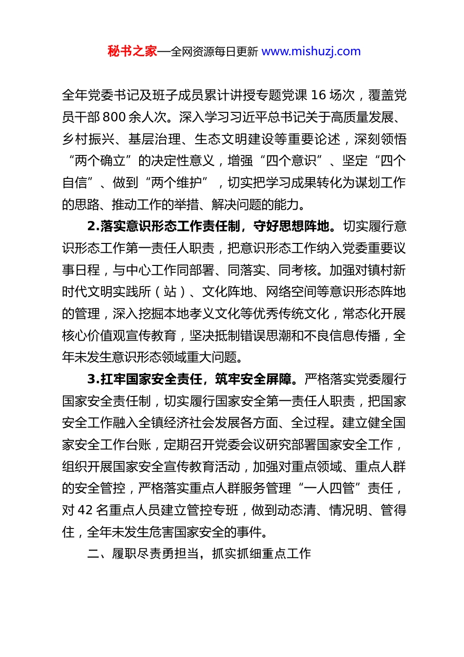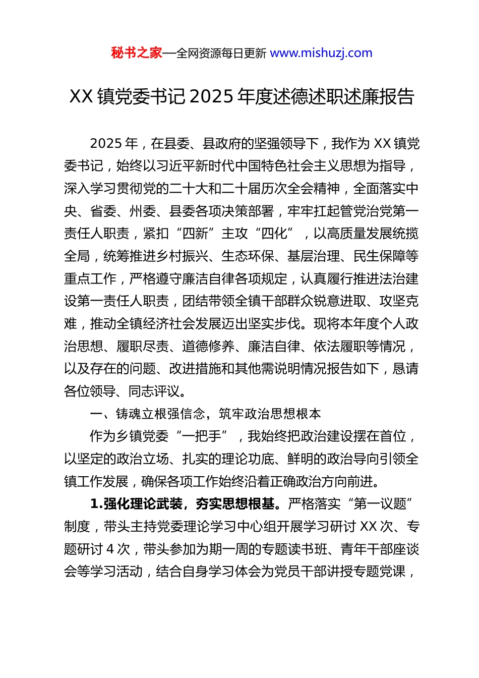 秘书之家—全网资源每日更新 www.mishuzj.comXX 镇党委书记 2025 年度述德述职述廉报告2025 年,在县委、县政府的坚强领导下,我作为 XX 镇党委书记,始终以习近平新时代中国特色社会主义思想为指导,深入学习贯彻党的二十大和二十届历次全会精神,全面落实中央、省委、州委、县委各项决策部署,牢牢扛起管党治党第一责任人职责,紧扣“四新”主攻“四化”,以高质量发展统揽全局,统筹推进乡村振兴、生态环保、基层治理、民生保障等重点工作,严格遵守廉洁自律各项规定,认真履行推进法治建设第一责任人职责,团结带领全镇干部群众锐意进取、攻坚克难,推动全镇经济社会发展迈出坚实步伐。现将本年度个人政治思想、履职尽责、道德修养、廉洁自律、依法履职等情况,以及存在的问题、改进措施和其他需说明情况报告如下,恳请各位领导、同志评议。一、铸魂立根强信念,筑牢政治思想根本作为乡镇党委“一把手”,我始终把政治建设摆在首位,以坚定的政治立场、扎实的理论功底、鲜明的政治导向引领全镇工作发展,确保各项工作始终沿着正确政治方向前进。1.强化理论武装,夯实思想根基。严格落实“第一议题”制度,带头主持党委理论学习中心组开展学习研讨 XX 次、专题研讨 4 次,带头参加为期一周的专题读书班、青年干部座谈会等学习活动,结合自身学习体会为党员干部讲授专题党课,秘书之家—全网资源每日更新 www.mishuzj.com全年党委书记及班子成员累计讲授专题党课 16 场次,覆盖党员干部 800 余人次。深入学习习近平总书记关于高质量发展、乡村振兴、基层治理、生态文明建设等重要论述,深刻领悟“两个确立”的决定性意义,增强“四个意识”、坚定“四个自信”、做到“两个维护”,切实把学习成果转化为谋划工作的思路、推动工作的举措、解决问题的能力。2.落实意识形态工作责任制,守好思想阵地。切实履行意识形态工作第一责任人职责,把意识形态工作纳入党委重要议事日程,与中心工作同部署、同落实、同考核。加强对镇村新时代文明实践所(站)、文化阵地、网络空间等意识形态阵地的管理,深入挖掘本地孝义文化等优秀传统文化,常态化开展核心价值观宣传教育,坚决抵制错误思潮和不良信息传播,全年未发生意识形态领域重大问题。3.扛牢国家安全责任,筑牢安全屏障。严格落实党委履行国家安全责任制,切实履行国家安全第一责任人职责,把国家安全工作融入全镇经济社会发展各方面、全过程。建立健全国家安全工作台账,定期召开党委会议研究部署国家安全工作,组织开展国家安全宣传教育活动,加强对重点领域、重点人群的安全管控,严格落实重点人群服务管理“一人四管”责任,对 42 名重点人员建立管控专班,做到动态清、情况明、管得住,全年未发生危害国家安全的事件。二、履职尽责勇担当,抓实抓细重点工作秘书之家—全网资源每日更新 www.mishuzj.com2025 年,我紧扣县委、县政府部署要求,持续深化“三个年”活动,全力打好“八场硬仗”,确保完成“八个攻坚突破”年度重点任务,统筹推进各项重点工作落地见效,切实把党委的领导核心作用体现在发展各环节。(一)从严管党治党,压实党建主体责任1.建强基层组织堡垒。深入实施基层党组织“分类指导、争先进位”三年行动,推动社区党支部和钟林村党支部晋级为一类党支部,完成悬鼓村软弱涣散党组织半年集中整顿,全面增强基层党组织组织功能。全年举办 3 场党建实务、产业发展、治理创新“擂台比武”,激发 12 个村和 2 个社区党组织书记干事创业热情。严格落实《推进领导干部能上能下规定》,高标准推进村(社区)“两委”换届人选推选工作,66 名初步人选结构优化、能力提升,大专及以上学历占比 38%,平均年龄降至 45 岁,40 岁以下年轻干部和女性委员数量分别增加 15人和 5 人,打造了一支老中青合理搭配的基层干部队伍。2.深化作风建设,整治形式主义为基层减负。扎实开展深入贯彻中央八项规定精神学习教育活动,组织全镇干部深入学习中央八项规定及其实施细则精神,对照要求开展自查自纠,坚决纠治“四风”问题。持续整治形式主义为基层减负,精简文件会议数量,规范督查检查考核频次...