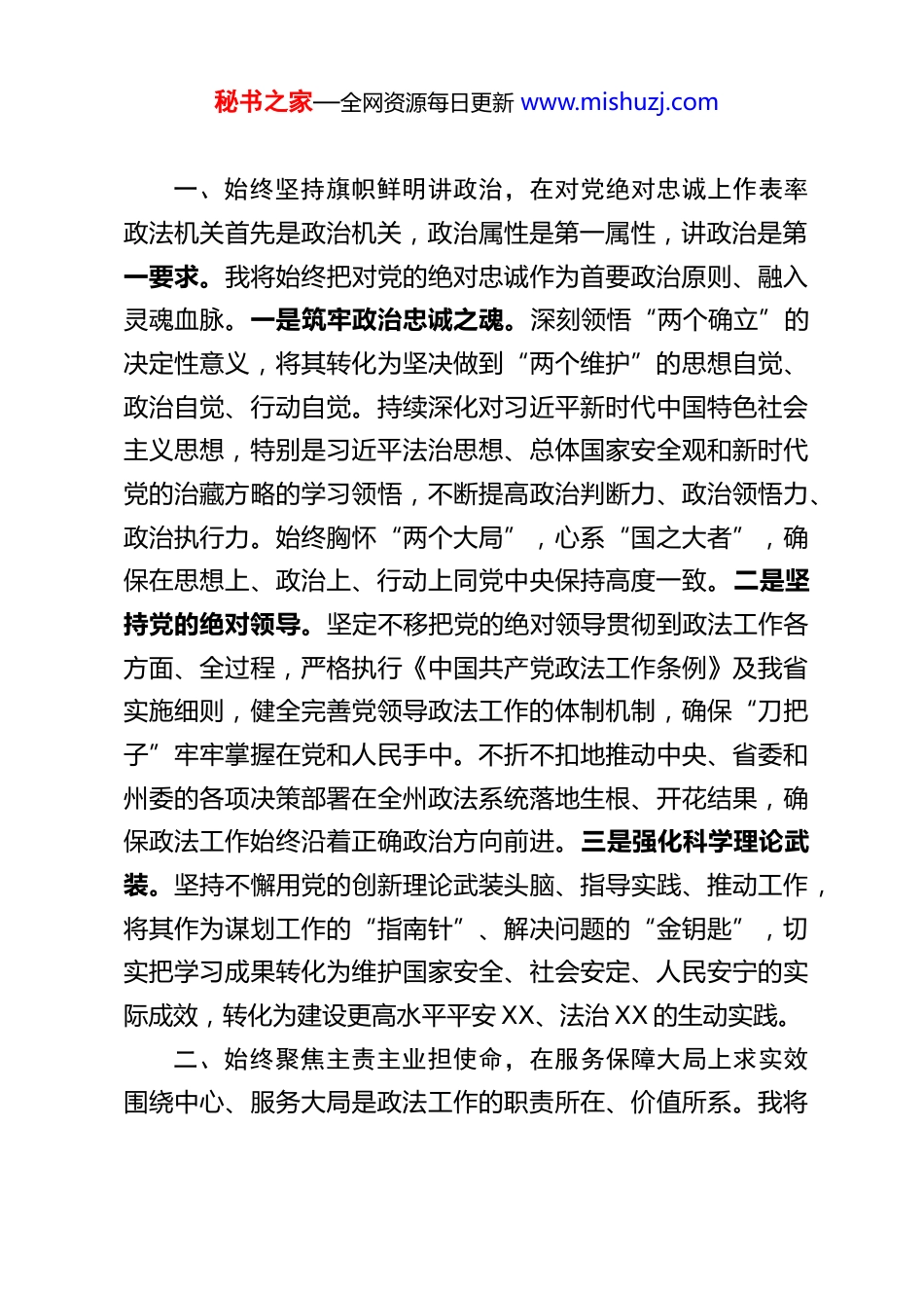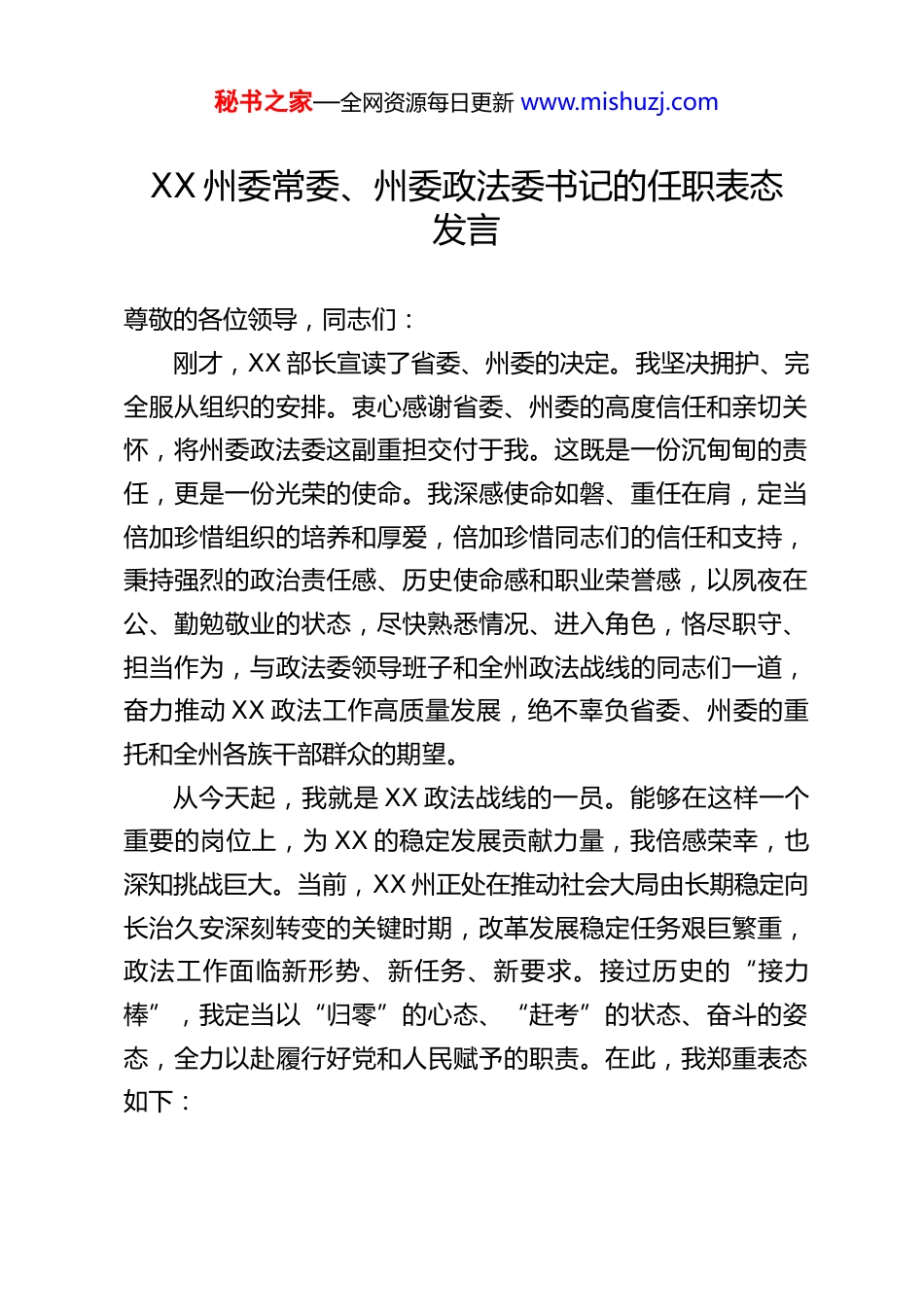 秘书之家—全网资源每日更新 www.mishuzj.comXX 州委常委、州委政法委书记的任职表态发言尊敬的各位领导,同志们:刚才,XX 部长宣读了省委、州委的决定。我坚决拥护、完全服从组织的安排。衷心感谢省委、州委的高度信任和亲切关怀,将州委政法委这副重担交付于我。这既是一份沉甸甸的责任,更是一份光荣的使命。我深感使命如磐、重任在肩,定当倍加珍惜组织的培养和厚爱,倍加珍惜同志们的信任和支持,秉持强烈的政治责任感、历史使命感和职业荣誉感,以夙夜在公、勤勉敬业的状态,尽快熟悉情况、进入角色,恪尽职守、担当作为,与政法委领导班子和全州政法战线的同志们一道,奋力推动 XX 政法工作高质量发展,绝不辜负省委、州委的重托和全州各族干部群众的期望。从今天起,我就是 XX 政法战线的一员。能够在这样一个重要的岗位上,为 XX 的稳定发展贡献力量,我倍感荣幸,也深知挑战巨大。当前,XX 州正处在推动社会大局由长期稳定向长治久安深刻转变的关键时期,改革发展稳定任务艰巨繁重,政法工作面临新形势、新任务、新要求。接过历史的“接力棒”,我定当以“归零”的心态、“赶考”的状态、奋斗的姿态,全力以赴履行好党和人民赋予的职责。在此,我郑重表态如下:秘书之家—全网资源每日更新 www.mishuzj.com一、始终坚持旗帜鲜明讲政治,在对党绝对忠诚上作表率政法机关首先是政治机关,政治属性是第一属性,讲政治是第一要求。我将始终把对党的绝对忠诚作为首要政治原则、融入灵魂血脉。一是筑牢政治忠诚之魂。深刻领悟“两个确立”的决定性意义,将其转化为坚决做到“两个维护”的思想自觉、政治自觉、行动自觉。持续深化对习近平新时代中国特色社会主义思想,特别是习近平法治思想、总体国家安全观和新时代党的治藏方略的学习领悟,不断提高政治判断力、政治领悟力、政治执行力。始终胸怀“两个大局”,心系“国之大者”,确保在思想上、政治上、行动上同党中央保持高度一致。二是坚持党的绝对领导。坚定不移把党的绝对领导贯彻到政法工作各方面、全过程,严格执行《中国共产党政法工作条例》及我省实施细则,健全完善党领导政法工作的体制机制,确保“刀把子”牢牢掌握在党和人民手中。不折不扣地推动中央、省委和州委的各项决策部署在全州政法系统落地生根、开花结果,确保政法工作始终沿着正确政治方向前进。三是强化科学理论武装。坚持不懈用党的创新理论武装头脑、指导实践、推动工作,将其作为谋划工作的“指南针”、解决问题的“金钥匙”,切实把学习成果转化为维护国家安全、社会安定、人民安宁的实际成效,转化为建设更高水平平安 XX、法治 XX 的生动实践。二、始终聚焦主责主业担使命,在服务保障大局上求实效围绕中心、服务大局是政法工作的职责所在、价值所系。我将秘书之家—全网资源每日更新 www.mishuzj.com紧扣推动高质量发展这个主题,完整、准确、全面贯彻新发展理念,积极主动服务和融入新发展格局,找准政法工作与全州中心工作的结合点和着力点。一是坚决维护国家政治安全和社会稳定。坚定不移贯彻新时代党的治藏方略,始终保持高度警惕,紧盯 XX 面临的主要矛盾和特殊矛盾,下好先手棋、打好主动仗。深入推进反分裂反渗透反颠覆斗争,依法严厉打击各类渗透破坏颠覆活动。强化风险研判预警,健全完善应急处置机制,有效防范化解政治、经济、社会、意识形态等各领域风险,牢牢守住不发生系统性风险的底线。在大是大非面前旗帜鲜明、立场坚定,在风险挑战面前敢于斗争、善于斗争,坚决捍卫国家政治安全,确保全州社会大局持续和谐稳定,为实现长治久安打下坚实基础。二是全力建设更高水平的平安 XX。坚持以人民安全为宗旨,以提升人民群众安全感满意度为目标,常态化推进扫黑除恶斗争,依法严厉打击整治电信网络诈骗、跨境赌博、盗抢骗、黄赌毒、食药环等突出违法犯罪,保持严打高压态势。加快推进市域社会治理现代化试点工作,坚持和发展新时代“枫桥经验”,完善矛盾纠纷多元预防调处化解综合机制,努力将矛盾化解在基层、化解在萌芽状态。强化社会治安整体防控,健全公共安全隐患排查和安全预防控制体系,切实保障人民群众生...