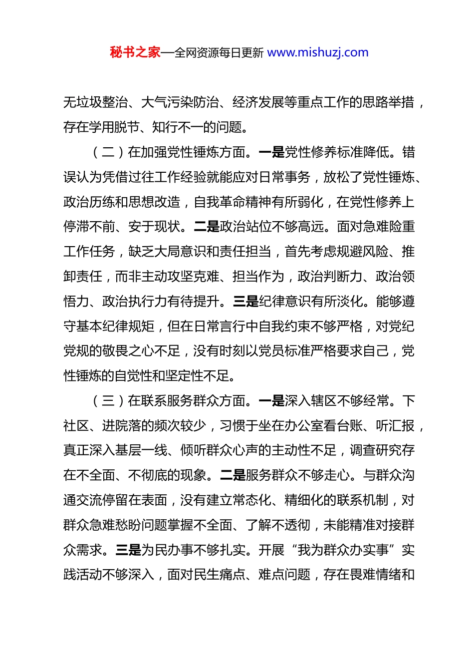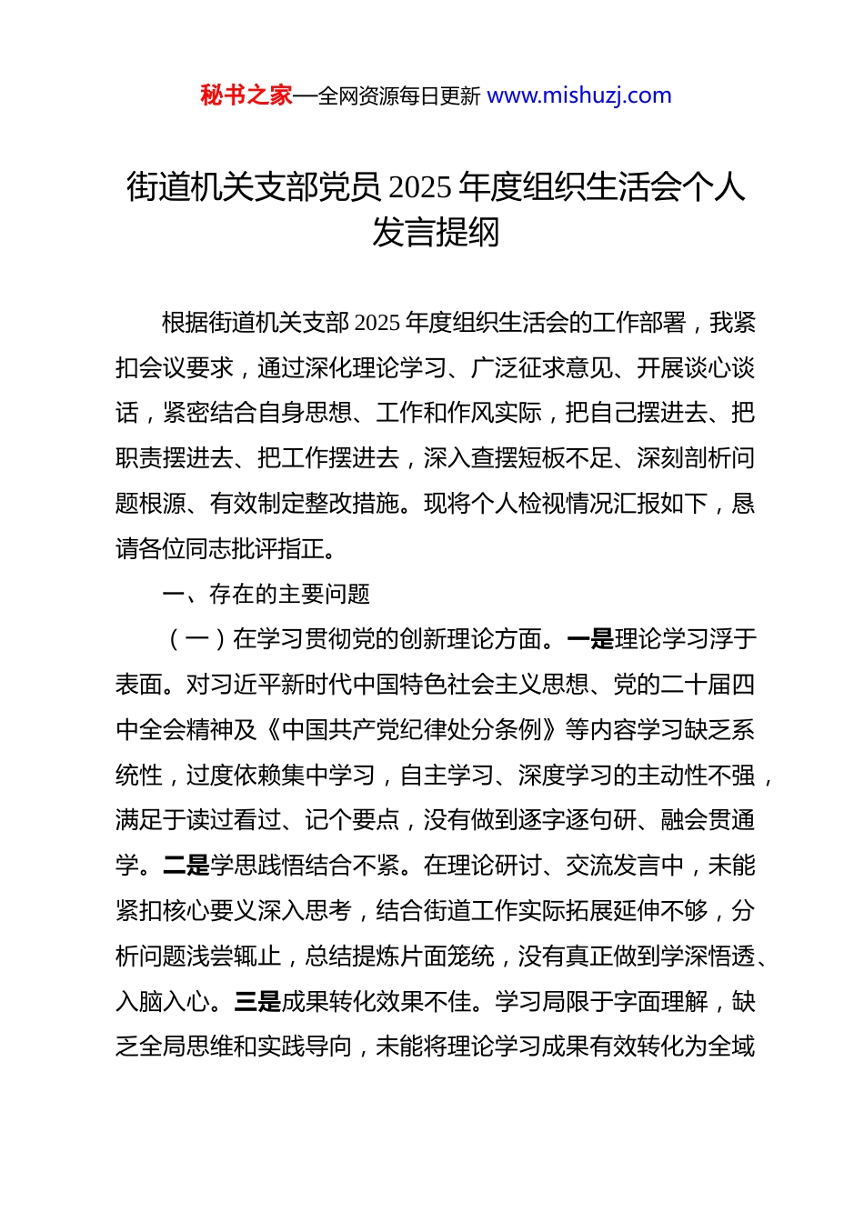秘书之家—全网资源每日更新 www.mishuzj.com街道机关支部党员 2025 年度组织生活会个人发言提纲 根据街道机关支部 2025 年度组织生活会的工作部署,我紧扣会议要求,通过深化理论学习、广泛征求意见、开展谈心谈话,紧密结合自身思想、工作和作风实际,把自己摆进去、把职责摆进去、把工作摆进去,深入查摆短板不足、深刻剖析问题根源、有效制定整改措施。现将个人检视情况汇报如下,恳请各位同志批评指正。一、存在的主要问题(一)在学习贯彻党的创新理论方面。一是理论学习浮于表面。对习近平新时代中国特色社会主义思想、党的二十届四中全会精神及《中国共产党纪律处分条例》等内容学习缺乏系统性,过度依赖集中学习,自主学习、深度学习的主动性不强,满足于读过看过、记个要点,没有做到逐字逐句研、融会贯通学。二是学思践悟结合不紧。在理论研讨、交流发言中,未能紧扣核心要义深入思考,结合街道工作实际拓展延伸不够,分析问题浅尝辄止,总结提炼片面笼统,没有真正做到学深悟透、入脑入心。三是成果转化效果不佳。学习局限于字面理解,缺乏全局思维和实践导向,未能将理论学习成果有效转化为全域秘书之家—全网资源每日更新 www.mishuzj.com无垃圾整治、大气污染防治、经济发展等重点工作的思路举措,存在学用脱节、知行不一的问题。(二)在加强党性锤炼方面。一是党性修养标准降低。错误认为凭借过往工作经验就能应对日常事务,放松了党性锤炼、政治历练和思想改造,自我革命精神有所弱化,在党性修养上停滞不前、安于现状。二是政治站位不够高远。面对急难险重工作任务,缺乏大局意识和责任担当,首先考虑规避风险、推卸责任,而非主动攻坚克难、担当作为,政治判断力、政治领悟力、政治执行力有待提升。三是纪律意识有所淡化。能够遵守基本纪律规矩,但在日常言行中自我约束不够严格,对党纪党规的敬畏之心不足,没有时刻以党员标准严格要求自己,党性锤炼的自觉性和坚定性不足。(三)在联系服务群众方面。一是深入辖区不够经常。下社区、进院落的频次较少,习惯于坐在办公室看台账、听汇报,真正深入基层一线、倾听群众心声的主动性不足,调查研究存在不全面、不彻底的现象。二是服务群众不够走心。与群众沟通交流停留在表面,没有建立常态化、精细化的联系机制,对群众急难愁盼问题掌握不全面、了解不透彻,未能精准对接群众需求。三是为民办事不够扎实。开展“我为群众办实事”实践活动不够深入,面对民生痛点、难点问题,存在畏难情绪和秘书之家—全网资源每日更新 www.mishuzj.com被动应付心态,主动破解难题、办好民生实事的力度不足,服务群众的能力和水平有待提升。(四)在发挥先锋模范作用方面。一是履职尽责意识薄弱。工作中安于现状、不思进取,缺乏争先进位的劲头,满足于完成常规工作,主动为街道发展建言献策、贡献力量的积极性不高。二是攻坚克难锐气不足。在大气污染防治、环境整治、基层治理等重点工作中,缺乏抓铁有痕、踏石留印的魄力,面对复杂问题和矛盾纠纷,存在本领恐慌,不敢啃硬骨头、不愿涉险滩。三是示范带头作用弱化。作为机关党员,传帮带作用发挥不充分,工作思路保守、方法陈旧,缺乏创新突破意识,在同事中没有树立起标杆榜样,先锋模范作用彰显不足。(五)在改作风树新风方面。一是工作作风浮躁敷衍。对待包联社区工作缺乏较真碰硬的态度,重痕迹、轻实效,对基层工作的实际困难和问题排查不深、整改不实,形式主义问题仍有残留。二是斗争精神有所缺失。面对工作中的不良现象、深层次矛盾问题,存在“老好人”思想,睁一只眼闭一只眼,不愿较真、不敢亮剑,自我监督、自我约束的力度不够。三是纪律执行不够刚性。虽然能够遵守各项规章制度,但执行标准不高、要求不严,存在“松口气、歇歇脚”的懈怠思想,工作韧劲不足,作风建设常态化长效化坚持得不够好。秘书之家—全网资源每日更新 www.mishuzj.com(六)深入贯彻中央八项规定精神学习教育开展情况及问题整改情况。始终坚持把中央八项规定及其实施细则精神作为刚性约束,积极参加廉政学习、警示教育、法治培训,严守纪律规矩。坚决反对形式主义、官僚主义,抓实...