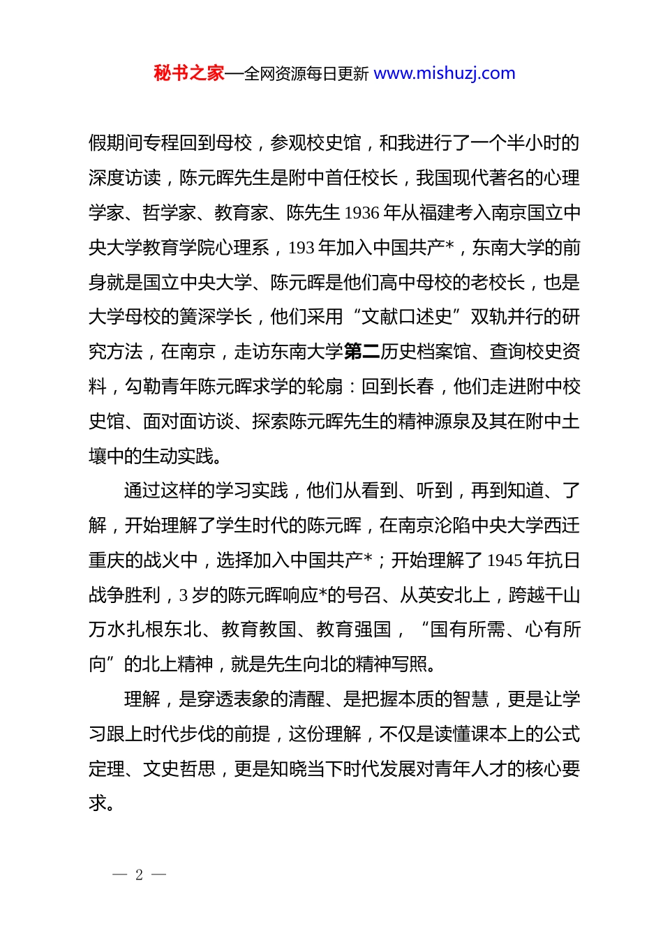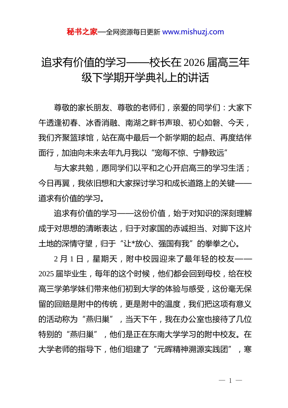 秘书之家—全网资源每日更新 www.mishuzj.com追求有价值的学习——校长在 2026 届高三年级下学期开学典礼上的讲话尊敬的家长朋友、尊敬的老师们,亲爱的同学们:大家下午透逢初春、冰香消融、南湖之畔书声琅、初心如磐、今天,我们齐聚篮球馆,站在高中最后一个新学期的起点、再度结伴面行,加油向未来去年九月我以“宠每不惊、宁静致远”与大家共勉,愿同学们以平和之心开启高三的学习生活;今日再翼,我依旧想和大家探讨学习和成长道路上的关键——道求有价值的学习。追求有价值的学习——这份价值,始于对知识的深刻理解成于对思想的清晰表达,归于对家国的赤诚担当、对脚下这片土地的深情守望,归于“让*放心、强国有我”的拳拳之心。2 月 1 日,星期天,附中校园迎来了最年轻的校友——2025 届毕业生,每年的这个时候,他们都会回到母校,给在校高三学弟学妹们带来他们初到大学的体验与感受,这份毫无保留的回赔是附中的传统,更是附中的温度,我们把这项有意义的活动称为“燕归巢”,当天下午,我在办公室也接待了几位特别的“燕归巢”,他们是正在东南大学学习的附中校友。在大学老师的指导下,他们组建了“元晖精神溯源实践团”,寒— 1 —秘书之家—全网资源每日更新 www.mishuzj.com假期间专程回到母校,参观校史馆,和我进行了一个半小时的深度访读,陈元晖先生是附中首任校长,我国现代著名的心理学家、哲学家、教育家、陈先生 1936 年从福建考入南京国立中央大学教育学院心理系,193 年加入中国共产*,东南大学的前身就是国立中央大学、陈元晖是他们高中母校的老校长,也是大学母校的簧深学长,他们采用“文献口述史”双轨并行的研究方法,在南京,走访东南大学第二历史档案馆、查询校史资料,勾勒青年陈元晖求学的轮扇:回到长春,他们走进附中校史馆、面对面访谈、探索陈元晖先生的精神源泉及其在附中土壤中的生动实践。通过这样的学习实践,他们从看到、听到,再到知道、了解,开始理解了学生时代的陈元晖,在南京沦陷中央大学西迁重庆的战火中,选择加入中国共产*;开始理解了 1945 年抗日战争胜利,3 岁的陈元晖响应*的号召、从英安北上,跨越干山万水扎根东北、教育教国、教育强国,“国有所需、心有所向”的北上精神,就是先生向北的精神写照。理解,是穿透表象的清醒、是把握本质的智慧,更是让学习跟上时代步伐的前提,这份理解,不仅是读懂课本上的公式定理、文史哲思,更是知晓当下时代发展对青年人才的核心要求。— 2 —秘书之家—全网资源每日更新 www.mishuzj.com追求有价值的学习,首先要做到真正的理解。2022 届校友,正在清华大学求真书院学习数学的王涵校友,本科四年级的他就在数学顶级期刊发表学术论文,他在介绍数学学习经验时,特别强调,如果做完一道題就只是会做了这道題目,是效率低下的。在解决问题的过程中,更重要的是理解,抽象出这个解决方案背后的思想,使用这个方法的动机是什么?还有哪些同类问题也是被这样解决的?多追问本质和原因,并且尝试从自己的认识给出回签,这个过程的收获是要超过单纯学会这一题目的,经常性的追问,你就会慢慢加深自己的认识、真正把某一种方法理解、运用自如,在人工智能时代,理解对人类更为重要。英国哲学家、教育家怀特海在《教育的目的》一书中讲:“教一分钟一分钟、一小时一小时、一天一天地耐心地掌握育是细节的过程、不存在一条灿烂的概括铺成的空中过道通往学问的教有的问题就在于使学生通过树木而见到森林。”高三捷径提知识曾后的时价值,让每一灰理解、都成为向真理靠进、商时代看齐的过程。道求有价值的学习,还需要用表达,表达,是理解的外在现,是思维的二次锤炼、更是新时代青年传递声音、凝聚力量的核心能力、今天的表达,早已不再局限于课堂发言、笔尖书— 3 —秘书之家—全网资源每日更新 www.mishuzj.com写,它可以是用 ai 工具呈现的研究成果,是在跨学科交流中碰撞的思想火花,是将个人理想融入国家战略的深情各白,更是在国际舞台上讲递中国故事的自信发声。“把个人的梦想融入时代的洪流。才能让知识的光芒照亮前行的道路。”这便是最动人的时代表达...