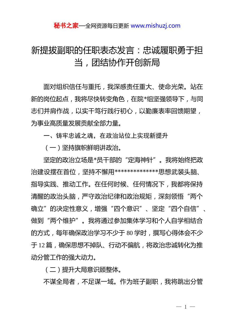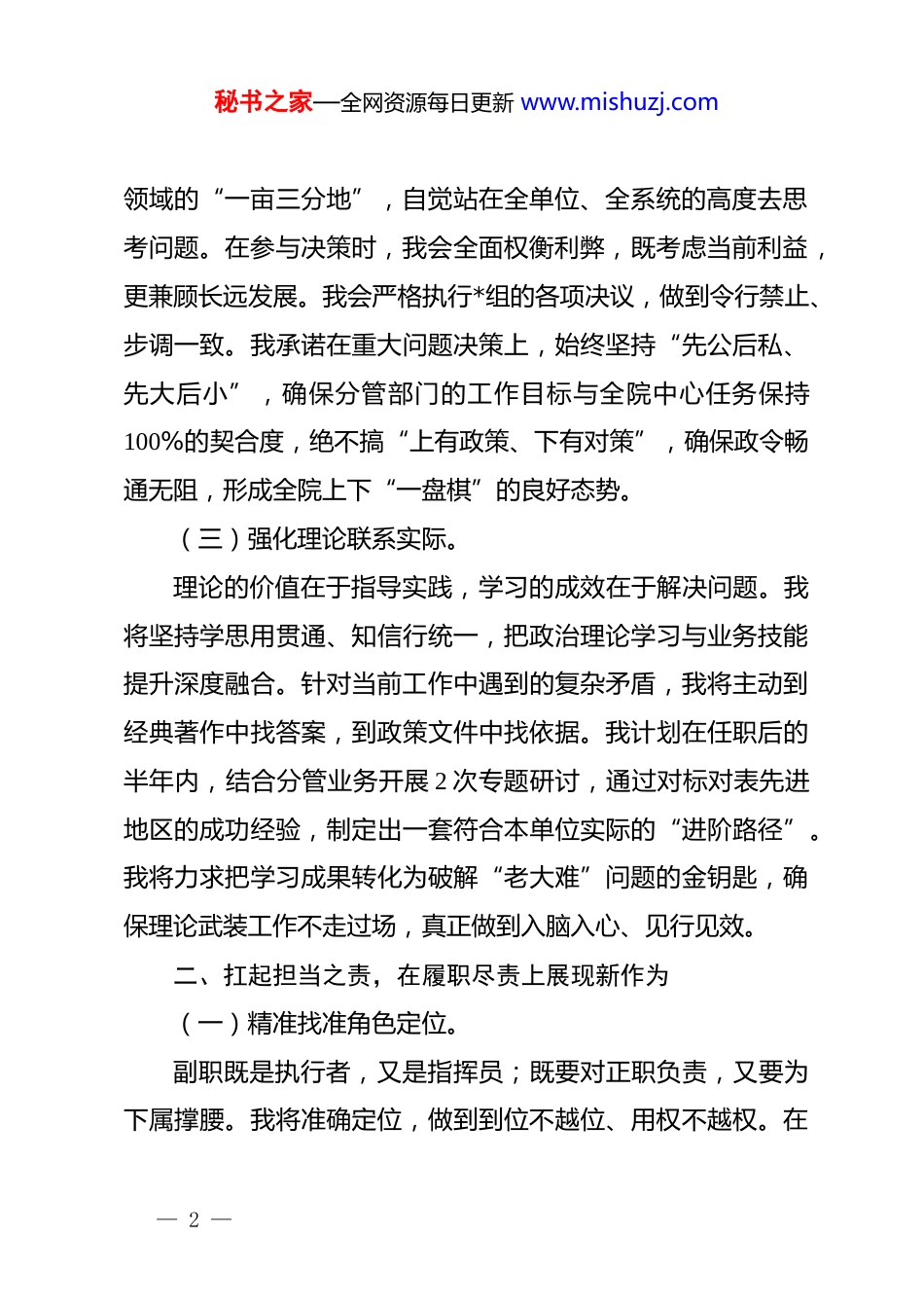 秘书之家—全网资源每日更新 www.mishuzj.com新提拔副职的任职表态发言:忠诚履职勇于担当,团结协作开创新局面对组织信任与重托,我深感责任重大、使命光荣。站在新的岗位起点,我将尽快转变角色,在院*组坚强领导下,与同志们并肩作战,以实干笃行践行初心,以勤廉表率回馈期望,为事业高质量发展贡献全部力量。一、铸牢忠诚之魂,在政治站位上实现新提升(一)坚持旗帜鲜明讲政治。坚定的政治立场是*员干部的“定海神针”。我将始终把政治建设摆在首位,坚持不懈用**************思想武装头脑、指导实践、推动工作。在任何时候、任何情况下,我都将保持清醒的政治头脑,严守政治纪律和政治规矩,深刻领悟“两个确立”的决定性意义,增强“四个意识”、坚定“四个自信”、做到“两个维护”。我将通过参加集体学习和个人自学相结合的方式,每年确保政治学习不少于 80 学时,撰写心得体会不少于 12 篇,确保思想不掉队、行动不偏航,将政治忠诚转化为推动分管工作的强大动力。(二)提升大局意识顾整体。不谋全局者,不足谋一域。作为班子副职,我将跳出分管— 1 —秘书之家—全网资源每日更新 www.mishuzj.com领域的“一亩三分地”,自觉站在全单位、全系统的高度去思考问题。在参与决策时,我会全面权衡利弊,既考虑当前利益,更兼顾长远发展。我会严格执行*组的各项决议,做到令行禁止、步调一致。我承诺在重大问题决策上,始终坚持“先公后私、先大后小”,确保分管部门的工作目标与全院中心任务保持100%的契合度,绝不搞“上有政策、下有对策”,确保政令畅通无阻,形成全院上下“一盘棋”的良好态势。(三)强化理论联系实际。理论的价值在于指导实践,学习的成效在于解决问题。我将坚持学思用贯通、知信行统一,把政治理论学习与业务技能提升深度融合。针对当前工作中遇到的复杂矛盾,我将主动到经典著作中找答案,到政策文件中找依据。我计划在任职后的半年内,结合分管业务开展 2 次专题研讨,通过对标对表先进地区的成功经验,制定出一套符合本单位实际的“进阶路径”。我将力求把学习成果转化为破解“老大难”问题的金钥匙,确保理论武装工作不走过场,真正做到入脑入心、见行见效。二、扛起担当之责,在履职尽责上展现新作为(一)精准找准角色定位。副职既是执行者,又是指挥员;既要对正职负责,又要为下属撑腰。我将准确定位,做到到位不越位、用权不越权。在— 2 —秘书之家—全网资源每日更新 www.mishuzj.com工作中,我会积极当好正职的参谋助手,做到“出谋划策不独断、协调各方不推诿”。我会主动承担起分管领域的“领头羊”责任,对于急难险重任务,做到第一个顶上去。我计划在接下来的 100 天内,开展“岗位大调研”活动,对分管科室的每一个岗位职责进行重新梳理,通过优化业务流程,力争将日常办公审批时限缩短 20%以上,确保各项指令在分管范围内得到高效闭环执行。(二)攻坚克难破除瓶颈。面对事业发展中的“硬骨头”,我将发扬钉钉子精神,一锤接着一锤敲。当前,我们面临着数据整合难度大、基层反馈渠道不畅等现实困境。我计划建立一个“问题直报台账”,针对基层反映强烈的 15 项高频诉求,实行挂牌督办,明确责任到人、时限到天。我将坚持“一线工作法”,每周至少抽出 2 天时间下沉到基层站点,面对面听取一线职工的意见建议。通过开展“揭榜挂帅”行动,鼓励分管科室的技术骨干对核心难题进行技术攻关,力争在年度终了前,将制约业务增长的瓶颈问题解决率提升至 95%以上。(三)追求卓越提升能级。平庸就是退步,慢进也是落后。我将把“创一流、争第一”作为工作准则,拒绝按部就班,提倡精益求精。在服务群— 3 —秘书之家—全网资源每日更新 www.mishuzj.com众和企业方面,我将推动“一网通办”深度延伸,力争实现政务服务事项的“秒批秒办”覆盖率达到 60%。我将建立分管领域的绩效考核末位淘汰机制,用数据说话,凭实绩论英雄。我将对标行业最高标准,每年至少策划实施 2 个具有示范引领作用的“标杆项目”,通过以点带面,带动全系统服务质量实现质的飞跃,让“追求卓越”成为分管队伍的基因色彩和精神底色。三...