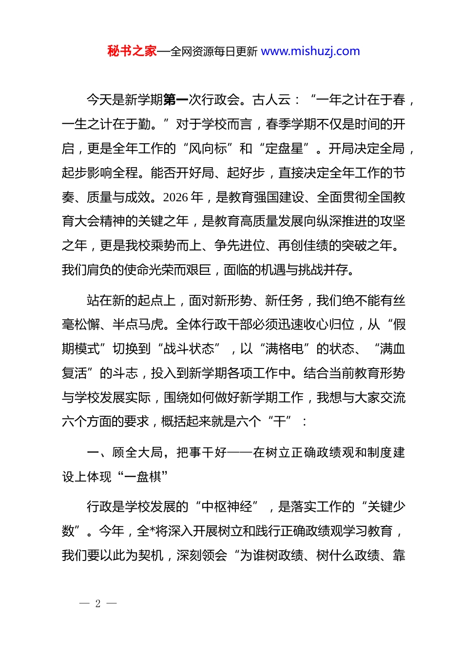秘书之家—全网资源每日更新 www.mishuzj.com在 2026 年春季开学行政干部会议上的讲话:策马扬鞭实干笃行各位同仁:大家上午好!“律回岁晚冰霜少,春到人间草木知。”伴随着春回大地、万象更新的蓬勃生机,我们迎来了 2026 年春季新学期。在这充满希望的美好时节,首先向大家拜个晚年!祝大家在新的一年里,身体康健如骏马奔腾,事业兴旺似马跃千山,家庭和睦若春风拂面!也祝我们的学校:骐骥驰骋势不可挡!刚刚过去的春节假期,大家暂时放下了繁重的工作,与家人共享天伦之乐,休整疲惫的身心。但我深知,很多同志即便是在阖家团圆的时刻,依然心系学校发展,牵挂分管工作,利用假期时间思考谋划、提前布局,更有工会组织线下春节慰问,财务上按中心通知随时报帐,值班及时在岗。在此,我向大家恪尽职守、担当作为、攻坚克难的辛勤付出,表示最衷心的感谢!正是因为有你们这支“铁军”队伍,学校才能在高质量发展的征程中蹄疾步稳、行稳致远。— 1 —秘书之家—全网资源每日更新 www.mishuzj.com今天是新学期第一次行政会。古人云:“一年之计在于春,一生之计在于勤。”对于学校而言,春季学期不仅是时间的开启,更是全年工作的“风向标”和“定盘星”。开局决定全局,起步影响全程。能否开好局、起好步,直接决定全年工作的节奏、质量与成效。2026 年,是教育强国建设、全面贯彻全国教育大会精神的关键之年,是教育高质量发展向纵深推进的攻坚之年,更是我校乘势而上、争先进位、再创佳绩的突破之年。我们肩负的使命光荣而艰巨,面临的机遇与挑战并存。站在新的起点上,面对新形势、新任务,我们绝不能有丝毫松懈、半点马虎。全体行政干部必须迅速收心归位,从“假期模式”切换到“战斗状态”,以“满格电”的状态、“满血复活”的斗志,投入到新学期各项工作中。结合当前教育形势与学校发展实际,围绕如何做好新学期工作,我想与大家交流六个方面的要求,概括起来就是六个“干”:一、顾全大局,把事干好——在树立正确政绩观和制度建设上体现“一盘棋”行政是学校发展的“中枢神经”,是落实工作的“关键少数”。今年,全*将深入开展树立和践行正确政绩观学习教育,我们要以此为契机,深刻领会“为谁树政绩、树什么政绩、靠— 2 —秘书之家—全网资源每日更新 www.mishuzj.com什么树政绩”的核心要义。大家不能只盯着自己部门的“一亩三分地”,更要胸怀学校发展“一盘棋”的大局意识。什么叫“把事干好”?就是要坚决破除部门壁垒,主动沟通配合。教学部门在安排课程、组织教研时,要主动与后勤部门沟通,充分考虑设备设施保障能力;德育部门在策划学生活动时,要紧密衔接教学节奏,避免时间冲突、资源浪费。同时,我们要把“完善制度”作为“把事干好”的保障,全面梳理现有规章制度,查漏补缺,优化流程,确保各项工作在制度的轨道上规范运行、高效协同,营造出“全校一盘棋、上下一条心”的和谐奋进氛围。二、克服困难,把事干成——在狠抓统招和提升质量上展现“硬担当”“路虽远,行则将至;事虽难,做则必成。”新的一年,我们面临的挑战依然严峻,特别是“狠抓统招”和“提升教育质量”这两块硬骨头,直接关系到学校的生存与发展。生源结构变化、竞争日趋激烈,教育教学面临新的课题;在“双减”背景下,课堂提质增效压力加大。这些困难都是客观存在的,绕不开、躲不过、推不掉,关键看我们敢不敢扛、能不能破、会不会干。— 3 —秘书之家—全网资源每日更新 www.mishuzj.com行政干部就是学校攻坚克难的主力军、先锋队。面对招生难题,要拿出逢山开路、遇水架桥的闯劲,精准研判形势,创新宣传方式,确保生源质量稳中有进。面对质量提升,要有钉钉子、一抓到底的韧劲,深化课堂教学改革,强化质量监测与分析,确保教育教学质量持续攀升。我们要以不达目的不罢休的决心,把难事办成、把要事干成,确保全年目标任务的圆满完成。三、勇于创新,把事干新——在特色课后服务上打造“新品牌”“苟日新,日日新,又日新。”教育发展日新月异,守成没有出路,创新方得突破。新学期,全校上下要在“新”字上求突破、在“特”字上做文章,让创新成为学校发展的最强引...