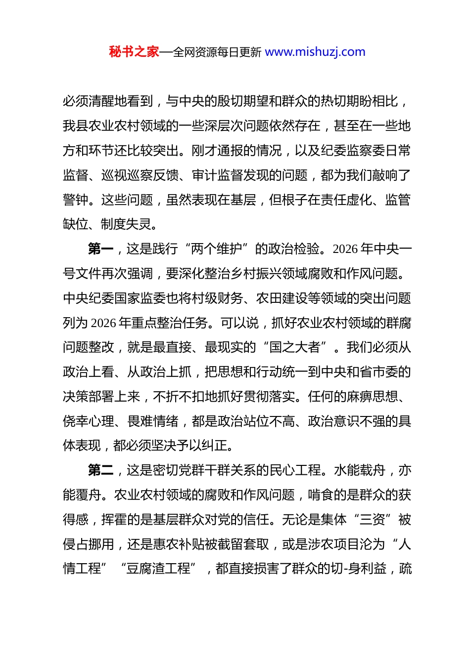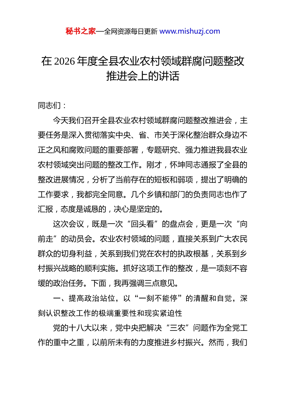 秘书之家—全网资源每日更新 www.mishuzj.com在 2026 年度全县农业农村领域群腐问题整改推进会上的讲话 同志们:今天我们召开全县农业农村领域群腐问题整改推进会,主要任务是深入贯彻落实中央、省、市关于深化整治群众身边不正之风和腐败问题的重要部署,专题研究、强力推进我县农业农村领域突出问题的整改工作。刚才,怀坤同志通报了全县的整改进展情况,分析了当前存在的短板和弱项,提出了明确的工作要求,我都完全同意。几个乡镇和部门的负责同志也作了汇报,态度是诚恳的,决心是坚定的。这次会议,既是一次“回头看”的盘点会,更是一次“向前走”的动员会。农业农村领域的问题,直接关系到广大农民群众的切身利益,关系到我们党在农村的执政根基,关系到乡村振兴战略的顺利实施。抓好这项工作的整改,是一项刻不容缓的政治任务。下面,我再强调三点意见。一、提高政治站位,以“一刻不能停”的清醒和自觉,深刻认识整改工作的极端重要性和现实紧迫性党的十八大以来,党中央把解决“三农”问题作为全党工作的重中之重,以前所未有的力度推进乡村振兴。然而,我们秘书之家—全网资源每日更新 www.mishuzj.com必须清醒地看到,与中央的殷切期望和群众的热切期盼相比,我县农业农村领域的一些深层次问题依然存在,甚至在一些地方和环节还比较突出。刚才通报的情况,以及纪委监察委日常监督、巡视巡察反馈、审计监督发现的问题,都为我们敲响了警钟。这些问题,虽然表现在基层,但根子在责任虚化、监管缺位、制度失灵。第一,这是践行“两个维护”的政治检验。2026 年中央一号文件再次强调,要深化整治乡村振兴领域腐败和作风问题。中央纪委国家监委也将村级财务、农田建设等领域的突出问题列为 2026 年重点整治任务。可以说,抓好农业农村领域的群腐问题整改,就是最直接、最现实的“国之大者”。我们必须从政治上看、从政治上抓,把思想和行动统一到中央和省市委的决策部署上来,不折不扣地抓好贯彻落实。任何的麻痹思想、侥幸心理、畏难情绪,都是政治站位不高、政治意识不强的具体表现,都必须坚决予以纠正。第二,这是密切党群干群关系的民心工程。水能载舟,亦能覆舟。农业农村领域的腐败和作风问题,啃食的是群众的获得感,挥霍的是基层群众对党的信任。无论是集体“三资”被侵占挪用,还是惠农补贴被截留套取,或是涉农项目沦为“人情工程”“豆腐渣工程”,都直接损害了群众的切-身利益,疏秘书之家—全网资源每日更新 www.mishuzj.com远了党和群众的血肉联系。我们必须始终坚持以人民为中心的发展思想,把维护好、实现好、发展好广大农民群众的根本利益作为一切工作的出发点和落脚点,以实实在在的整改成果取信于民,不断厚植党的执政根基。第三,这是护航乡村振兴战略的必然要求。当前,我县正处于全面推进乡村振兴、加快农业农村现代化的关键时期。大量真金白银的涉农资金投入基层,一大批含金量高的产业项目落地乡村。如果监管的“笼子”扎不紧,制度的“堤坝”筑不牢,这些宝贵的资金和资源就可能成为滋生腐败的温床,乡村振兴的大好局面就可能受到侵蚀。我们必须把问题整改作为净化政治生态、优化发展环境的重要抓手,通过刮骨疗毒、激浊扬清,为全县乡村振兴事业健康发展扫清障碍、保驾护航。二、聚焦关键环节,以“一寸不让”的决心和力度,坚决推动问题整改清仓见底、标本兼治问题是时代的声音,整改是我们的回答。从前期排查和各单位汇报的情况看,问题主要集中在农村集体“三资”管理、农田水利设施管护和乡村振兴资金项目监管三个方面。全县上下必须拿出钉钉子的精神,聚焦靶心、精准发力,一个问题一个问题地解决,一个领域一个领域地突破,务求取得扎实成效。(一)聚焦农村集体“三资”管理,坚决打好存量清理和秘书之家—全网资源每日更新 www.mishuzj.com规范提升的攻坚战。农村集体“三资”是发展壮大村级集体经济、服务保障农村群众的重要物质基础。据统计,截至 2025 年底,全国在农村集体“三资”管理领域共整改问题合同超过176 万份,追回被侵吞挪用、截留套取的集体资金近 13 亿元。这组数据触目惊心,也说明这项工作的艰巨性。...