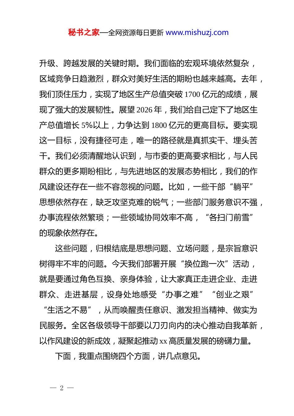 秘书之家—全网资源每日更新 www.mishuzj.com在 xx 区推动作风建设常态长效暨“换位跑一次”活动部署会上的讲话同志们:今天是大年初七,是春节假期后正式上班的第一天。我们选择在这样一个特殊的时间节点,召开全区推动作风建设常态长效暨“换位跑一次”活动部署会,就是要释放一个鲜明的信号:开局就是决战、起步就是冲刺。全区上下要迅速收心归位,以“满格”的状态、“奔跑”的姿态,立即投入到新一年的工作中来,以过硬作风为现代化精彩城区建设开好局、起好步。过去三年,区委坚持把作风建设作为一项基础性、全局性、关键性工程来抓,以前所未有的决心和力度,相继部署开展了作风建设“提升年”“深化年”“显效年”活动。三年的持续发力,三年的久久为功,我们欣喜地看到,全区干部队伍的精神面貌焕然一新,干事创业的精气神全面提振;我们欣喜地看到,发展的堵点痛点被逐一攻克,区域发展的速度、质量和效益全面提速。实践充分证明,抓作风就是抓发展,优作风就是优环境。这些来之不易的成绩,凝结着全区上下的心血和汗水,也为我们今天推动作风建设常态长效奠定了坚实基础。作风建设永远在路上,没有休止符。当前,xx 正处在转型— 1 —秘书之家—全网资源每日更新 www.mishuzj.com升级、跨越发展的关键时期。我们面临的宏观环境依然复杂,区域竞争日趋激烈,群众对美好生活的期盼也越来越高。去年,我们顶住压力,实现了地区生产总值突破 1700 亿元的成绩,展现了强大的发展韧性。展望 2026 年,我们给自己定下了地区生产总值增长 5%以上,力争达到 1800 亿元的更高目标。要实现这一目标,没有捷径可走,唯一的路径就是真抓实干、埋头苦干。我们必须清醒地认识到,与市委的更高要求相比,与人民群众的更多期盼相比,与先进地区的发展态势相比,我们的作风建设还存在一些不容忽视的问题。比如,一些干部“躺平”思想依然存在,缺乏攻坚克难的锐气;一些部门服务意识不强,办事流程依然繁琐;一些领域协同效率不高,“各扫门前雪”的现象依然存在。这些问题,归根结底是思想问题、立场问题,是宗旨意识树得牢不牢的问题。今天我们部署开展“换位跑一次”活动,就是要通过角色互换、亲身体验,让大家真正走进企业、走进群众、走进基层,设身处地感受“办事之难”“创业之艰”“生活之不易”,从而唤醒责任意识、激发担当精神、做实为民服务。全区各级领导干部要以刀刃向内的决心推动自我革新,以作风建设的新成效,凝聚起推动 xx 高质量发展的磅礴力量。下面,我重点围绕四个方面,讲几点意见。— 2 —秘书之家—全网资源每日更新 www.mishuzj.com一、着力解决“基层实不实”的问题,在换位体验中夯实发展根基基础不牢,地动山摇。基层是政策落地的“最后一公里”,也是我们服务企业群众的最前沿。基层的作风实不实、服务好不好,直接关系到我们发展的根基牢不牢。开展“换位跑一次”活动,首要任务就是要聚焦基层,把问题找准、把根源挖深、把基础夯实。第一,要着力构建企业最便捷的营商环境。营商环境是区域发展的核心竞争力。我们要结合持续深化的“百园百楼”为企服务专项行动,让领导干部真正当一回“企业办事员”。要去体验从项目审批、施工许可到竣工验收的全流程,看看我们的流程设计还有哪些漏洞,审批环节还有哪些可以压缩的空间。要以企业的身份去申请各类惠企政策,看看政策宣传是否精准到位,申报流程是否简便明了,兑现周期是否及时高效。去年,我们通过“百园百 lo 楼”行动,累计服务企业近 2000 家次,激活了全区 135 栋楼宇和 84 个园区的发展潜力。但我们不能满足于此,要对标最优标准,对服务中暴露出的问题进行再梳理、再复盘,推动企业开办时间“0.5 个工作日”成为常态,项目审批效率再提升 30%以上,真正把 xx 打造成投资兴业、近悦远来的热土。— 3 —秘书之家—全网资源每日更新 www.mishuzj.com第二,要着力构筑群众最满意的民生服务。民生无小事,枝叶总关情。我们的干部要深入社区,当一回“普通老百姓”,体验群众的高频办事事项。要围绕“一老一小”、困难群众等重点群体,聚焦公共服务、城市运行和诉求...