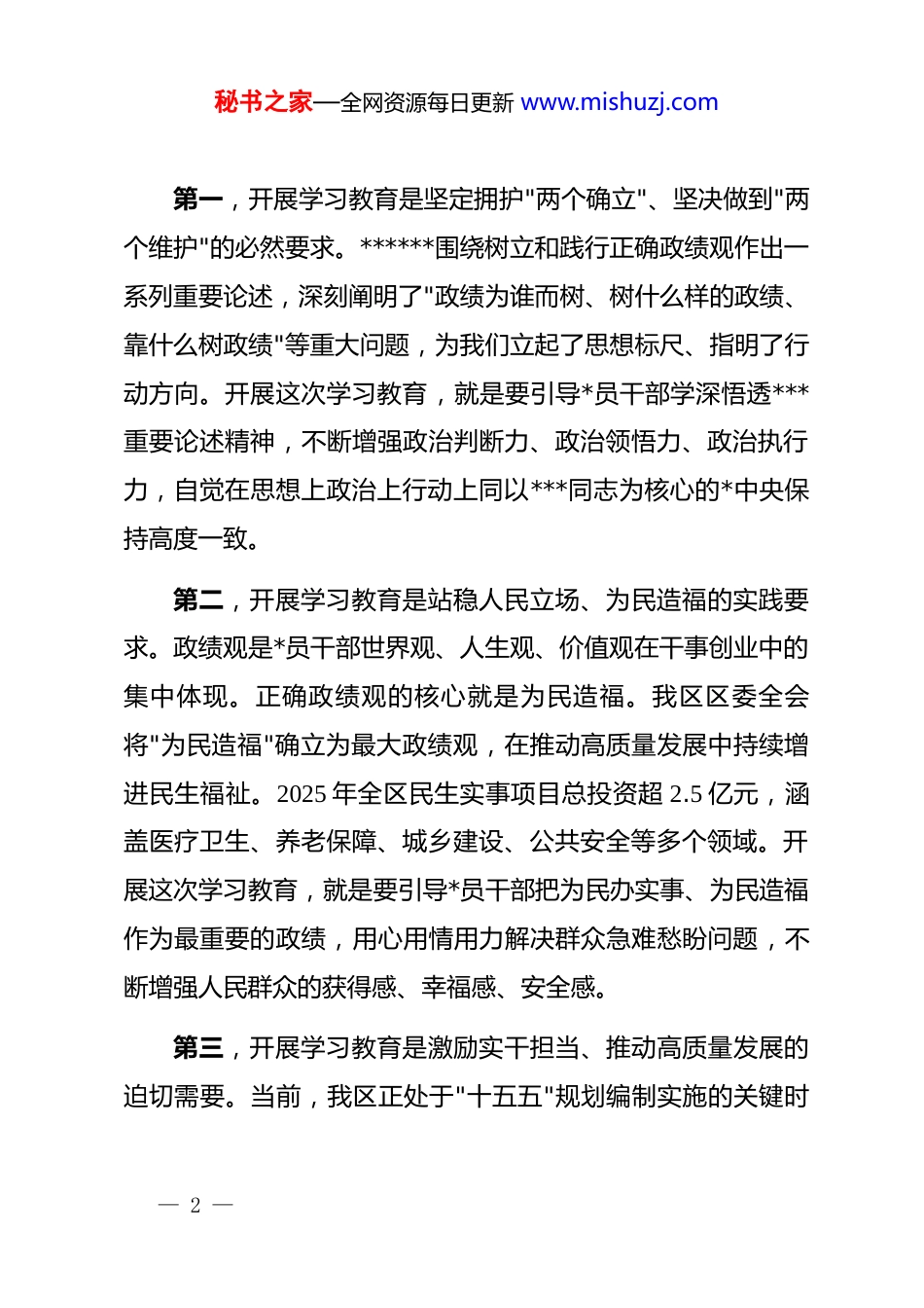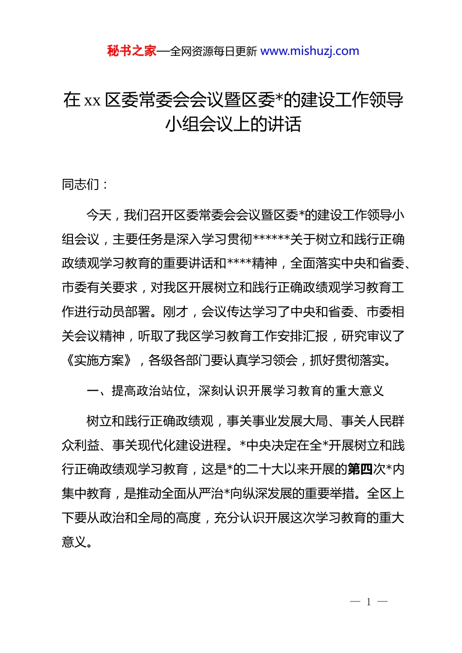 秘书之家—全网资源每日更新 www.mishuzj.com在 xx 区委常委会会议暨区委*的建设工作领导小组会议上的讲话同志们:今天,我们召开区委常委会会议暨区委*的建设工作领导小组会议,主要任务是深入学习贯彻******关于树立和践行正确政绩观学习教育的重要讲话和****精神,全面落实中央和省委、市委有关要求,对我区开展树立和践行正确政绩观学习教育工作进行动员部署。刚才,会议传达学习了中央和省委、市委相关会议精神,听取了我区学习教育工作安排汇报,研究审议了《实施方案》,各级各部门要认真学习领会,抓好贯彻落实。一、提高政治站位,深刻认识开展学习教育的重大意义树立和践行正确政绩观,事关事业发展大局、事关人民群众利益、事关现代化建设进程。*中央决定在全*开展树立和践行正确政绩观学习教育,这是*的二十大以来开展的第四次*内集中教育,是推动全面从严治*向纵深发展的重要举措。全区上下要从政治和全局的高度,充分认识开展这次学习教育的重大意义。— 1 —秘书之家—全网资源每日更新 www.mishuzj.com第一,开展学习教育是坚定拥护"两个确立"、坚决做到"两个维护"的必然要求。******围绕树立和践行正确政绩观作出一系列重要论述,深刻阐明了"政绩为谁而树、树什么样的政绩、靠什么树政绩"等重大问题,为我们立起了思想标尺、指明了行动方向。开展这次学习教育,就是要引导*员干部学深悟透***重要论述精神,不断增强政治判断力、政治领悟力、政治执行力,自觉在思想上政治上行动上同以***同志为核心的*中央保持高度一致。第二,开展学习教育是站稳人民立场、为民造福的实践要求。政绩观是*员干部世界观、人生观、价值观在干事创业中的集中体现。正确政绩观的核心就是为民造福。我区区委全会将"为民造福"确立为最大政绩观,在推动高质量发展中持续增进民生福祉。2025 年全区民生实事项目总投资超 2.5 亿元,涵盖医疗卫生、养老保障、城乡建设、公共安全等多个领域。开展这次学习教育,就是要引导*员干部把为民办实事、为民造福作为最重要的政绩,用心用情用力解决群众急难愁盼问题,不断增强人民群众的获得感、幸福感、安全感。第三,开展学习教育是激励实干担当、推动高质量发展的迫切需要。当前,我区正处于"十五五"规划编制实施的关键时— 2 —秘书之家—全网资源每日更新 www.mishuzj.com期,改革发展稳定任务艰巨繁重。开展这次学习教育,就是要引导*员干部牢固树立和践行正确政绩观,坚持从实际出发、按规律办事,自觉为人民出政绩、以实干出政绩,以新的发展实绩为省市大局多作贡献。二、聚焦主题主线,准确把握学习教育的核心要求根据中央部署,这次学习教育从 2026 年春节假期后启动,7 月底基本结束。按照中央要求,学习教育不分批次、不划阶段,一体推进学习研讨、查摆检视、整改整治、建章立制等工作。我们要聚焦主题、把握重点,确保学习教育取得实效。第一,要深学细悟强根基。理论学习是树立正确政绩观的基础。要原原本本学习******关于树立和践行正确政绩观的重要论述,认真学习《***关于树立和践行正确政绩观论述摘编》,深刻领会精神实质、把握核心要义。要发挥理论学习中心组引领作用,举办专题读书班、研讨交流班等载体,推动学习教育入脑入心。全区 2592 个基层*组织要全覆盖开展学习,教育引导*员干部从思想根源上解决"政绩为谁树、树什么政绩、怎么树政绩"的问题。要把理论学习与学习贯彻**************思想结合起来,与学习贯彻*的二十届三中全会精神结合起来,与推动本地本部门中心工作结合起来,做到学思用贯通、知信行统— 3 —秘书之家—全网资源每日更新 www.mishuzj.com一。第二,要查摆问题找偏差。查摆问题是改进工作的突破口。要对照正确政绩观要求,全面检视在思想观念、工作理念、发展思路、推进方式等方面存在的偏差和不足。要把自己摆进去、把职责摆进去、把工作摆进去,深入查找是否存在"重显绩轻潜绩""重当前轻长远""重面子轻里子"等倾向性问题,是否存在搞"形象工程""面子工程"等形式主义官僚主义问题。要坚持把解决问题作为改进工作的突破口,与巡视巡察整改、深入贯彻中央八项规定精神学习教育整改...