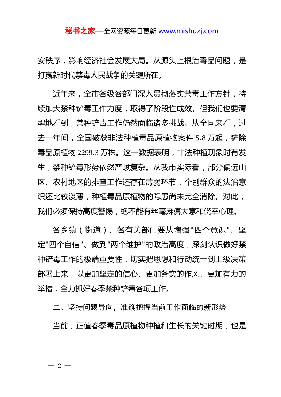 秘书之家—全网资源每日更新 www.mishuzj.com在 xx 市 2026 年春季禁种铲毒工作部署推进会上的讲话同志们:今天,我们召开这次全市春季禁种铲毒工作部署推进会,主要任务是深入贯彻落实上级关于禁毒工作的重要决策部署,全面分析当前禁种铲毒工作形势,对春季禁种铲毒各项重点任务进行再动员、再部署、再推进、再压实,坚决守住毒品原植物"零种植、零产量"工作底线,切实筑牢春季禁毒源头防控防线。刚才,xx 同志传达了上级有关会议精神,通报了近期全市禁种铲毒工作开展情况,xx 同志宣读了工作方案,各乡镇(街道)和相关部门签订了责任书。会议安排紧凑、内容务实,希望大家认真抓好落实。下面,我就做好今年春季禁种铲毒工作,讲几点意见。一、提高政治站位,深刻认识禁种铲毒工作的重大意义禁种铲毒工作是禁毒斗争的重要源头治理工程,事关人民群众身心健康、事关社会和谐稳定、事关国家长治久安。毒品问题一旦蔓延,将严重危害人民群众的身体健康,破坏社会治— 1 —秘书之家—全网资源每日更新 www.mishuzj.com安秩序,影响经济社会发展大局。从源头上根治毒品问题,是打赢新时代禁毒人民战争的关键所在。近年来,全市各级各部门深入贯彻落实禁毒工作方针,持续加大禁种铲毒工作力度,取得了阶段性成效。但我们也要清醒地看到,禁种铲毒工作仍然面临诸多挑战。从全国来看,过去十年间,全国破获非法种植毒品原植物案件 5.8 万起,铲除毒品原植物 2299.3 万株。这一数据表明,非法种植现象时有发生,禁种铲毒形势依然严峻复杂。从我市实际看,部分偏远山区、农村地区的排查工作还存在薄弱环节,个别群众的法治意识还比较淡薄,种植毒品原植物的隐患尚未完全消除。对此,我们必须保持高度警惕,绝不能有丝毫麻痹大意和侥幸心理。各乡镇(街道)、各有关部门要从增强"四个意识"、坚定"四个自信"、做到"两个维护"的政治高度,深刻认识做好禁种铲毒工作的极端重要性,切实把思想和行动统一到上级决策部署上来,以更加坚定的信心、更加务实的作风、更加有力的举措,全力抓好春季禁种铲毒各项工作。二、坚持问题导向,准确把握当前工作面临的新形势当前,正值春季毒品原植物种植和生长的关键时期,也是— 2 —秘书之家—全网资源每日更新 www.mishuzj.com禁种铲毒工作的黄金时段。综合分析各方面情况,我市禁种铲毒工作主要面临以下几个方面的形势特点:一是种植隐蔽性不断增强。随着打击力度的持续加大,不法分子种植毒品原植物的方式更加隐蔽,从传统的田间地头向闲置院落、废弃厂房、温室大棚、楼顶露台、阳台花盆等隐蔽场所转移,从集中连片种植向零星分散种植转变,发现和查处的难度越来越大。二是部分地区存在侥幸心理。个别乡镇、村组对禁种铲毒工作重视不够,存在"种几棵没事""查不到我头上"等侥幸思想,工作落实不够到位,宣传发动不够深入,排查整治不够彻底,给非法种植行为留下可乘之机。三是季节性特点更加明显。春季是毒品原植物播种、出苗的关键时节,做好春季禁种铲毒工作,对于实现全年"零种植、零产量"目标具有决定性意义。错过这个关键时期,一旦毒品原植物开花结果,查处的难度和成本将大大增加。四是群众法治意识仍需提升。部分群众特别是农村老年群体对非法种植毒品原植物的法律后果认识不足,对"种毒违法、种毒必铲、种毒必究"的法律法规了解不够,有的甚至存在"罂— 3 —秘书之家—全网资源每日更新 www.mishuzj.com粟能治病""用来喂牲畜"等错误认识,需要持续加强法治宣传教育。五是新技术手段应用不够充分。虽然我们已经建立了"人防+技防"立体化巡查机制,但在无人机、卫星遥感等现代化技术手段的运用上还不够充分,数据分析研判能力还有待提升,巡查管控的精准性和时效性还需进一步加强。面对这些新形势、新特点,各级各部门必须进一步强化风险意识,坚持底线思维,主动担当作为,采取更加有力的措施,坚决打赢春季禁种铲毒攻坚战。三、突出工作重点,全面提升禁种铲毒工作实效做好春季禁种铲毒工作,必须坚持早部署、早排查、早铲除、早宣传的工作思路,聚焦重点区域、重点人群、关键环节,精准施策、靶向发力,确保各项工作落到...