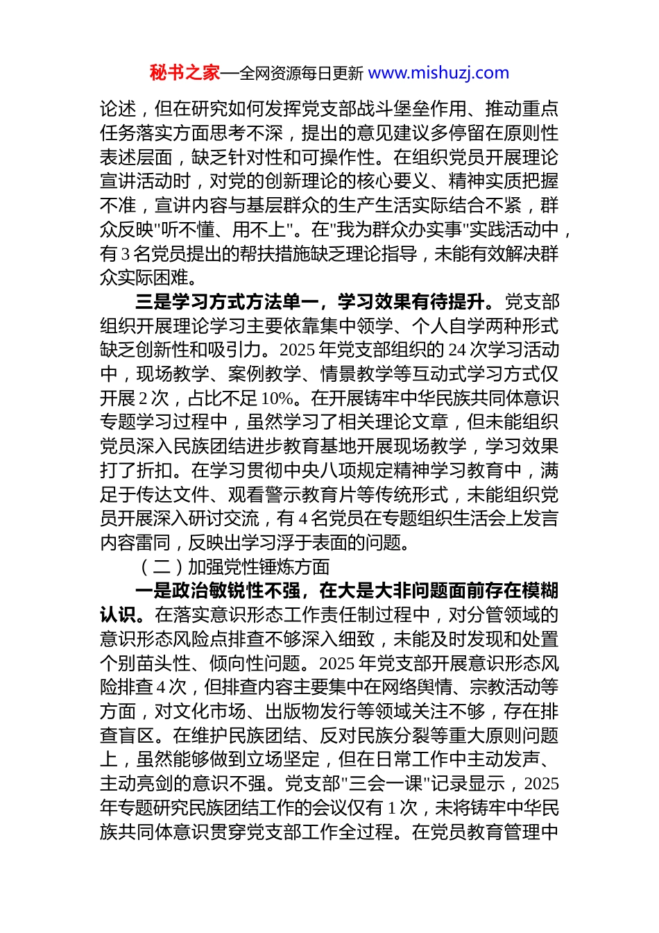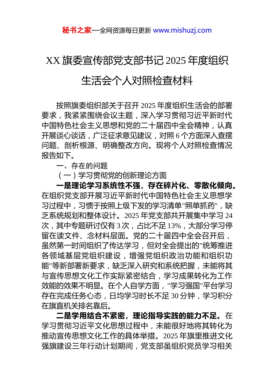 秘书之家—全网资源每日更新 www.mishuzj.comXX 旗委宣传部党支部书记 2025 年度组织生活会个人对照检查材料按照旗委组织部关于召开 2025 年度组织生活会的部署要求,我紧紧围绕会议主题,深入学习贯彻习近平新时代中国特色社会主义思想和党的二十届四中全会精神,认真开展谈心谈话,广泛征求意见建议,对照 6 个方面深入查摆问题、剖析根源、明确整改方向。现将个人对照检查情况报告如下。一、存在的问题(一)学习贯彻党的创新理论方面一是理论学习系统性不强,存在碎片化、零散化倾向。在组织党支部开展习近平新时代中国特色社会主义思想学习过程中,习惯于按照上级下发的学习清单"照单抓药",缺乏系统规划和整体设计。2025 年党支部共开展集中学习 24次,其中专题研讨仅有 3 次,占比不足 13%,大部分学习停留在读文件、念材料层面。党的二十届四中全会召开后,虽然第一时间组织了传达学习,但对全会提出的"统筹推进各领域基层党组织建设,增强党组织政治功能和组织功能"等新部署新要求,缺乏深入研究和系统把握,未能将其与宣传思想文化工作实际紧密结合,学习成果转化为工作效能的效果不明显。在个人自学方面,"学习强国"平台学习存在完成任务心态,日均学习时长不足 30 分钟,学习积分在旗直机关排名靠后。二是学用结合不紧密,理论指导实践的能力不足。在学习贯彻习近平文化思想过程中,未能很好地将其转化为推动宣传思想文化工作的具体举措。2025 年旗里推进文化强旗建设三年行动计划期间,党支部虽组织党员学习相关秘书之家—全网资源每日更新 www.mishuzj.com论述,但在研究如何发挥党支部战斗堡垒作用、推动重点任务落实方面思考不深,提出的意见建议多停留在原则性表述层面,缺乏针对性和可操作性。在组织党员开展理论宣讲活动时,对党的创新理论的核心要义、精神实质把握不准,宣讲内容与基层群众的生产生活实际结合不紧,群众反映"听不懂、用不上"。在"我为群众办实事"实践活动中,有 3 名党员提出的帮扶措施缺乏理论指导,未能有效解决群众实际困难。三是学习方式方法单一,学习效果有待提升。党支部组织开展理论学习主要依靠集中领学、个人自学两种形式缺乏创新性和吸引力。2025 年党支部组织的 24 次学习活动中,现场教学、案例教学、情景教学等互动式学习方式仅开展 2 次,占比不足 10%。在开展铸牢中华民族共同体意识专题学习过程中,虽然学习了相关理论文章,但未能组织党员深入民族团结进步教育基地开展现场教学,学习效果打了折扣。在学习贯彻中央八项规定精神学习教育中,满足于传达文件、观看警示教育片等传统形式,未能组织党员开展深入研讨交流,有 4 名党员在专题组织生活会上发言内容雷同,反映出学习浮于表面的问题。(二)加强党性锤炼方面一是政治敏锐性不强,在大是大非问题面前存在模糊认识。在落实意识形态工作责任制过程中,对分管领域的意识形态风险点排查不够深入细致,未能及时发现和处置个别苗头性、倾向性问题。2025 年党支部开展意识形态风险排查 4 次,但排查内容主要集中在网络舆情、宗教活动等方面,对文化市场、出版物发行等领域关注不够,存在排查盲区。在维护民族团结、反对民族分裂等重大原则问题上,虽然能够做到立场坚定,但在日常工作中主动发声、主动亮剑的意识不强。党支部"三会一课"记录显示,2025年专题研究民族团结工作的会议仅有 1 次,未将铸牢中华民族共同体意识贯穿党支部工作全过程。在党员教育管理中秘书之家—全网资源每日更新 www.mishuzj.com对个别党员在网络平台上转发不当言论的行为未能及时发现和制止,存在监管漏洞。二是党性修养锤炼不够,存在重业务轻党建倾向。作为党支部书记,在抓党建工作与业务工作融合方面思考不多、办法不多,党建工作与宣传业务工作存在"两张皮"现象。2025 年党支部工作计划中,党建工作安排较为笼统,与宣传部年度重点任务衔接不紧。在执行"三会一课"制度方面,存在重形式轻效果问题,支部党员大会平均时长不足 40 分钟,支委会会议研究具体问题不深入,党小组活动开展不经常。在党员党性分析活动中,有 3 名党员的自我剖析材料内容空泛...