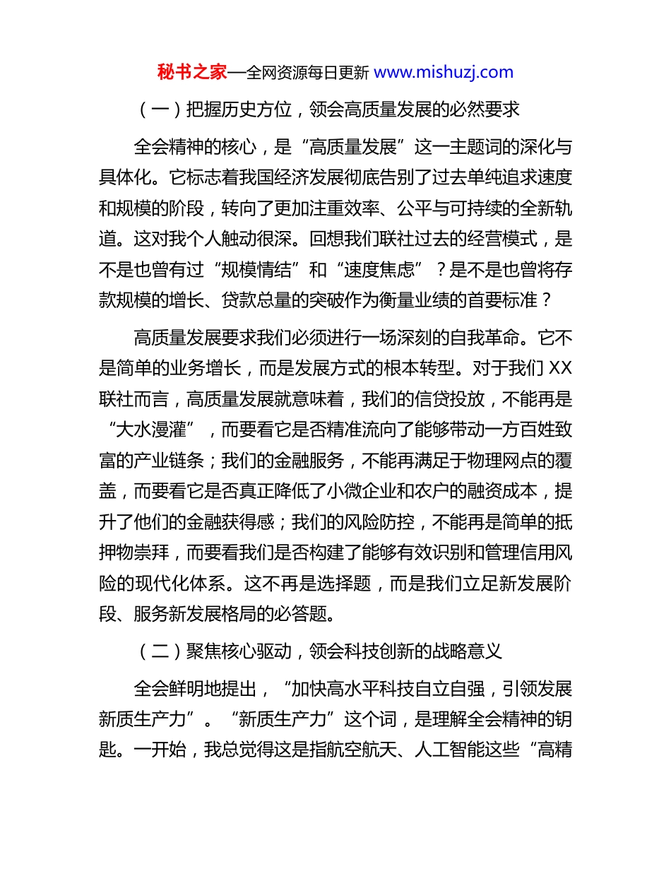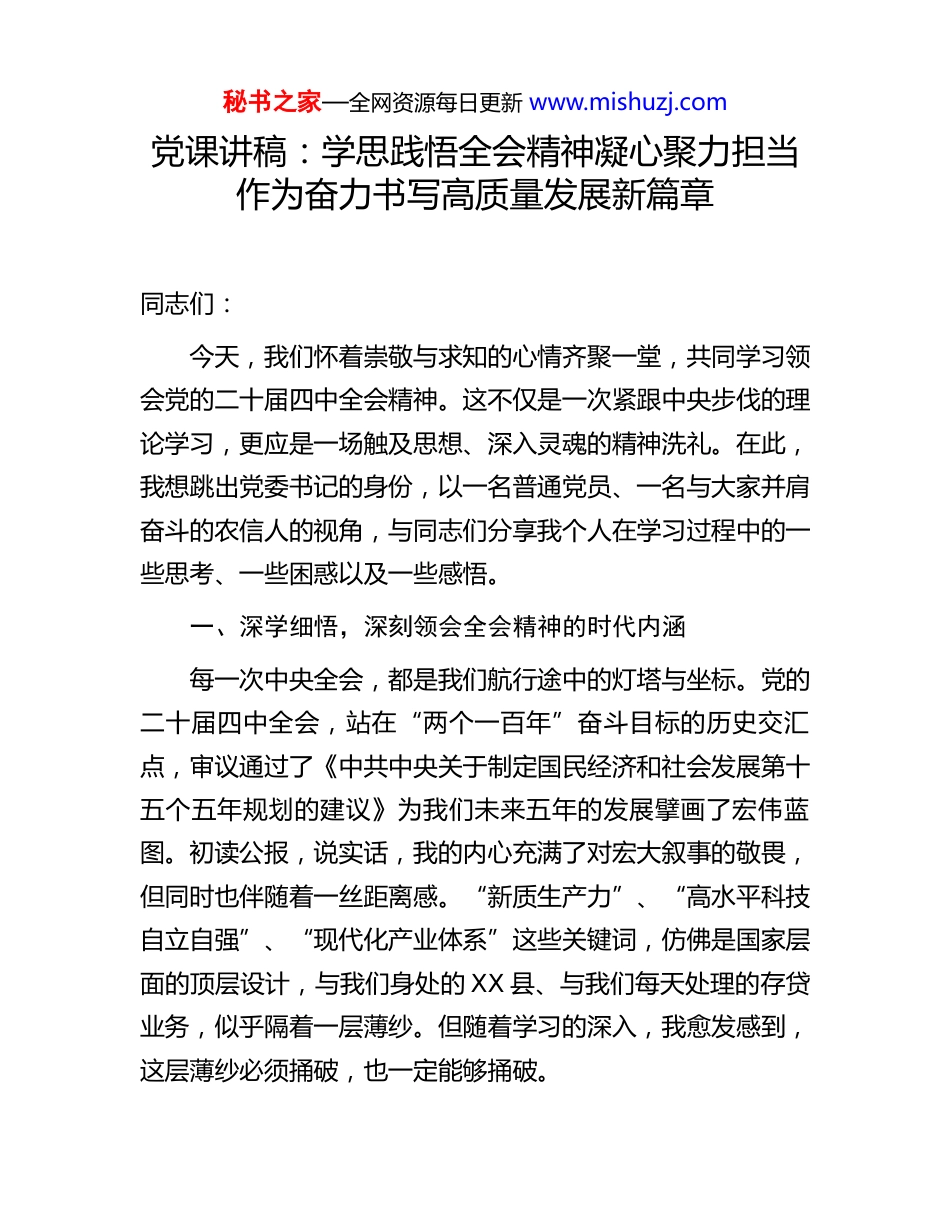秘书之家—全网资源每日更新 www.mishuzj.com党课讲稿:学思践悟全会精神凝心聚力担当作为奋力书写高质量发展新篇章同志们:今天,我们怀着崇敬与求知的心情齐聚一堂,共同学习领会党的二十届四中全会精神。这不仅是一次紧跟中央步伐的理论学习,更应是一场触及思想、深入灵魂的精神洗礼。在此,我想跳出党委书记的身份,以一名普通党员、一名与大家并肩奋斗的农信人的视角,与同志们分享我个人在学习过程中的一些思考、一些困惑以及一些感悟。一、深学细悟,深刻领会全会精神的时代内涵每一次中央全会,都是我们航行途中的灯塔与坐标。党的二十届四中全会,站在“两个一百年”奋斗目标的历史交汇点,审议通过了《中共中央关于制定国民经济和社会发展第十五个五年规划的建议》为我们未来五年的发展擘画了宏伟蓝图。初读公报,说实话,我的内心充满了对宏大叙事的敬畏,但同时也伴随着一丝距离感。“新质生产力”、“高水平科技自立自强”、“现代化产业体系”这些关键词,仿佛是国家层面的顶层设计,与我们身处的 XX 县、与我们每天处理的存贷业务,似乎隔着一层薄纱。但随着学习的深入,我愈发感到,这层薄纱必须捅破,也一定能够捅破。秘书之家—全网资源每日更新 www.mishuzj.com(一)把握历史方位,领会高质量发展的必然要求全会精神的核心,是“高质量发展”这一主题词的深化与具体化。它标志着我国经济发展彻底告别了过去单纯追求速度和规模的阶段,转向了更加注重效率、公平与可持续的全新轨道。这对我个人触动很深。回想我们联社过去的经营模式,是不是也曾有过“规模情结”和“速度焦虑”?是不是也曾将存款规模的增长、贷款总量的突破作为衡量业绩的首要标准?高质量发展要求我们必须进行一场深刻的自我革命。它不是简单的业务增长,而是发展方式的根本转型。对于我们 XX联社而言,高质量发展就意味着,我们的信贷投放,不能再是“大水漫灌”,而要看它是否精准流向了能够带动一方百姓致富的产业链条;我们的金融服务,不能再满足于物理网点的覆盖,而要看它是否真正降低了小微企业和农户的融资成本,提升了他们的金融获得感;我们的风险防控,不能再是简单的抵押物崇拜,而要看我们是否构建了能够有效识别和管理信用风险的现代化体系。这不再是选择题,而是我们立足新发展阶段、服务新发展格局的必答题。(二)聚焦核心驱动,领会科技创新的战略意义全会鲜明地提出,“加快高水平科技自立自强,引领发展新质生产力”。“新质生产力”这个词,是理解全会精神的钥匙。一开始,我总觉得这是指航空航天、人工智能这些“高精秘书之家—全网资源每日更新 www.mishuzj.com尖”领域的事。但后来我逐渐认识到,它的内涵远不止于此。凡是通过科技赋能,能够带来生产效率跃升、产业结构优化的生产力,都是新质生产力。这把钥匙,恰恰能打开我们农村金融工作面临的许多困局。在 XX 这片土地上,新质生产力可能就孕育在柿子醋加工企业那条新引进的智能灌装生产线里,可能体现在养殖大户那个利用物联网技术实时监控环境的智慧养殖场中,也可能隐藏在青年返乡创业者那个对接全国市场的电商直播间里。这些,都是我们金融活水最应浇灌的“良田”。全会精神警醒我,作为地方金融主力军,我们的眼光必须超越传统的砖瓦厂房和土地存货,去发现、去理解、去支持这些代表着未来的“新质生产力”萌芽。我们不能再仅仅扮演一个资金提供者的角色,而应成为一个价值发现者和创新支持者。这意味着我们的客户经理需要懂一些农业科技,我们的信审部门需要建立新的风险评估模型,我们的整个组织都需要拥抱数字化转型的浪潮。(三)立足根本遵循,领会“六个坚持”的世界观方法论如果说高质量发展和科技创新是“做什么”和“怎么做”的问题,那么,二十大报告提出的“六个坚持”,就是指导我们想问题、作决策的根本立场、观点和方法。在学习全会精神的过程中,我反复用这“六个坚持”来检视我们的工作,感受尤其深刻。秘书之家—全网资源每日更新 www.mishuzj.com坚持人民至上,对我们农信社而言,就是始终牢记“农民的银行、农村的银行”这个根本定位。我们的根在农村,我们的情系百姓。每一...