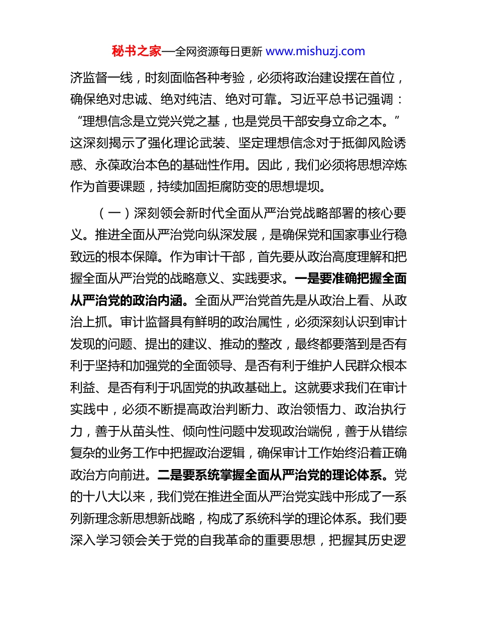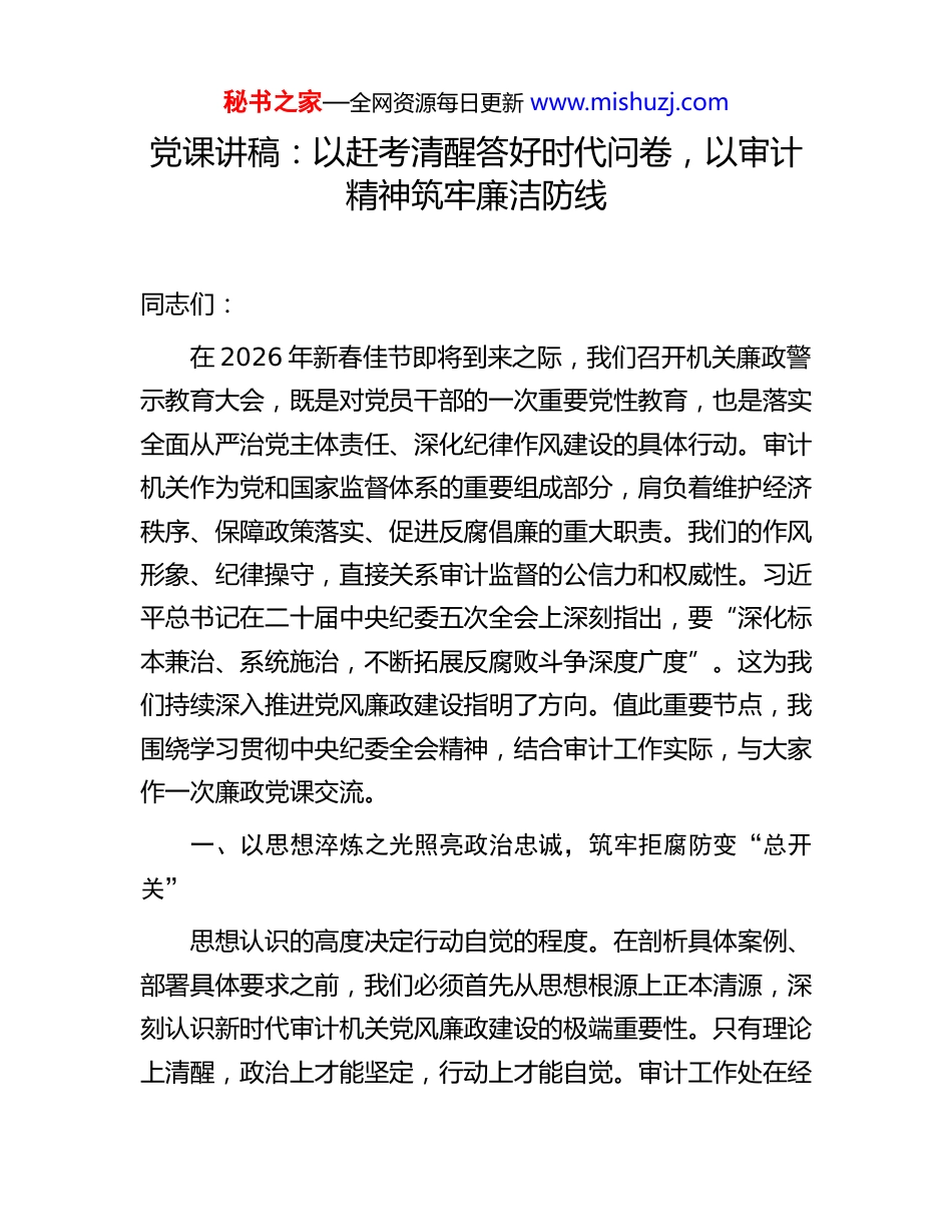 秘书之家—全网资源每日更新 www.mishuzj.com党课讲稿:以赶考清醒答好时代问卷,以审计精神筑牢廉洁防线同志们:在 2026 年新春佳节即将到来之际,我们召开机关廉政警示教育大会,既是对党员干部的一次重要党性教育,也是落实全面从严治党主体责任、深化纪律作风建设的具体行动。审计机关作为党和国家监督体系的重要组成部分,肩负着维护经济秩序、保障政策落实、促进反腐倡廉的重大职责。我们的作风形象、纪律操守,直接关系审计监督的公信力和权威性。习近平总书记在二十届中央纪委五次全会上深刻指出,要“深化标本兼治、系统施治,不断拓展反腐败斗争深度广度”。这为我们持续深入推进党风廉政建设指明了方向。值此重要节点,我围绕学习贯彻中央纪委全会精神,结合审计工作实际,与大家作一次廉政党课交流。一、以思想淬炼之光照亮政治忠诚,筑牢拒腐防变“总开关”思想认识的高度决定行动自觉的程度。在剖析具体案例、部署具体要求之前,我们必须首先从思想根源上正本清源,深刻认识新时代审计机关党风廉政建设的极端重要性。只有理论上清醒,政治上才能坚定,行动上才能自觉。审计工作处在经秘书之家—全网资源每日更新 www.mishuzj.com济监督一线,时刻面临各种考验,必须将政治建设摆在首位,确保绝对忠诚、绝对纯洁、绝对可靠。习近平总书记强调:“理想信念是立党兴党之基,也是党员干部安身立命之本。”这深刻揭示了强化理论武装、坚定理想信念对于抵御风险诱惑、永葆政治本色的基础性作用。因此,我们必须将思想淬炼作为首要课题,持续加固拒腐防变的思想堤坝。(一)深刻领会新时代全面从严治党战略部署的核心要义。推进全面从严治党向纵深发展,是确保党和国家事业行稳致远的根本保障。作为审计干部,首先要从政治高度理解和把握全面从严治党的战略意义、实践要求。一是要准确把握全面从严治党的政治内涵。全面从严治党首先是从政治上看、从政治上抓。审计监督具有鲜明的政治属性,必须深刻认识到审计发现的问题、提出的建议、推动的整改,最终都要落到是否有利于坚持和加强党的全面领导、是否有利于维护人民群众根本利益、是否有利于巩固党的执政基础上。这就要求我们在审计实践中,必须不断提高政治判断力、政治领悟力、政治执行力,善于从苗头性、倾向性问题中发现政治端倪,善于从错综复杂的业务工作中把握政治逻辑,确保审计工作始终沿着正确政治方向前进。二是要系统掌握全面从严治党的理论体系。党的十八大以来,我们党在推进全面从严治党实践中形成了一系列新理念新思想新战略,构成了系统科学的理论体系。我们要深入学习领会关于党的自我革命的重要思想,把握其历史逻秘书之家—全网资源每日更新 www.mishuzj.com辑、理论逻辑、实践逻辑;深刻理解“六个如何始终”的重大命题,认识党在长期执政条件下面临的“四大考验”“四种危险”的长期性复杂性尖锐性;准确把握新时代党的建设总要求,特别是政治建设、纪律建设、作风建设等方面的具体要求,将其内化为开展审计监督的根本遵循和行动指南。三是要精准落实全面从严治党的实践要求。全面从严治党的要求最终要落实到具体行动中。对审计机关而言,就是要将全面从严治党要求贯穿于审计工作全过程各方面。在审计项目谋划上,要突出对重大政策落实、公共资金使用、国有资产运营、公共资源交易等重点领域和关键环节的监督,严肃查处违纪违法问题;在审计组织实施上,要严格执行审计“四严禁”工作要求和审计“八不准”工作纪律,坚持依法审计、文明审计、廉洁审计;在审计成果运用上,要强化与纪检监察、巡视巡察、组织人事等监督力量的贯通协同,形成监督合力,推动制度完善。四是要清醒认识全面从严治党的严峻形势。反腐败斗争取得压倒性胜利并全面巩固,但形势依然严峻复杂,腐败存量尚未见底、增量仍有发生。审计作为反腐“利剑”,必须保持高度警惕,充分认识腐败问题的顽固性、隐蔽性、复杂性,深刻理解腐蚀与反腐蚀斗争的长期存在。我们要克服“审计部门清水衙门”的麻痹思想,警惕“围猎”风险,正视审计权力运行中可能存在的廉政风险点,如自由裁量权、信息不对称、外部干扰等,时刻绷紧廉洁自律...