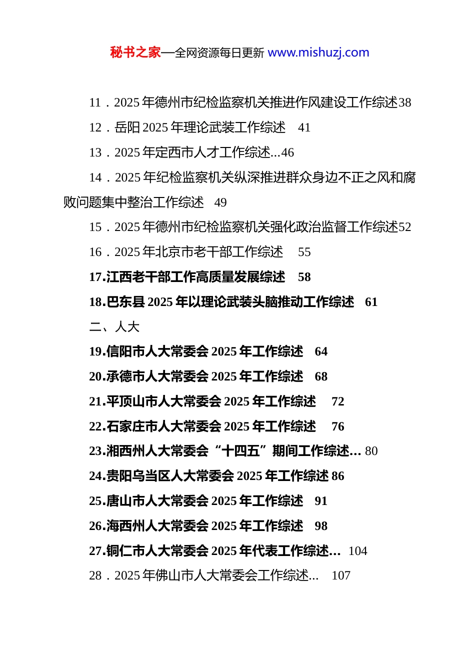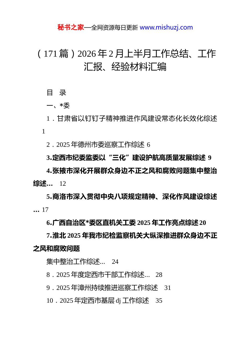 秘书之家—全网资源每日更新 www.mishuzj.com(171 篇)2026 年 2 月上半月工作总结、工作汇报、经验材料汇编目录一、*委1.甘肃省以钉钉子精神推进作风建设常态化长效化综述12.2025 年德州市委巡察工作综述 63.定西市纪委监委以“三化”建设护航高质量发展综述 94.张掖市深化开展群众身边不正之风和腐败问题集中整治综述…125.商洛市深入贯彻中央八项规定精神、深化作风建设综述… 176.广西自治区*委区直机关工委 2025 年工作亮点综述207.淮北 2025 年我市纪检监察机关大纵深推进群众身边不正之风和腐败问题集中整治工作综述…248.2025 年度定西市干部工作综述…289.2025 年漳州持续推进巡察工作综述3110.2025 年定西市基层 dj 工作综述35秘书之家—全网资源每日更新 www.mishuzj.com11.2025 年德州市纪检监察机关推进作风建设工作综述3812.岳阳 2025 年理论武装工作综述4113.2025 年定西市人才工作综述…4614.2025 年纪检监察机关纵深推进群众身边不正之风和腐败问题集中整治工作综述4915.2025 年德州市纪检监察机关强化政治监督工作综述5216.2025 年北京市老干部工作综述5517.江西老干部工作高质量发展综述5818.巴东县 2025 年以理论武装头脑推动工作综述61二、人大19.信阳市人大常委会 2025 年工作综述6420.承德市人大常委会 2025 年工作综述6821.平顶山市人大常委会 2025 年工作综述7222.石家庄市人大常委会 2025 年工作综述7623.湘西州人大常委会“十四五”期间工作综述… 8024.贵阳乌当区人大常委会 2025 年工作综述 8625.唐山市人大常委会 2025 年工作综述9126.海西州人大常委会 2025 年工作综述9827.铜仁市人大常委会 2025 年代表工作综述… 10428.2025 年佛山市人大常委会工作综述…107秘书之家—全网资源每日更新 www.mishuzj.com29.许昌市人大常委会一年来工作综述… 11130.洛阳市人大常委会 2025 年工作综述…11531.南宁市人大常委会 2025 年履职工作综述… 11832.焦作市人大常委会 2025 年工作综述…12133.保定市十六届人大常委会 2025 年工作综述 12534.2025 年张掖市人大常委会工作综述…12935.山西省人大常委会 2025 年代表工作综述… 133三、政府36.铜仁市 2025 年度全面深化改革综述…13737.张家口宣化区 2025 年经济社会发展综述… 13938.梁河县“十四五”经济社会发展综述… 14439.贵阳乌当区政府 2025 年工作综述 14940.贵州巩固拓展脱贫攻坚成果同乡村振兴有效衔接综述…15441.二〇二五年平顶山市人力资源和社会保障事业高质量发展综述…15642.2025 年贵阳贵安招商工作综述16243.文山州住房公积金管理中心 2025 年工作综述…16844.庆城县 2025 年经济社会高质量发展综述… 17145.“十四五”以来岷县全面深化改革工作综述… 175秘书之家—全网资源每日更新 www.mishuzj.com46.遵义市 2025 年度全面深化改革综述…17847.汕尾市“十四五”卫生健康工作综述… 18048.濉溪县 2025 年经济社会发展综述 18449.安顺市 2025 年度全面深化改革综述…18850.黔西南州 2025 年度全面深化改革综述… 19051.临夏“十四五”时期我州招商引资工作综述… 19252.2025 年宝鸡市推进乡村全面振兴工作综述19653.商洛市工业和信息化工作发展综述… 20054.保山市人民医院“十四五”发展成果综述20655.二〇二五年宝鸡城市更新工作综述… 21156.“十四五”时期柳林县高质量发展成就综述… 21557.临夏“十四五”时期我州工业和信息化工作综述 22058.拉萨市双拥工作综述…22459.平顶山市“十四五”科技创新发展综述…22760.酒泉市“十四五”时期科技创新工作综述23261.拉僧庙镇推进农区人居环境整治工作综述23462.日照中央活力区 2025 年高质量发展综述… 23663.定州市住房和城乡建设局 2025 年工作综述 23864.吉林省 2025 年高质量发展综述 24165.2025 年南昌卫生健康事业高质量发展综述245秘书之家—全网资源每日更新 www.mishuzj.com66.2025 年雅安经开区高质量发展综述…25167.2025 年商洛市市场监管工作成效综述…25568.曲靖市 2025 年农业农...