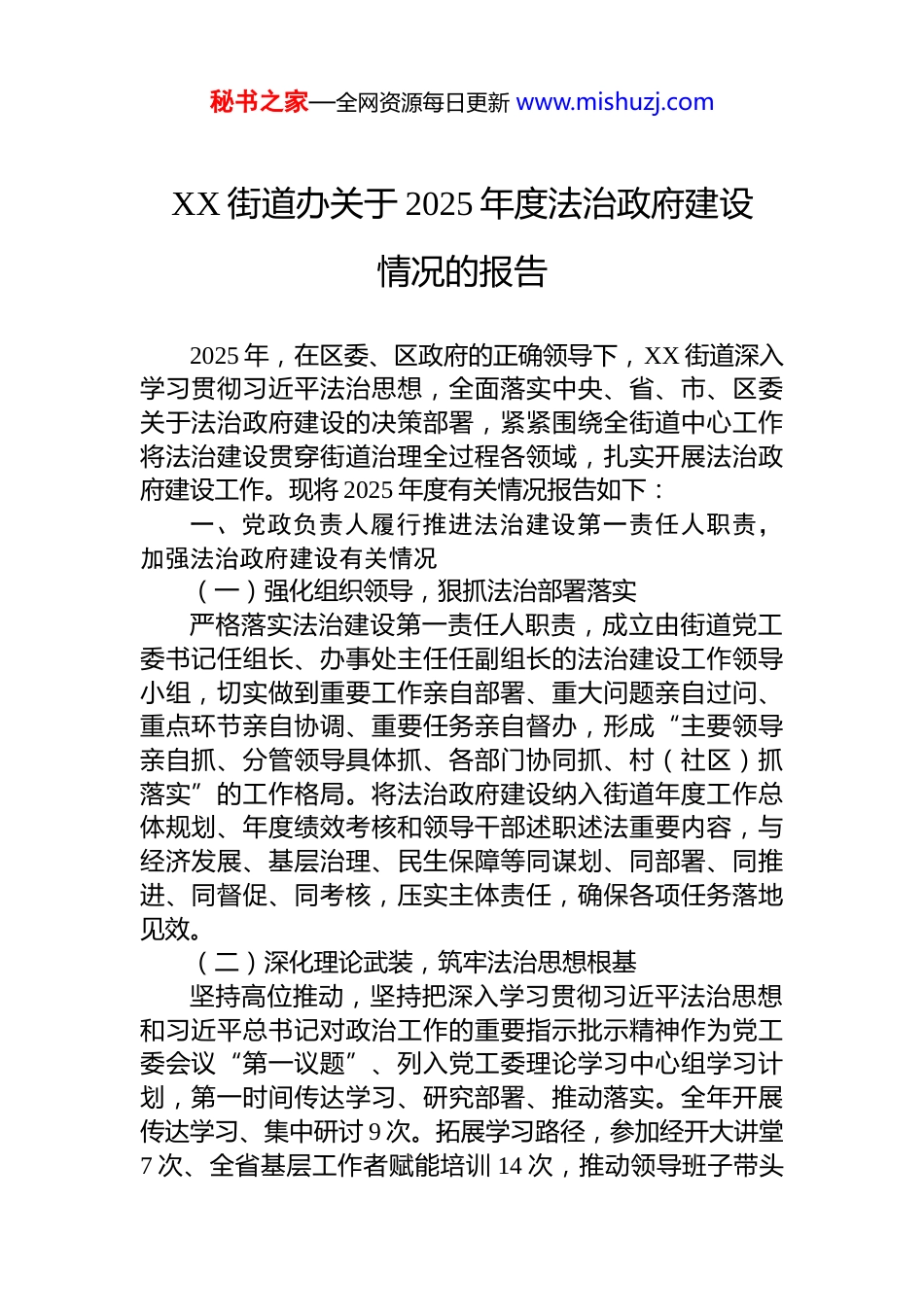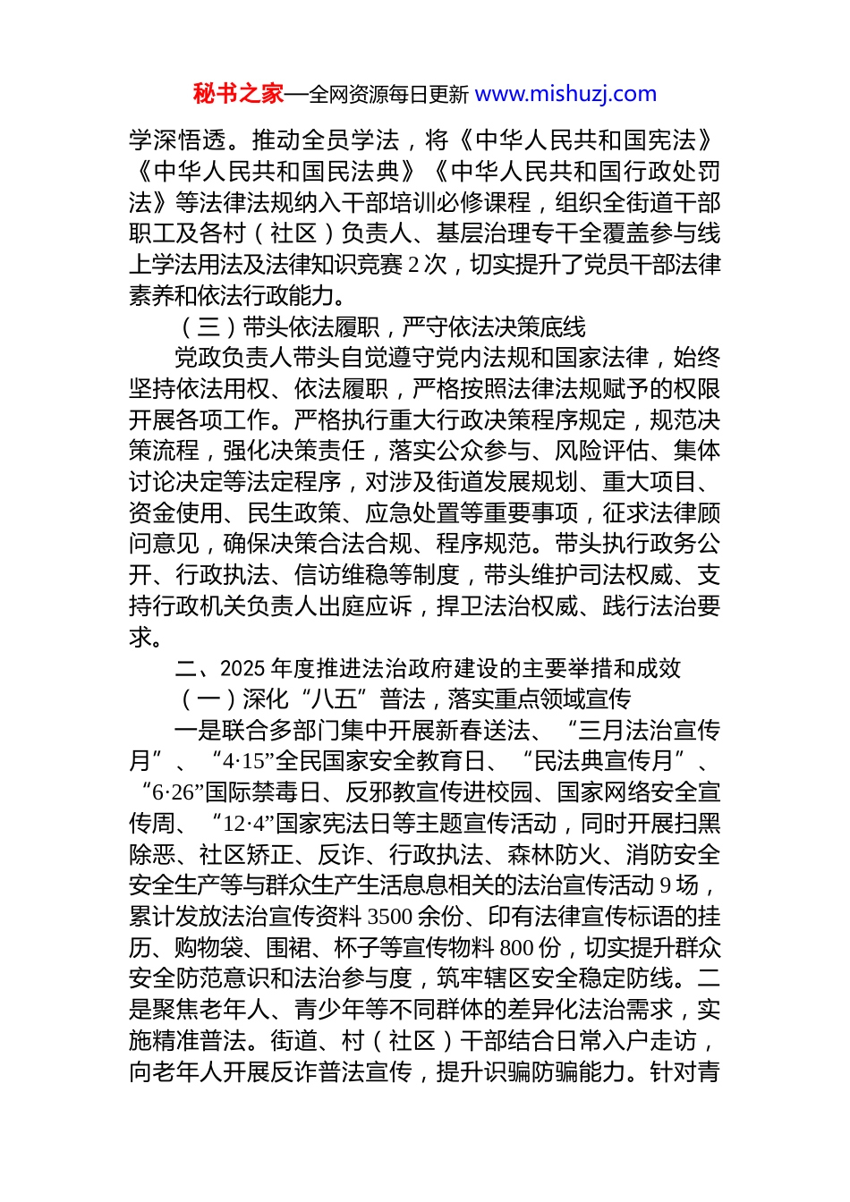 秘书之家—全网资源每日更新 www.mishuzj.comXX 街道办关于 2025 年度法治政府建设情况的报告2025 年,在区委、区政府的正确领导下,XX 街道深入学习贯彻习近平法治思想,全面落实中央、省、市、区委关于法治政府建设的决策部署,紧紧围绕全街道中心工作将法治建设贯穿街道治理全过程各领域,扎实开展法治政府建设工作。现将 2025 年度有关情况报告如下:一、党政负责人履行推进法治建设第一责任人职责,加强法治政府建设有关情况(一)强化组织领导,狠抓法治部署落实严格落实法治建设第一责任人职责,成立由街道党工委书记任组长、办事处主任任副组长的法治建设工作领导小组,切实做到重要工作亲自部署、重大问题亲自过问、重点环节亲自协调、重要任务亲自督办,形成“主要领导亲自抓、分管领导具体抓、各部门协同抓、村(社区)抓落实”的工作格局。将法治政府建设纳入街道年度工作总体规划、年度绩效考核和领导干部述职述法重要内容,与经济发展、基层治理、民生保障等同谋划、同部署、同推进、同督促、同考核,压实主体责任,确保各项任务落地见效。(二)深化理论武装,筑牢法治思想根基坚持高位推动,坚持把深入学习贯彻习近平法治思想和习近平总书记对政治工作的重要指示批示精神作为党工委会议“第一议题”、列入党工委理论学习中心组学习计划,第一时间传达学习、研究部署、推动落实。全年开展传达学习、集中研讨 9 次。拓展学习路径,参加经开大讲堂7 次、全省基层工作者赋能培训 14 次,推动领导班子带头秘书之家—全网资源每日更新 www.mishuzj.com学深悟透。推动全员学法,将《中华人民共和国宪法》《中华人民共和国民法典》《中华人民共和国行政处罚法》等法律法规纳入干部培训必修课程,组织全街道干部职工及各村(社区)负责人、基层治理专干全覆盖参与线上学法用法及法律知识竞赛 2 次,切实提升了党员干部法律素养和依法行政能力。(三)带头依法履职,严守依法决策底线党政负责人带头自觉遵守党内法规和国家法律,始终坚持依法用权、依法履职,严格按照法律法规赋予的权限开展各项工作。严格执行重大行政决策程序规定,规范决策流程,强化决策责任,落实公众参与、风险评估、集体讨论决定等法定程序,对涉及街道发展规划、重大项目、资金使用、民生政策、应急处置等重要事项,征求法律顾问意见,确保决策合法合规、程序规范。带头执行政务公开、行政执法、信访维稳等制度,带头维护司法权威、支持行政机关负责人出庭应诉,捍卫法治权威、践行法治要求。二、2025 年度推进法治政府建设的主要举措和成效(一)深化“八五”普法,落实重点领域宣传一是联合多部门集中开展新春送法、“三月法治宣传月”、“4·15”全民国家安全教育日、“民法典宣传月”、“6·26”国际禁毒日、反邪教宣传进校园、国家网络安全宣传周、“12·4”国家宪法日等主题宣传活动,同时开展扫黑除恶、社区矫正、反诈、行政执法、森林防火、消防安全安全生产等与群众生产生活息息相关的法治宣传活动 9 场,累计发放法治宣传资料 3500 余份、印有法律宣传标语的挂历、购物袋、围裙、杯子等宣传物料 800 份,切实提升群众安全防范意识和法治参与度,筑牢辖区安全稳定防线。二是聚焦老年人、青少年等不同群体的差异化法治需求,实施精准普法。街道、村(社区)干部结合日常入户走访,向老年人开展反诈普法宣传,提升识骗防骗能力。针对青秘书之家—全网资源每日更新 www.mishuzj.com少年开展反邪教宣传进校园、关工委开展暑期“法治明天伴我行”等活动,通过法治讲座等形式,厚植青少年法治意识。(二)加强队伍建设,提升行政执法效能组织 34 名行政执法人员参加线上法律法规解读、执法实务等业务培训 32.5 个课时,全面提升行政执法队伍专业素养和执法水平。严格执法资格管理,街道现有持证执法人员 34 名,均按照上级要求组织开展年度行政执法学习培训和行政执法考试,完成培训并考试通过的才能持证上岗严格规范执法,聚焦安全生产、消防安全、食品安全、环境卫生等重点领域,依法开展监管,做到严格规范公正文明执法。(三)深化政务公开,提升依法治理效能...