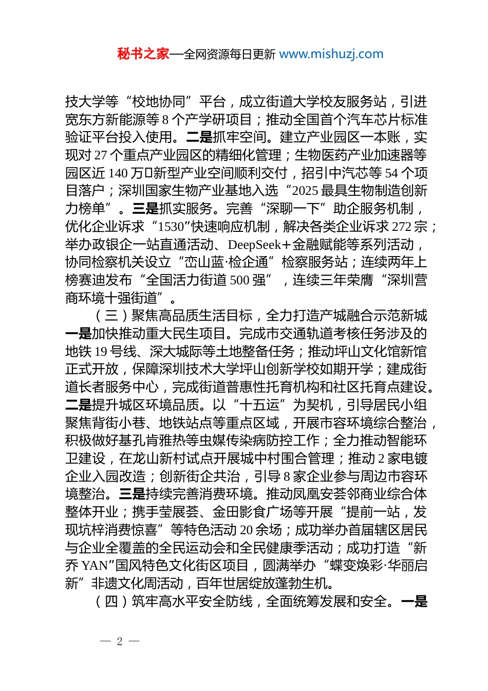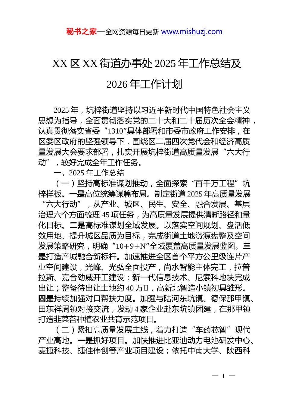 秘书之家—全网资源每日更新 www.mishuzj.comXX 区 XX 街道办事处 2025 年工作总结及2026 年工作计划2025 年,坑梓街道坚持以习近平新时代中国特色社会主义思想为指导,全面贯彻落实党的二十大和二十届历次全会精神,认真贯彻落实省委“1310”具体部署和市委市政府工作安排,在区委区政府的坚强领导下,围绕区二届四次党代会和经济高质量发展大会要求部署,扎实开展坑梓街道高质量发展“六大行动”,较好完成全年工作任务。一、2025 年工作总结(一)坚持高标准谋划推动,全面探索“百千万工程”坑梓样板。一是高位统筹谋篇布局。制定街道 2025 年高质量发展“六大行动”,从产业、城区、民生、安全、融合发展、基层治理六个方面梳理 45 项任务,为高质量发展提供清晰路径和量化目标。二是高标准谋划全域发展。以落实空间规划、盘活低效用地、提升城区品质为目标,完成街道土地资源盘整及空间发展策略研究,明确“10+9+N”全域覆盖高质量发展蓝图。三是打造产城融合新标杆。加速推进全区首个平方公里级连片产业空间建设,光峰、光弘全面投产,尚水智能主体完工,拉普拉斯、嘉合劲威开工建设;新一代信息技术、尼索科地块完成出让;整备待出让土地约 40 万㎡,高新北智造小镇初具雏形。四是持续加强对口帮扶力度。加强与陆河东坑镇、德保那甲镇、田东祥周镇对接交流,发动 4 家企业赴东坑镇团建,在那甲镇打造韭菜苔种植农业共育示范项目。(二)紧扣高质量发展主线,着力打造“车药芯智”现代产业高地。一是抓好项目。加快推进比亚迪动力电池研发中心、麦捷科技、捷佳伟创等产业项目建设;依托中南大学、陕西科— 1 —秘书之家—全网资源每日更新 www.mishuzj.com技大学等“校地协同”平台,成立街道大学校友服务站,引进宽东方新能源等 8 个产学研项目;推动全国首个汽车芯片标准验证平台投入使用。二是抓牢空间。建立产业园区一本账,实现对 27 个重点产业园区的精细化管理;生物医药产业加速器等园区近 140 万㎡新型产业空间顺利交付,招引中汽芯等 54 个项目落户;深圳国家生物产业基地入选“2025 最具生物制造创新力榜单”。三是抓实服务。完善“深聊一下”助企服务机制,优化企业诉求“1530”快速响应机制,解决各类企业诉求 272 宗;举办政银企一站直通活动、DeepSeek+金融赋能等系列活动,协同检察机关设立“峦山蓝·检企通”检察服务站;连续两年上榜赛迪发布“全国活力街道 500 强”,连续三年荣膺“深圳营商环境十强街道”。(三)聚焦高品质生活目标,全力打造产城融合示范新城一是加快推动重大民生项目。完成市交通轨道考核任务涉及的地铁 19 号线、深大城际等土地整备任务;推动坪山文化馆新馆正式开放,保障深圳技术大学坪山创新学校如期开学;建成街道长者服务中心,完成街道普惠性托育机构和社区托育点建设。二是提升城区环境品质。以“十五运”为契机,引导居民小组聚焦背街小巷、地铁站点等重点区域,开展市容环境综合整治,积极做好基孔肯雅热等虫媒传染病防控工作;全力推动智能环卫建设,在龙山新村试点开展城中村围合管理;推动 2 家电镀企业入园改造;创新街企共治,引导 8 家企业参与周边市容环境整治。三是持续完善消费环境。推动凤凰安荟邻商业综合体整体开业;携手莹展荟、金田影食广场等开展“提前一站,发现坑梓消费惊喜”等特色活动 20 余场;成功举办首届辖区居民与企业全覆盖的全民运动会和全民健康季活动;成功打造“新乔 YAN”国风特色文化街区项目,圆满举办“蝶变焕彩·华丽启新”非遗文化周活动,百年世居绽放蓬勃生机。(四)筑牢高水平安全防线,全面统筹发展和安全。一是— 2 —秘书之家—全网资源每日更新 www.mishuzj.com筑牢安全生产防线。完善安全管理“四个体系”,协助企业规范安全标识,指导企业完善安全生产责任体系;扎实开展规范涉企行政执法专项行动,创新“综合教一次”“预约式”指导服务,严格落实扫码入企;安全生产事故同比近三年平均值下降 62.5%。二是守牢信访维稳底线。率先完成“1+6+N”综治中心规范化建设,承办全区综治中心规范化建设暨“1+6+N”工作体系建设现场...