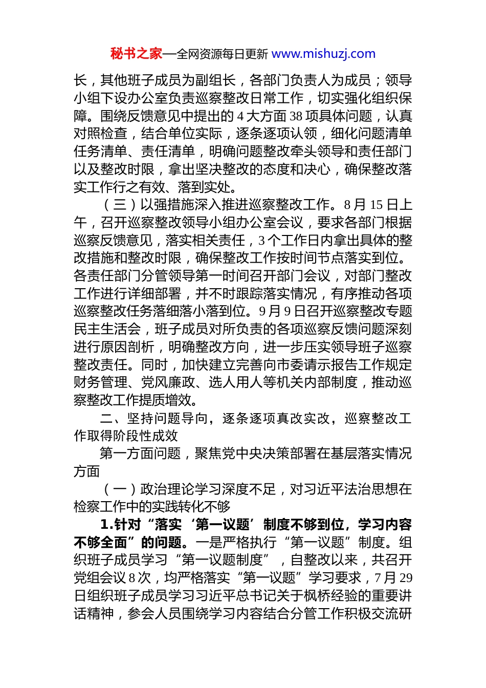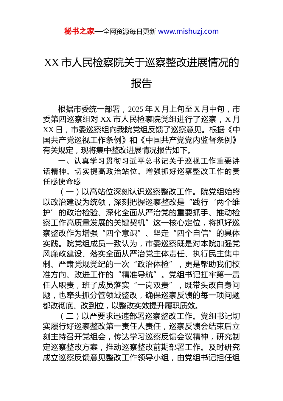 秘书之家—全网资源每日更新 www.mishuzj.comXX 市人民检察院关于巡察整改进展情况的报告根据市委统一部署,2025 年 X 月上旬至 X 月中旬,市委第四巡察组对 XX 市人民检察院党组进行了巡察,X 月XX 日,市委巡察组向我院党组反馈了巡察意见。根据《中国共产党巡视工作条例》和《中国共产党党内监督条例》有关规定,现将集中整改进展情况报告如下。一、认真学习贯彻习近平总书记关于巡视工作重要讲话精神,切实提高政治站位,增强抓好巡察整改工作的责任感使命感(一)以高站位深刻认识巡察整改工作。院党组始终以政治建设为统领,深刻把握巡察整改是“践行‘两个维护’的政治检验、深化全面从严治党的重要抓手、推动检察工作高质量发展的关键契机”这一核心定位,将抓好巡察整改作为增强“四个意识”、坚定“四个自信”的具体实践。院党组成员一致认为,市委巡察既是对本院加强党风廉政建设、落实全面从严治党主体责任、执行民主集中制、严肃党规党纪的一次“政治体检”,更是帮助我们校准方向、改进工作的“精准导航”。党组书记扛牢第一责任人职责,班子成员落实“一岗双责”,既带头改自身问题,也牵头抓分管领域整改,确保巡察反馈的每一项问题都改彻底、改到位,以整改实效提升履职质效。(二)以严要求迅速部署巡察整改工作。党组书记切实履行好巡察整改第一责任人责任,巡察反馈会结束后立刻主持召开党组会,传达学习巡察反馈会议精神,研究制定巡察整改方案,推动巡察整改前期部署工作。及时研究成立巡察反馈意见整改工作领导小组,由党组书记担任组秘书之家—全网资源每日更新 www.mishuzj.com长,其他班子成员为副组长,各部门负责人为成员;领导小组下设办公室负责巡察整改日常工作,切实强化组织保障。围绕反馈意见中提出的 4 大方面 38 项具体问题,认真对照检查,结合单位实际,逐条逐项认领,细化问题清单任务清单、责任清单,明确问题整改牵头领导和责任部门以及整改时限,拿出坚决整改的态度和决心,确保整改落实工作行之有效、落到实处。(三)以强措施深入推进巡察整改工作。8 月 15 日上午,召开巡察整改领导小组办公室会议,要求各部门根据巡察反馈意见,落实相关责任,3 个工作日内拿出具体的整改措施和整改时限,确保整改工作按时间节点落实到位。各责任部门分管领导第一时间召开部门会议,对部门整改工作进行详细部署,并不时跟踪落实情况,有序推动各项巡察整改任务落细落小落到位。9 月 9 日召开巡察整改专题民主生活会,班子成员对所负责的各项巡察反馈问题深刻进行原因剖析,明确整改方向,进一步压实领导班子巡察整改责任。同时,加快建立完善向市委请示报告工作规定财务管理、党风廉政、选人用人等机关内部制度,推动巡察整改工作提质增效。二、坚持问题导向,逐条逐项真改实改,巡察整改工作取得阶段性成效第一方面问题,聚焦党中央决策部署在基层落实情况方面(一)政治理论学习深度不足,对习近平法治思想在检察工作中的实践转化不够1.针对“落实‘第一议题’制度不够到位,学习内容不够全面”的问题。一是严格执行“第一议题”制度。组织班子成员学习“第一议题制度”,自整改以来,共召开党组会议 8 次,均严格落实“第一议题”学习要求,7 月 29日组织班子成员学习习近平总书记关于枫桥经验的重要讲话精神,参会人员围绕学习内容结合分管工作积极交流研秘书之家—全网资源每日更新 www.mishuzj.com讨,有效提升检察人员运用“枫桥经验”化解矛盾纠纷的能力水平;二是政治部每月根据上级党组织党建工作指示梳理习近平总书记最新重要讲话和重要指示批示精神、党中央重大决策部署以及《习近平谈治国理政》等内容,形成当月学习建议清单,保障学习内容的时效性与针对性;三是安排专人负责详细记录学习内容、讨论要点发言及工作安排,并与会议资料一并存档,确保学习过程可追溯、学习成效有迹可循,目前已完整存档 8 次“第一议题”学习记录。2.针对“党组理论学习中心组学习有偏差,理论学习成效不明显”的问题。一是组织中心组成员学习《中国共产党党委(党组)理论学习中心组学习规则》,熟悉《规则》要求,纠正...