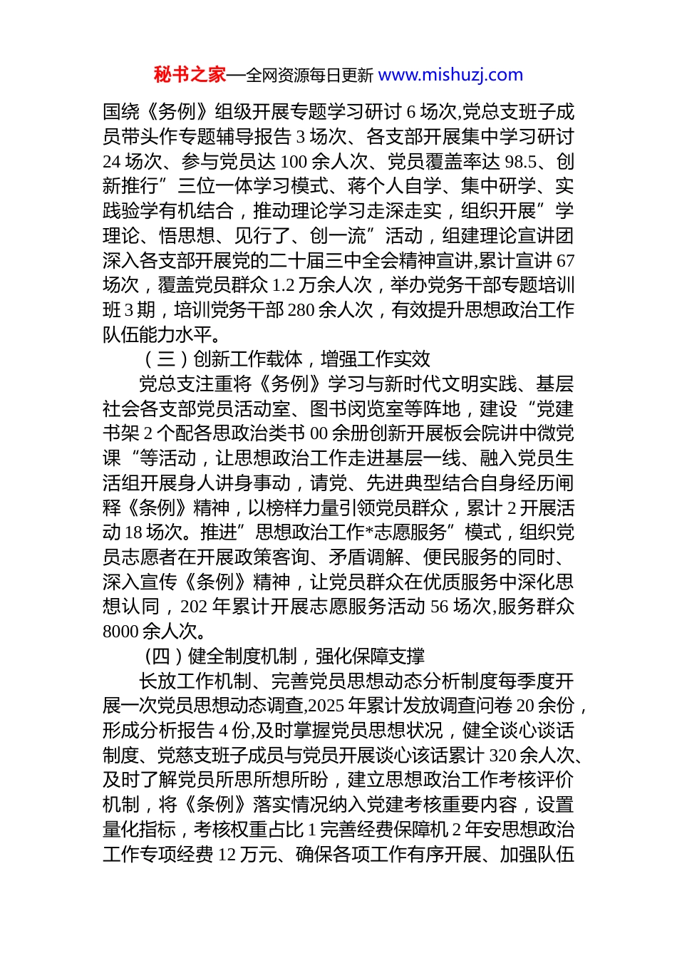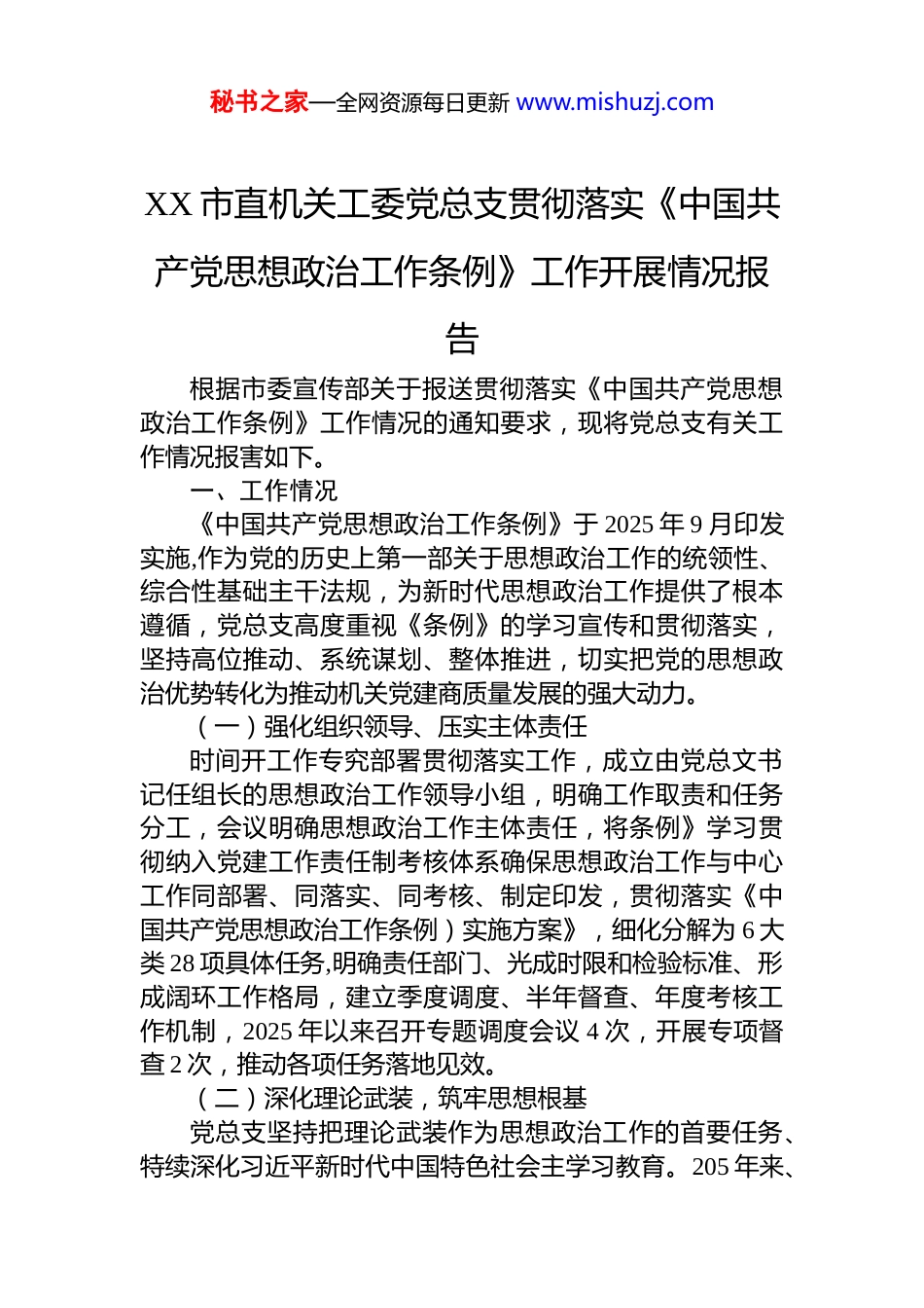 秘书之家—全网资源每日更新 www.mishuzj.comXX 市直机关工委党总支贯彻落实《中国共产党思想政治工作条例》工作开展情况报告根据市委宣传部关于报送贯彻落实《中国共产党思想政治工作条例》工作情况的通知要求,现将党总支有关工作情况报害如下。一、工作情况《中国共产党思想政治工作条例》于 2025 年 9 月印发实施,作为党的历史上第一部关于思想政治工作的统领性、综合性基础主干法规,为新时代思想政治工作提供了根本遵循,党总支高度重视《条例》的学习宣传和贯彻落实,坚持高位推动、系统谋划、整体推进,切实把党的思想政治优势转化为推动机关党建商质量发展的强大动力。(一)强化组织领导、压实主体责任时间开工作专究部署贯彻落实工作,成立由党总文书记任组长的思想政治工作领导小组,明确工作取责和任务分工,会议明确思想政治工作主体责任,将条例》学习贯彻纳入党建工作责任制考核体系确保思想政治工作与中心工作同部署、同落实、同考核、制定印发,贯彻落实《中国共产党思想政治工作条例)实施方案》,细化分解为 6 大类 28 项具体任务,明确责任部门、光成时限和检验标准、形成阔环工作格局,建立季度调度、半年督查、年度考核工作机制,2025 年以来召开专题调度会议 4 次,开展专项督查 2 次,推动各项任务落地见效。(二)深化理论武装,筑牢思想根基党总支坚持把理论武装作为思想政治工作的首要任务、特续深化习近平新时代中国特色社会主学习教育。205 年来、秘书之家—全网资源每日更新 www.mishuzj.com国绕《务例》组级开展专题学习研讨 6 场次,党总支班子成员带头作专题辅导报告 3 场次、各支部开展集中学习研讨24 场次、参与党员达 100 余人次、党员覆盖率达 98.5、创新推行”三位一体学习模式、蒋个人自学、集中研学、实践验学有机结合,推动理论学习走深走实,组织开展”学理论、悟思想、见行了、创一流”活动,组建理论宣讲团深入各支部开展党的二十届三中全会精神宣讲,累计宣讲 67场次,覆盖党员群众 1.2 万余人次,举办党务干部专题培训班 3 期,培训党务干部 280 余人次,有效提升思想政治工作队伍能力水平。(三)创新工作载体,增强工作实效党总支注重将《务例》学习与新时代文明实践、基层社会各支部党员活动室、图书闵览室等阵地,建设“党建书架 2 个配各思政治类书 00 余册创新开展板会院讲中微党课“等活动,让思想政治工作走进基层一线、融入党员生活组开展身人讲身事动,请党、先进典型结合自身经历闸释《条例》精神,以榜样力量引领党员群众,累计 2 开展活动 18 场次。推进”思想政治工作*志愿服务”模式,组织党员志愿者在开展政策客询、矛盾调解、便民服务的同时、深入宣传《条例》精神,让党员群众在优质服务中深化思想认同,202 年累计开展志愿服务活动 56 场次,服务群众8000 余人次。 (四)健全制度机制,强化保障支撑长放工作机制、完善党员思想动态分析制度每季度开展一次党员思想动态调查,2025 年累计发放调查问卷 20 余份,形成分析报告 4 份,及时掌握党员思想状况,健全谈心谈话制度、党慈支班子成员与党员开展谈心该话累计 320 余人次、及时了解党员所思所想所盼,建立思想政治工作考核评价机制,将《条例》落实情况纳入党建考核重要内容,设置量化指标,考核权重占比 1 完善经费保障机 2 年安思想政治工作专项经费 12 万元、确保各项工作有序开展、加强队伍秘书之家—全网资源每日更新 www.mishuzj.com建设,配备专兼职愿想政治工作人员 8 名,组织开展业务培训 4 场次,队伍专业化水平不断提升。(五)服务中心大局,推动融合发展党总支坚持把思想政治工作与中心工作深度融合,引导党员高质量发展中发挥先锋模范作用,深化模苑机关创建特思想政治工作作为重要内容纳入创建标准,推动创建工作走深走实。加强意识形态阵地管理,定期分析研判意识形态领域情况,2025 年开展意识形态专项检查 3 次,未发生意识形态领域问题,推进清康机关建设,开展警示教育活动 6 场次,受教育党员干部达 600 余人次、营造风清气正的政治生态。二、存在问题国在总结成绩...