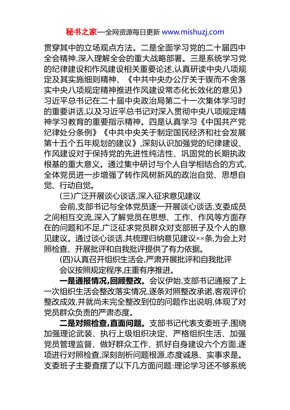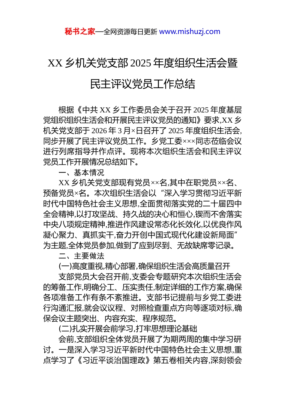 秘书之家—全网资源每日更新 www.mishuzj.comXX 乡机关党支部 2025 年度组织生活会暨民主评议党员工作总结根据《中共 XX 乡工作委员会关于召开 2025 年度基层党组织组织生活会和开展民主评议党员的通知》要求,XX 乡机关党支部于 2026 年 3 月×日召开了 2025 年度组织生活会,同步开展了民主评议党员工作。乡党工委×××同志莅临会议进行列席指导并作点评。现将本次组织生活会和民主评议党员工作开展情况总结如下。一、基本情况XX 乡机关党支部现有党员××名,其中在职党员××名、预备党员×名。本次组织生活会以“深入学习贯彻习近平新时代中国特色社会主义思想,全面贯彻落实党的二十届四中全会精神,以打攻坚战、持久战的决心和恒心,锲而不舍落实中央八项规定精神,推进作风建设常态化长效化,以优良作风凝心聚力、真抓实干,奋力开创中国式现代化建设新局面”为主题,全体党员参加,做到了应到尽到、无故缺席零记录。二、主要做法(一)高度重视,精心部署,确保组织生活会高质量召开支部党员大会召开前,支委会专题研究本次组织生活会的筹备工作,明确分工、压实责任,制定详细的工作方案,确保各项准备工作有条不紊推进。支部书记提前与乡党工委进行沟通汇报,就会议议程、对照检查重点方向等逐项对标,确保会议主题突出、内容充实、程序规范。(二)扎实开展会前学习,打牢思想理论基础会前,支部组织全体党员开展了为期两周的集中学习研讨。一是深入学习习近平新时代中国特色社会主义思想,重点学习了《习近平谈治国理政》第五卷相关内容,深刻领会秘书之家—全网资源每日更新 www.mishuzj.com贯穿其中的立场观点方法。二是全面学习党的二十届四中全会精神,深入理解全会的重大战略部署。三是系统学习党的纪律建设和作风建设相关重要论述,认真研读中央八项规定及其实施细则精神、《中共中央办公厅关于锲而不舍落实中央八项规定精神推进作风建设常态化长效化的意见》习近平总书记在二十届中央政治局第二十一次集体学习时的重要讲话,以及习近平总书记对深入贯彻中央八项规定精神学习教育的重要指示精神。四是认真学习《中国共产党纪律处分条例》《中共中央关于制定国民经济和社会发展第十五个五年规划的建议》,深刻认识加强党的纪律建设、作风建设对于保持党的先进性纯洁性、巩固党的长期执政根基的重大意义。通过集中研讨与个人自学相结合的方式,全体党员进一步增强了转作风树新风的政治自觉、思想自觉、行动自觉。(三)广泛开展谈心谈话,深入征求意见建议会前,支部书记与全体党员逐一开展谈心谈话,支委成员之间相互交流,深入了解党员在思想、工作、作风等方面存在的问题和不足,广泛征求党员群众对支部班子及个人的意见建议。通过谈心谈话,共梳理归纳意见建议××条,为会上对照检查、开展批评和自我批评提供了有力依据。(四)认真召开组织生活会,严肃开展批评和自我批评会议按照规定程序,庄重有序推进。一是通报情况,回顾整改。会议伊始,支部书记通报了上一次组织生活会整改落实情况,逐条对照整改承诺,客观评价整改成效,并就尚未完全整改到位的问题作出说明,体现了对党员群众负责的严肃态度。二是对照检查,直面问题。支部书记代表支委班子,围绕加强理论武装、执行上级组织决定、严格组织生活、加强党员管理监督、做好群众工作、抓好自身建设六个方面,逐项进行对照检查,深刻剖析问题根源,态度诚恳、实事求是。支委班子主要查摆了以下几方面问题:理论学习还不够系统秘书之家—全网资源每日更新 www.mishuzj.com深入,学用结合的自觉性有待进一步提升;党支部组织生活的质量和吸引力有待增强,党员参与的主动性有待调动;服务群众的工作方法还不够灵活,联系群众的渠道和方式有待拓展;对中央八项规定精神的贯彻落实,还存在个别细节上执行不够严格的问题,需要进一步强化日常监督。三是党员发言,自我批评。全体党员围绕学习贯彻党的创新理论、加强党性锻炼、联系服务群众、发挥先锋模范作用、改作风树新风等方面,逐一开展批评和自我批评。党员们普遍反映,自身存在学习不够主动深入、工作中创新意识不强、联系群众不够密切、在一些细节上落实八项规定精神还不到位等问题。相互批评方面,党员们...