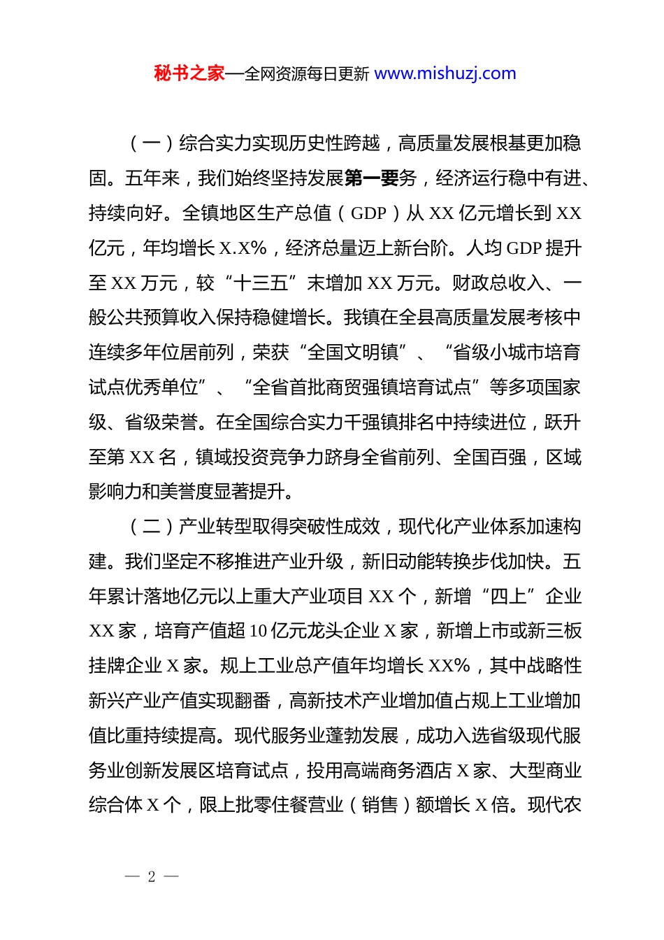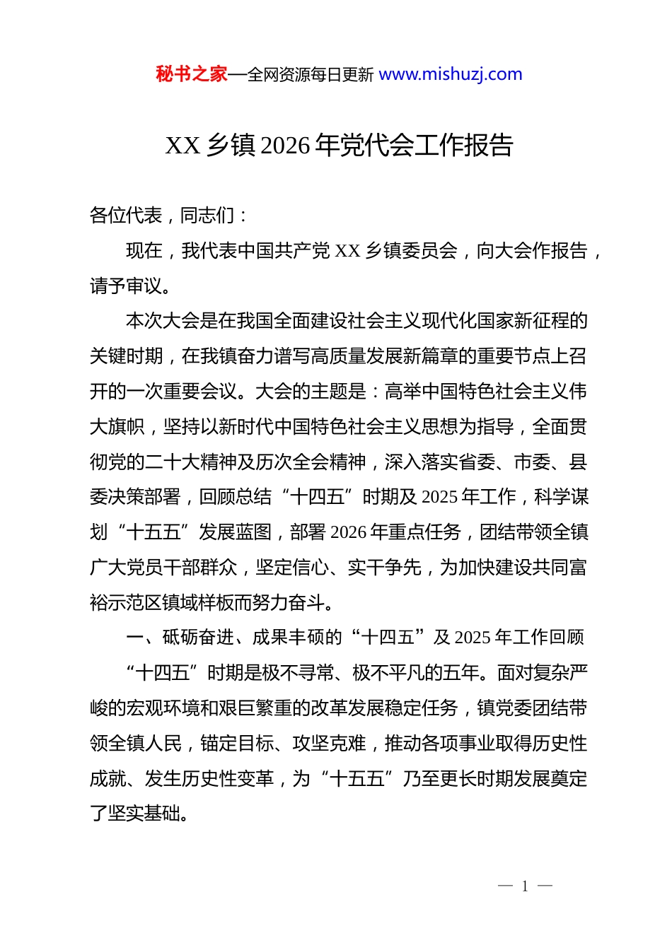 秘书之家—全网资源每日更新 www.mishuzj.comXX 乡镇 2026 年党代会工作报告各位代表,同志们:现在,我代表中国共产党 XX 乡镇委员会,向大会作报告,请予审议。本次大会是在我国全面建设社会主义现代化国家新征程的关键时期,在我镇奋力谱写高质量发展新篇章的重要节点上召开的一次重要会议。大会的主题是:高举中国特色社会主义伟大旗帜,坚持以新时代中国特色社会主义思想为指导,全面贯彻党的二十大精神及历次全会精神,深入落实省委、市委、县委决策部署,回顾总结“十四五”时期及 2025 年工作,科学谋划“十五五”发展蓝图,部署 2026 年重点任务,团结带领全镇广大党员干部群众,坚定信心、实干争先,为加快建设共同富裕示范区镇域样板而努力奋斗。一、砥砺奋进、成果丰硕的“十四五”及 2025 年工作回顾“十四五”时期是极不寻常、极不平凡的五年。面对复杂严峻的宏观环境和艰巨繁重的改革发展稳定任务,镇党委团结带领全镇人民,锚定目标、攻坚克难,推动各项事业取得历史性成就、发生历史性变革,为“十五五”乃至更长时期发展奠定了坚实基础。— 1 —秘书之家—全网资源每日更新 www.mishuzj.com(一)综合实力实现历史性跨越,高质量发展根基更加稳固。五年来,我们始终坚持发展第一要务,经济运行稳中有进、持续向好。全镇地区生产总值(GDP)从 XX 亿元增长到 XX亿元,年均增长 X.X%,经济总量迈上新台阶。人均 GDP 提升至 XX 万元,较“十三五”末增加 XX 万元。财政总收入、一般公共预算收入保持稳健增长。我镇在全县高质量发展考核中连续多年位居前列,荣获“全国文明镇”、“省级小城市培育试点优秀单位”、“全省首批商贸强镇培育试点”等多项国家级、省级荣誉。在全国综合实力千强镇排名中持续进位,跃升至第 XX 名,镇域投资竞争力跻身全省前列、全国百强,区域影响力和美誉度显著提升。(二)产业转型取得突破性成效,现代化产业体系加速构建。我们坚定不移推进产业升级,新旧动能转换步伐加快。五年累计落地亿元以上重大产业项目 XX 个,新增“四上”企业XX 家,培育产值超 10 亿元龙头企业 X 家,新增上市或新三板挂牌企业 X 家。规上工业总产值年均增长 XX%,其中战略性新兴产业产值实现翻番,高新技术产业增加值占规上工业增加值比重持续提高。现代服务业蓬勃发展,成功入选省级现代服务业创新发展区培育试点,投用高端商务酒店 X 家、大型商业综合体 X 个,限上批零住餐营业(销售)额增长 X 倍。现代农— 2 —秘书之家—全网资源每日更新 www.mishuzj.com业提质增效,特色农业品牌影响力不断扩大。低效用地再开发成效显著,完成率位居全县首位,为产业发展腾出了宝贵空间。(三)城乡面貌发生系统性蝶变,美丽宜居家园魅力彰显我们深入实施新型城镇化和乡村振兴战略,城乡融合发展格局初步形成。高标准推进 XX 新城、XX 高铁新城等重点片区开发,累计实施重大基础设施和城市功能项目 XX 个,完成投资超 XX亿元。建成 XX 公园、XX 公园等一批精品民生工程,滨江商务区、中央活力区初具雏形。“四好农村路”建设扎实推进,新改建农村公路 XX 公里,城乡交通网络更加便捷。全域开展城乡环境综合整治,成功创成省级现代化美丽城镇示范乡镇。农村人居环境持续改善,美丽乡村建设亮点纷呈,绘就了一幅“镇村一体、各美其美”的崭新画卷。(四)改革创新打造标志性成果,发展内生动力持续增强我们坚持以改革破难题、以创新促发展,发展活力竞相迸发。重点领域改革纵深推进,多项试点经验获省、市推广。创新平台能级提升,XX 实验室建成投用并跻身市级新型研发机构行列,与 XX 大学等高校院所合作深化。创新主体不断壮大,五年新增国家高新技术企业 XX 家、省级科技型中小企业 XX 家、省级“专精特新”中小企业 X 家。人才引育成效显著,累计引进培育省级领军人才、市级高层次人才 X 人,大学生和技能人— 3 —秘书之家—全网资源每日更新 www.mishuzj.com才引进数量位居全县前列。对外开放水平提升,实际利用外资累计达 XX 万美元,约占全县总量 XX%,外贸进出口保持稳定增长。...