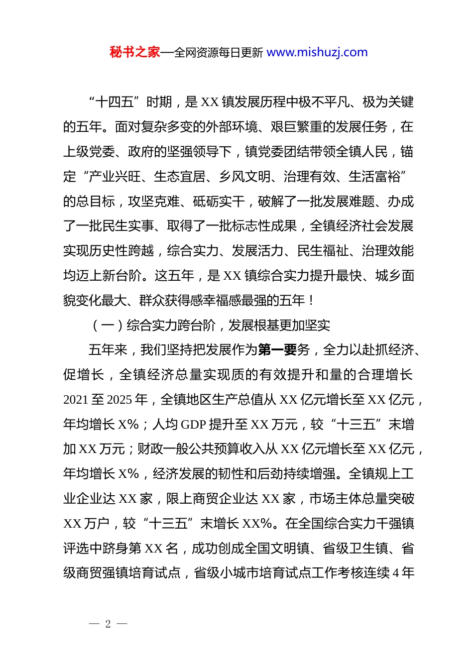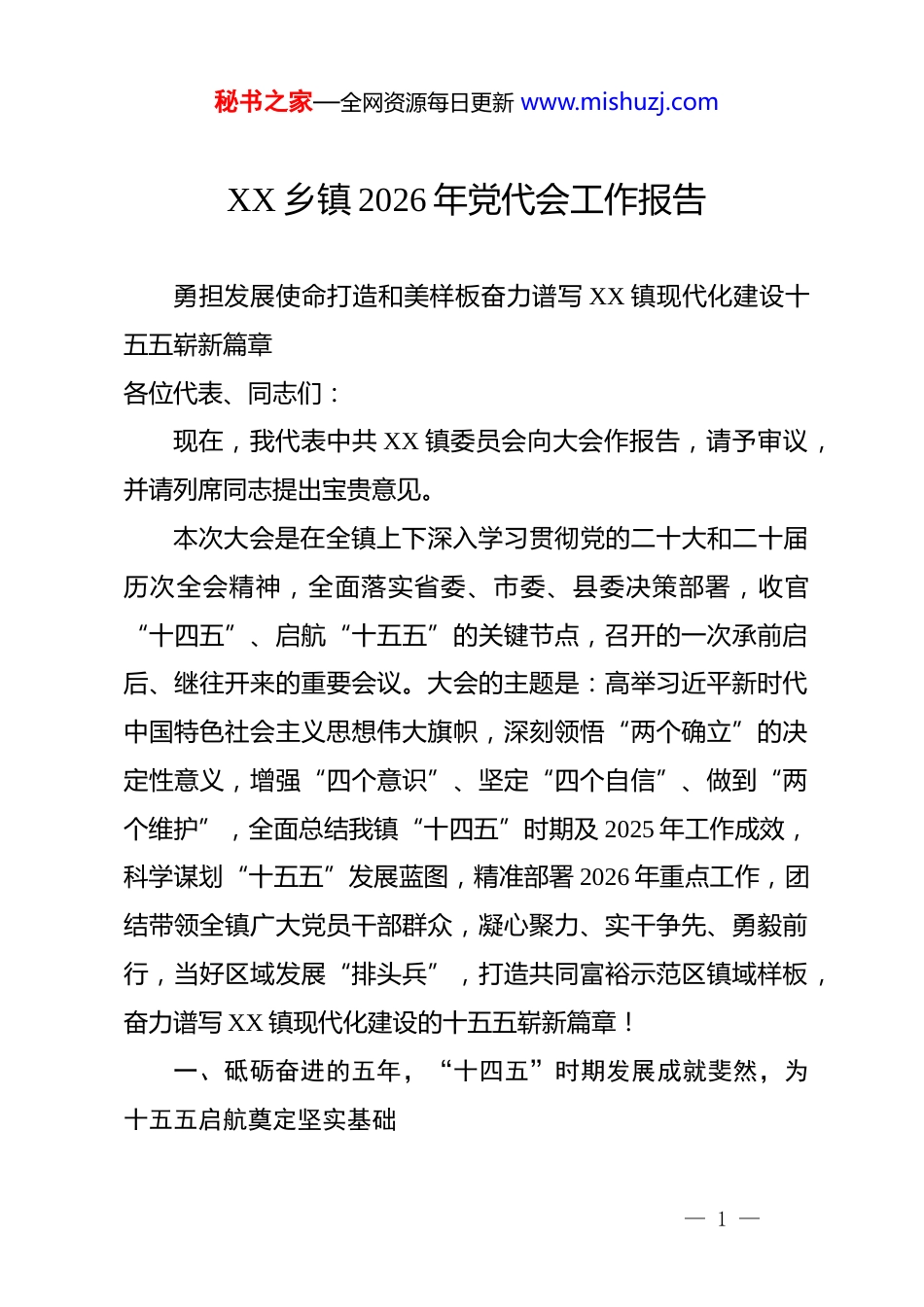 秘书之家—全网资源每日更新 www.mishuzj.comXX 乡镇 2026 年党代会工作报告勇担发展使命打造和美样板奋力谱写 XX 镇现代化建设十五五崭新篇章各位代表、同志们:现在,我代表中共 XX 镇委员会向大会作报告,请予审议,并请列席同志提出宝贵意见。本次大会是在全镇上下深入学习贯彻党的二十大和二十届历次全会精神,全面落实省委、市委、县委决策部署,收官“十四五”、启航“十五五”的关键节点,召开的一次承前启后、继往开来的重要会议。大会的主题是:高举习近平新时代中国特色社会主义思想伟大旗帜,深刻领悟“两个确立”的决定性意义,增强“四个意识”、坚定“四个自信”、做到“两个维护”,全面总结我镇“十四五”时期及 2025 年工作成效,科学谋划“十五五”发展蓝图,精准部署 2026 年重点工作,团结带领全镇广大党员干部群众,凝心聚力、实干争先、勇毅前行,当好区域发展“排头兵”,打造共同富裕示范区镇域样板,奋力谱写 XX 镇现代化建设的十五五崭新篇章!一、砥砺奋进的五年,“十四五”时期发展成就斐然,为十五五启航奠定坚实基础— 1 —秘书之家—全网资源每日更新 www.mishuzj.com“十四五”时期,是 XX 镇发展历程中极不平凡、极为关键的五年。面对复杂多变的外部环境、艰巨繁重的发展任务,在上级党委、政府的坚强领导下,镇党委团结带领全镇人民,锚定“产业兴旺、生态宜居、乡风文明、治理有效、生活富裕”的总目标,攻坚克难、砥砺实干,破解了一批发展难题、办成了一批民生实事、取得了一批标志性成果,全镇经济社会发展实现历史性跨越,综合实力、发展活力、民生福祉、治理效能均迈上新台阶。这五年,是 XX 镇综合实力提升最快、城乡面貌变化最大、群众获得感幸福感最强的五年!(一)综合实力跨台阶,发展根基更加坚实五年来,我们坚持把发展作为第一要务,全力以赴抓经济、促增长,全镇经济总量实现质的有效提升和量的合理增长2021 至 2025 年,全镇地区生产总值从 XX 亿元增长至 XX 亿元,年均增长 X%;人均 GDP 提升至 XX 万元,较“十三五”末增加 XX 万元;财政一般公共预算收入从 XX 亿元增长至 XX 亿元,年均增长 X%,经济发展的韧性和后劲持续增强。全镇规上工业企业达 XX 家,限上商贸企业达 XX 家,市场主体总量突破XX 万户,较“十三五”末增长 XX%。在全国综合实力千强镇评选中跻身第 XX 名,成功创成全国文明镇、省级卫生镇、省级商贸强镇培育试点,省级小城市培育试点工作考核连续 4 年— 2 —秘书之家—全网资源每日更新 www.mishuzj.com获评优秀单位,镇域投资竞争力位居全省第 XX、全国第 XX 名,XX 镇的区域影响力和美誉度显著提升。(二)产业发展破瓶颈,转型动能持续增强五年来,我们坚持产业兴镇、实业强镇,立足镇域资源禀赋,推动产业结构优化升级,构建起“农业固本、工业强基、三产赋能”的多元产业体系。农业现代化水平显著提升,建成高标准农田 XX 万亩,粮食播种面积稳定在 XX 万亩以上,粮食年产量达 XX 万吨,成功培育 XX 特色农产品品牌 XX 个,其中省级名牌农产品 XX 个,农业产业化联合体达 XX 家,农产品加工转化率提升至 XX%,获评省级农产品质量安全示范镇。工业发展提质增效,落地亿元以上产业项目 XX 个,新增“四上”企业 XX 家、产值 10 亿元以上企业 XX 家,建成 XX 工业园区、XX 都市型产业园等产业平台,规上工业总产值年均增长 X%,战略性新兴产业产值实现翻番,高端装备、新材料、绿色食品等新兴产业逐步成为工业发展新引擎。现代服务业蓬勃发展,入选全省第二批现代服务业创新发展区培育试点,投用商业综合体 XX 个、星级酒店 XX 家、乡村旅游综合体 XX 个,限上批零住餐营业(销售)额较“十三五”末增长 5 倍,电商、物流、康养等新业态快速崛起,全镇电商年交易额突破 XX 亿元,产业发展的协同性和竞争力显著提升。— 3 —秘书之家—全网资源每日更新 www.mishuzj.com(三)城乡融合促蝶变,人居品质显著提升五年来,我们坚持城乡一体化发展,以美丽乡村建设为抓手,以基础设施提档升级为支撑...