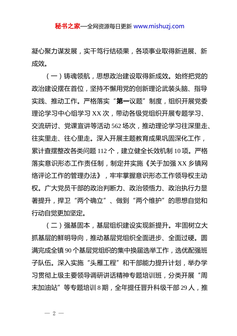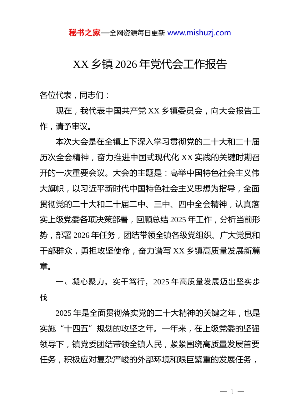 秘书之家—全网资源每日更新 www.mishuzj.comXX 乡镇 2026 年党代会工作报告各位代表,同志们:现在,我代表中国共产党 XX 乡镇委员会,向大会报告工作,请予审议。本次大会是在全镇上下深入学习贯彻党的二十大和二十届历次全会精神,奋力推进中国式现代化 XX 实践的关键时期召开的一次重要会议。大会的主题是:高举中国特色社会主义伟大旗帜,以习近平新时代中国特色社会主义思想为指导,全面贯彻党的二十大和二十届二中、三中、四中全会精神,认真落实上级党委各项决策部署,回顾总结 2025 年工作,分析当前形势,部署 2026 年任务,团结带领全镇各级党组织、广大党员和干部群众,勇担攻坚使命,奋力谱写 XX 乡镇高质量发展新篇章。一、凝心聚力,实干笃行,2025 年高质量发展迈出坚实步伐2025 年是全面贯彻落实党的二十大精神的关键之年,也是实施“十四五”规划的攻坚之年。一年来,在上级党委的坚强领导下,镇党委团结带领全镇人民,紧紧围绕高质量发展首要任务,积极应对复杂严峻的外部环境和艰巨繁重的发展任务,— 1 —秘书之家—全网资源每日更新 www.mishuzj.com凝心聚力谋发展,实干笃行结硕果,各项事业取得新进展、新成效。(一)铸魂领航,思想政治建设取得新成效。始终把党的政治建设摆在首位,坚持不懈用党的创新理论武装头脑、指导实践、推动工作。严格落实“第一议题”制度,组织开展党委理论学习中心组学习 XX 次,带动各级党组织开展专题学习、交流研讨、党课宣讲等活动 562 场次,推动理论学习往深里走、往实里走、往心里走。深入开展主题教育成果巩固深化工作,累计查摆整改各类问题 112 个,建立健全长效机制 10 项。严格落实意识形态工作责任制,制定并实施《关于加强 XX 乡镇网络评论工作的管理办法》,牢牢掌握意识形态工作领导权主动权。广大党员干部的政治判断力、政治领悟力、政治执行力显著提升,捍卫“两个确立”、做到“两个维护”的思想自觉和行动自觉更加坚定。(二)强基固本,基层组织建设实现新提升。牢固树立大抓基层的鲜明导向,推动基层党组织全面进步、全面过硬。圆满完成全镇 90 个基层党组织的集中换届选举工作,选优配强班子队伍。深入实施“头雁工程”和干部能力提升计划,举办学习贯彻上级主要领导调研讲话精神专题培训班,分类开展“周末加油站”等专题培训 8 期,全年提任晋升科级干部 29 人,推— 2 —秘书之家—全网资源每日更新 www.mishuzj.com动 16 名优秀年轻干部进行跨部门、跨领域挂职交流,干部队伍活力有效激发。严格党员发展和管理,全年发展新党员 8 名,按期转正 17 名,党员队伍结构持续优化。深化“一支部一品牌”创建,推动党建工作与中心工作深度融合。(三)正风肃纪,全面从严治党展现新作为。坚决扛起管党治党政治责任,纵深推进党风廉政建设和反腐败斗争。高质量完成上级巡察反馈意见整改,落实整改措施 231 条,修订完善制度机制 10 项,做好巡察“后半篇文章”。精准运用监督执纪“四种形态”,依规依纪依法给予党纪政务处分 14 人,开展诫勉谈话、提醒谈话 10 人次,抓早抓小、防微杜渐。坚持严管和厚爱结合、激励和约束并重,认真落实“三个区分开来”要求,为 2 名在改革探索、推动发展中出于公心、担当作为而出现工作失误的干部予以容错免责,旗帜鲜明地为敢于担当、踏实做事的干部撑腰鼓劲,营造了风清气正、干事创业的良好政治生态。(四)践行民主,全过程人民民主彰显新效能。坚持党的领导、人民当家作主、依法治国有机统一,不断丰富民主形式,拓宽民主渠道。打造“石榴籽 e 家”等特色品牌,促进民族团结,联动高校开展“名企探岗”等活动,助力青年就业。高质量完成武装部规范化建设,成功创建三星级基层武装部,全年— 3 —秘书之家—全网资源每日更新 www.mishuzj.com选送 2 名优秀青年光荣入伍。工会、共青团、妇联等群团组织桥梁纽带作用充分发挥,常态化开展“四季关爱”、职工劳动技能竞赛等活动,完成四个街区妇联组建及“活水园区”妇女组织覆盖工作,最广泛地凝聚了社会各界共识和力量。(五)聚焦发展,经济综合实力...