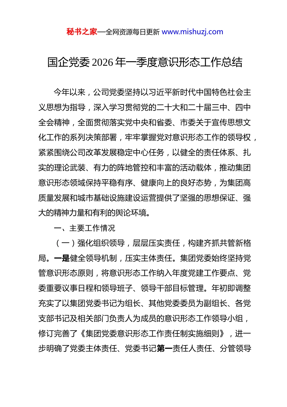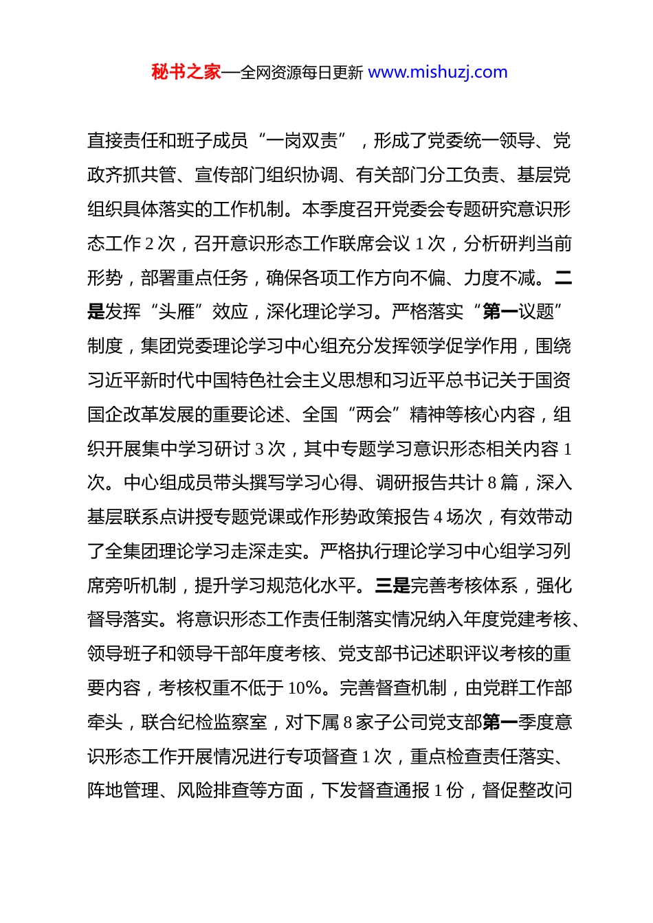 秘书之家—全网资源每日更新 www.mishuzj.com国企党委 2026 年一季度意识形态工作总结 今年以来,公司党委坚持以习近平新时代中国特色社会主义思想为指导,深入学习贯彻党的二十大和二十届三中、四中全会精神,全面贯彻落实党中央和省委、市委关于宣传思想文化工作的系列决策部署,牢牢掌握党对意识形态工作的领导权,紧紧围绕公司改革发展稳定中心任务,以健全的责任体系、扎实的理论武装、有力的阵地管控和丰富的活动载体,推动集团意识形态领域保持平稳有序、健康向上的良好态势,为集团高质量发展和城市基础设施建设运营提供了坚强的思想保证、强大的精神力量和有利的舆论环境。一、主要工作情况(一)强化组织领导,层层压实责任,构建齐抓共管新格局。一是健全领导机制,压实主体责任。集团党委始终坚持党管意识形态原则,将意识形态工作纳入年度党建工作要点、党委重要议事日程和领导班子、领导干部目标管理。年初即调整充实了以集团党委书记为组长、其他党委委员为副组长、各党支部书记及相关部门负责人为成员的意识形态工作领导小组,修订完善了《集团党委意识形态工作责任制实施细则》,进一步明确了党委主体责任、党委书记第一责任人责任、分管领导秘书之家—全网资源每日更新 www.mishuzj.com直接责任和班子成员“一岗双责”,形成了党委统一领导、党政齐抓共管、宣传部门组织协调、有关部门分工负责、基层党组织具体落实的工作机制。本季度召开党委会专题研究意识形态工作 2 次,召开意识形态工作联席会议 1 次,分析研判当前形势,部署重点任务,确保各项工作方向不偏、力度不减。二是发挥“头雁”效应,深化理论学习。严格落实“第一议题”制度,集团党委理论学习中心组充分发挥领学促学作用,围绕习近平新时代中国特色社会主义思想和习近平总书记关于国资国企改革发展的重要论述、全国“两会”精神等核心内容,组织开展集中学习研讨 3 次,其中专题学习意识形态相关内容 1次。中心组成员带头撰写学习心得、调研报告共计 8 篇,深入基层联系点讲授专题党课或作形势政策报告 4 场次,有效带动了全集团理论学习走深走实。严格执行理论学习中心组学习列席旁听机制,提升学习规范化水平。三是完善考核体系,强化督导落实。将意识形态工作责任制落实情况纳入年度党建考核、领导班子和领导干部年度考核、党支部书记述职评议考核的重要内容,考核权重不低于 10%。完善督查机制,由党群工作部牵头,联合纪检监察室,对下属 8 家子公司党支部第一季度意识形态工作开展情况进行专项督查 1 次,重点检查责任落实、阵地管理、风险排查等方面,下发督查通报 1 份,督促整改问秘书之家—全网资源每日更新 www.mishuzj.com题 5 项。强化结果运用,将意识形态工作表现作为干部选拔任用、评先评优的重要依据,树立起抓意识形态是本职、抓不好是失职、不抓是渎职的鲜明导向。(二)深化理论武装,筑牢思想根基,把稳理想信念“定盘星”。一是聚焦主线系统学,提升政治“三力”。坚持将学习贯彻习近平新时代中国特色社会主义思想作为首要政治任务,制定《集团 2026 年度党员教育培训计划》,明确学习重点和频次要求。组织“新春第一课”专题学习,重点学习中央、省委、市委经济工作会议精神及关于城市发展、国企改革的新部署新要求。依托“三会一课”、主题党日等载体,组织各党支部开展“凝心聚力促发展,砥砺奋进新征程”等专题学习讨论 20 余次,覆盖党员 400 余人次。运用“学习强国”学习平台、市干部网络学院等线上资源,督促党员常态化学习,季度学习活跃度保持在 95%以上,平均积分位居市国资系统前列,有效提升了党员干部的政治判断力、政治领悟力、政治执行力。二是站稳人民立场,践行初心使命。将意识形态工作与践行国企社会责任、服务民生紧密结合。党委班子带头深入重点工程项目一线、窗口服务单位、对口帮扶村开展调研 6 次,倾听职工群众和市民心声,解决涉及项目建设、回迁安置、公共服务等方面的“急难愁盼”问题 12 项。扎实开展树立和践行正确政绩观学秘书之家—全网资源每日更新 www.mishuzj.com习教育,结合春节、元宵节等...