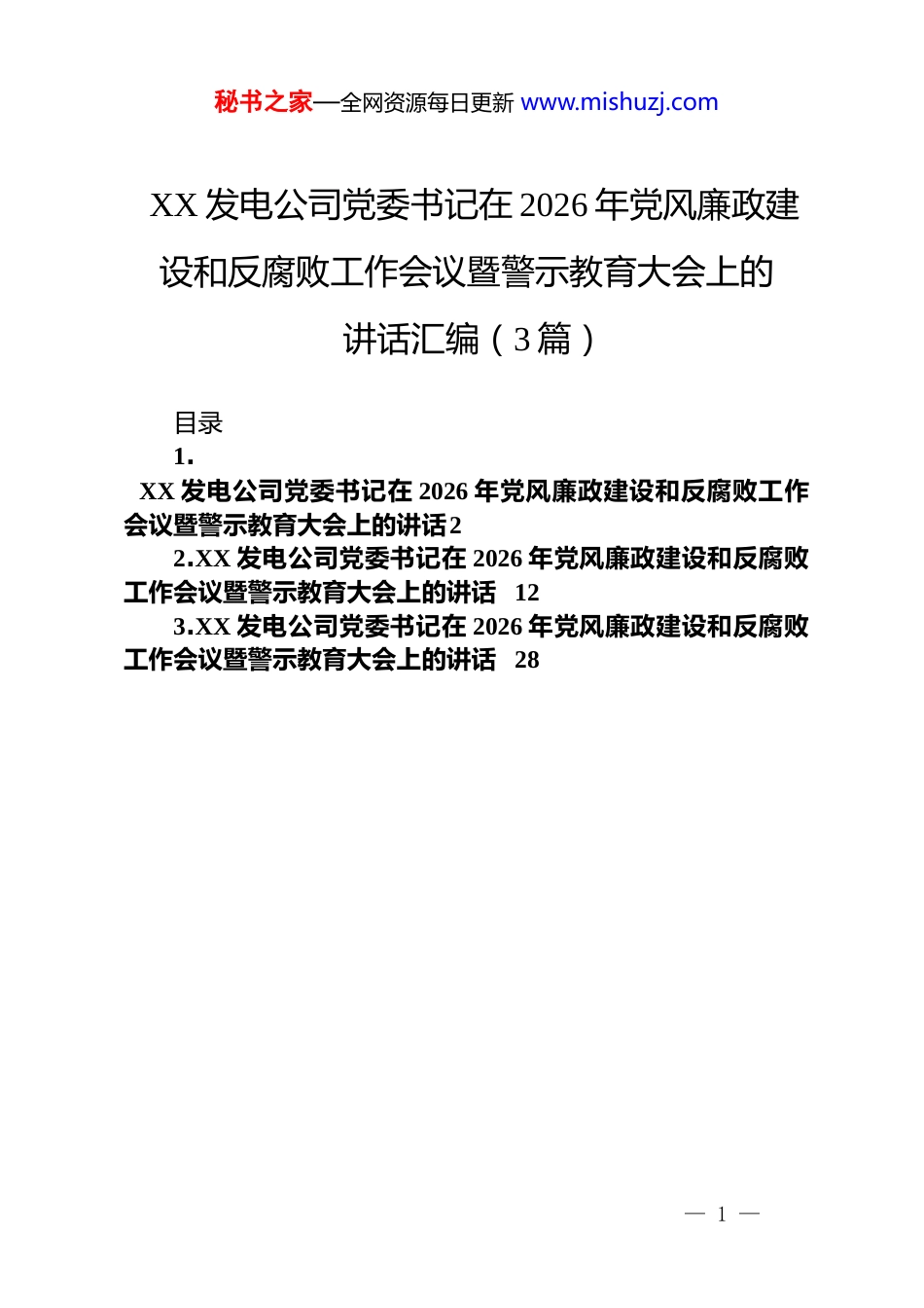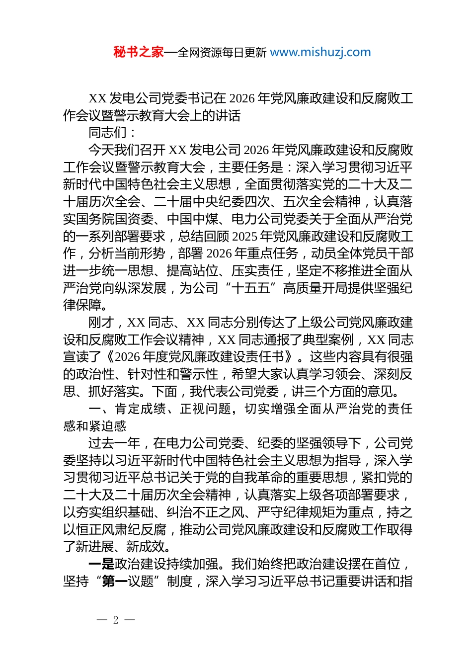 秘书之家—全网资源每日更新 www.mishuzj.comXX 发电公司党委书记在 2026 年党风廉政建设和反腐败工作会议暨警示教育大会上的讲话汇编(3 篇)目录1.XX 发电公司党委书记在 2026 年党风廉政建设和反腐败工作会议暨警示教育大会上的讲话22.XX 发电公司党委书记在 2026 年党风廉政建设和反腐败工作会议暨警示教育大会上的讲话 123.XX 发电公司党委书记在 2026 年党风廉政建设和反腐败工作会议暨警示教育大会上的讲话 28— 1 —秘书之家—全网资源每日更新 www.mishuzj.comXX 发电公司党委书记在 2026 年党风廉政建设和反腐败工作会议暨警示教育大会上的讲话同志们:今天我们召开 XX 发电公司 2026 年党风廉政建设和反腐败工作会议暨警示教育大会,主要任务是:深入学习贯彻习近平新时代中国特色社会主义思想,全面贯彻落实党的二十大及二十届历次全会、二十届中央纪委四次、五次全会精神,认真落实国务院国资委、中国中煤、电力公司党委关于全面从严治党的一系列部署要求,总结回顾 2025 年党风廉政建设和反腐败工作,分析当前形势,部署 2026 年重点任务,动员全体党员干部进一步统一思想、提高站位、压实责任,坚定不移推进全面从严治党向纵深发展,为公司“十五五”高质量开局提供坚强纪律保障。刚才,XX 同志、XX 同志分别传达了上级公司党风廉政建设和反腐败工作会议精神,XX 同志通报了典型案例,XX 同志宣读了《2026 年度党风廉政建设责任书》。这些内容具有很强的政治性、针对性和警示性,希望大家认真学习领会、深刻反思、抓好落实。下面,我代表公司党委,讲三个方面的意见。一、肯定成绩、正视问题,切实增强全面从严治党的责任感和紧迫感过去一年,在电力公司党委、纪委的坚强领导下,公司党委坚持以习近平新时代中国特色社会主义思想为指导,深入学习贯彻习近平总书记关于党的自我革命的重要思想,紧扣党的二十大及二十届历次全会精神,认真落实上级各项部署要求,以夯实组织基础、纠治不正之风、严守纪律规矩为重点,持之以恒正风肃纪反腐,推动公司党风廉政建设和反腐败工作取得了新进展、新成效。一是政治建设持续加强。我们始终把政治建设摆在首位,坚持“第一议题”制度,深入学习习近平总书记重要讲话和指— 2 —秘书之家—全网资源每日更新 www.mishuzj.com示批示精神,不断提高政治判断力、政治领悟力、政治执行力。严格落实党中央决策部署和上级党委工作要求,确保政令畅通、令行禁止。二是监督执纪更加有力。公司纪委聚焦主责主业,紧盯“关键少数”和重点领域,扎实开展日常监督、专项监督和节点监督,推动监督下沉、监督落地。全年开展廉政谈话 XX 人次,开展专项监督检查 XX 次,发现问题 XX 个,全部督促整改到位。三是作风建设持续深化。我们坚持纠“四风”树新风并举,紧盯形式主义、官僚主义新表现,切实为基层减负。深入开展作风建设专项整治,推动党员干部转作风、提效能、树形象。四是“三不腐”一体推进成效初显。坚持不敢腐、不能腐、不想腐同时发力、同向发力。加大案件查办力度,严肃查处违纪违法问题;健全制度机制,堵塞管理漏洞;加强廉洁文化建设,营造风清气正的良好氛围。在肯定成绩的同时,我们也要清醒地看到,公司党风廉政建设和反腐败工作仍存在一些不容忽视的问题:一是政治站位还不够高。有的党员干部对全面从严治党的重要性认识不足,存在“上热中温下冷”现象;二是责任落实还不够到位。有的基层党组织主体责任落实不到位,压力传导层层递减;三是监督质效还不够高。日常监督还不够深入细致,对隐蔽性“四风”问题发现难、查处难;四是廉洁风险防控还不够精准。重点领域、关键环节的廉洁风险依然存在;五是作风建设仍需加强。形式主义、官僚主义问题仍时有发生,基层减负效果还不够明显。这些问题必须引起我们高度重视,深刻反思,采取有力措施,切实加以解决。二、明确目标、聚焦重点,推动全面从严治党向纵深发展2026 年是“十五五”开局之年,也是公司实现高质量发展— 3 —秘书之家—全网资源每日更新 www.mishuzj.com的关键之年。做好党风廉政建设和反腐败工作,意义重大...