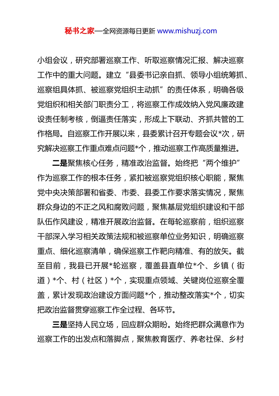 秘书之家—全网资源每日更新 www.mishuzj.com交流发言:坚守政治定位深耕巡察实效以高质量巡察护航县域高质量发展 尊敬的各位领导、同志们:大家好!近年来,县委始终坚持以习近平新时代中国特色社会主义思想为指导,深入学习贯彻习近平总书记关于巡视工作的重要论述,牢牢把握政治巡察定位,坚守“发现问题、形成震慑、推动改革、促进发展”的方针,以规范化建设为抓手,以队伍建设为支撑,以成果运用为关键,扎实推进多轮常规巡察、专项巡察,逐步探索出一条贴合县域实际、彰显基层特色的巡察工作路径,为全县全面从严治党向基层延伸、护航经济社会高质量发展提供了坚强保障。下面,结合我县巡察工作实践,分享几点经验做法,与大家交流探讨。一、提高政治站位,把准巡察“方向盘”,筑牢政治监督根基巡察是政治巡察,不是业务检查,必须始终把政治建设摆在首位,确保巡察工作不偏航、不缺位。一是强化政治引领,压实主体责任。县委始终把巡察工作作为重大政治任务,纳入全面从严治党总体布局,成立由县委书记任组长的巡察工作领导小组,定期召开县委常委会、领导秘书之家—全网资源每日更新 www.mishuzj.com小组会议,研究部署巡察工作、听取巡察情况汇报、解决巡察工作中的重大问题。建立“县委书记亲自抓、领导小组统筹抓、巡察组具体抓、被巡察党组织主动抓”的责任体系,明确各级党组织和相关部门职责分工,将巡察工作成效纳入党风廉政建设责任制考核,倒逼责任落实,形成上下联动、齐抓共管的工作格局。自巡察工作开展以来,县委累计召开专题会议*次,研究解决巡察工作重点难点问题*个,推动巡察工作高质量推进。二是聚焦核心任务,精准政治监督。始终把“两个维护”作为巡察工作的根本任务,紧扣被巡察党组织核心职能,聚焦党中央决策部署和省委、市委、县委工作要求落实情况,聚焦群众身边的不正之风和腐败问题,聚焦基层党组织建设和干部队伍作风建设,精准开展政治监督。在每轮巡察前,组织巡察干部深入学习相关政策法规和被巡察单位业务知识,明确巡察重点、细化巡察清单,确保巡察工作靶向精准、有的放矢。截至目前,我县已开展*轮巡察,覆盖县直单位*个、乡镇(街道)*个、村(社区)*个,实现重点领域、关键岗位巡察全覆盖,累计发现政治建设方面问题*个,推动整改落实*个,切实把政治监督贯穿巡察工作全过程、各环节。三是坚持人民立场,回应群众期盼。始终把群众满意作为巡察工作的出发点和落脚点,聚焦教育医疗、养老社保、乡村秘书之家—全网资源每日更新 www.mishuzj.com振兴、住房物业等民生领域突出问题,深入基层、深入群众,倾听群众呼声、收集群众诉求,着力解决群众急难愁盼问题。畅通“信、访、网、电、微”五位一体举报渠道,在被巡察单位、村(社区)张贴巡察公告,公布举报方式,鼓励群众主动反映问题线索。每轮巡察期间,累计走访群众*户,收集群众意见建议*条,推动解决民生实事*件,清退返还群众资金*万元,让群众真正感受到巡察工作带来的新变化、新成效,不断厚植党执政的群众基础。二、强化规范建设,激活巡察“动力源”,提升巡察工作质效规范是巡察工作的生命线,只有不断完善制度机制、创新方式方法,才能推动巡察工作提质增效、走深走实。一是健全制度体系,规范巡察流程。结合我县实际,先后制定完善《县委巡察工作领导小组议事规则》《巡察组工作规则》《巡察整改监督办法》《巡察成果运用办法》等*项制度,明确巡察准备、进驻、了解、报告、反馈、整改等各个环节的工作要求,形成“事前有部署、事中有规范、事后有落实”的工作闭环。规范巡察材料报送、线索移交、整改销号等流程,细化工作标准,确保巡察工作每一步都有章可循、有据可依,推动巡察工作制度化、规范化、科学化发展。秘书之家—全网资源每日更新 www.mishuzj.com二是创新方式方法,增强巡察实效。打破传统巡察模式,探索“常规巡察+专项巡察+机动巡察”相结合的巡察方式,针对重点领域、重点问题开展专项巡察,针对突发问题、苗头性问题开展机动巡察,提升巡察的针对性和实效性。创新运用“个别谈话+查阅资料+实地核查+受理信访”的工作方法,深入被巡察单位各个科...