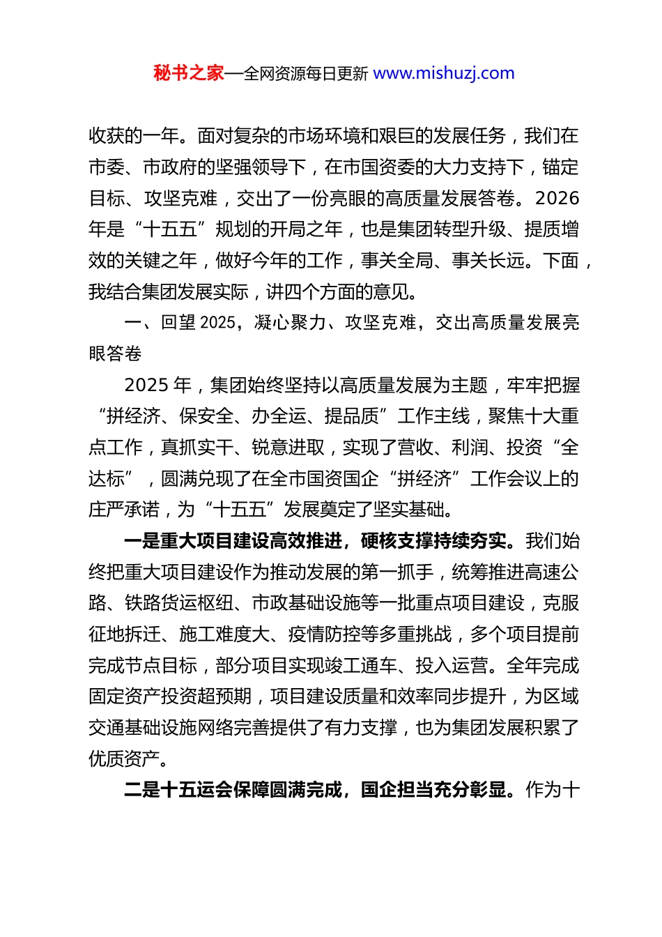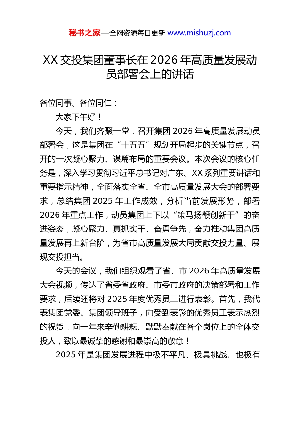 秘书之家—全网资源每日更新 www.mishuzj.comXX 交投集团董事长在 2026 年高质量发展动员部署会上的讲话各位同事、各位同仁:大家下午好!今天,我们齐聚一堂,召开集团 2026 年高质量发展动员部署会,这是集团在“十五五”规划开局起步的关键节点,召开的一次凝心聚力、谋篇布局的重要会议。本次会议的核心任务是,深入学习贯彻习近平总书记对广东、XX 系列重要讲话和重要指示精神,全面落实全省、全市高质量发展大会的部署要求,总结集团 2025 年工作成效,分析当前发展形势,部署2026 年重点工作,动员集团上下以“策马扬鞭创新干”的奋进姿态,凝心聚力、真抓实干、奋勇争先,奋力推动集团高质量发展再上新台阶,为省市高质量发展大局贡献交投力量、展现交投担当。今天的会议,我们组织观看了省、市 2026 年高质量发展大会视频,传达了省委省政府、市委市政府的决策部署和工作要求,后续还将对 2025 年度优秀员工进行表彰。首先,我代表集团党委、集团领导班子,向受到表彰的优秀员工表示热烈的祝贺!向一年来辛勤耕耘、默默奉献在各个岗位上的全体交投人,致以最诚挚的感谢和最崇高的敬意!2025 年是集团发展进程中极不平凡、极具挑战、也极有秘书之家—全网资源每日更新 www.mishuzj.com收获的一年。面对复杂的市场环境和艰巨的发展任务,我们在市委、市政府的坚强领导下,在市国资委的大力支持下,锚定目标、攻坚克难,交出了一份亮眼的高质量发展答卷。2026年是“十五五”规划的开局之年,也是集团转型升级、提质增效的关键之年,做好今年的工作,事关全局、事关长远。下面,我结合集团发展实际,讲四个方面的意见。一、回望 2025,凝心聚力、攻坚克难,交出高质量发展亮眼答卷2025 年,集团始终坚持以高质量发展为主题,牢牢把握“拼经济、保安全、办全运、提品质”工作主线,聚焦十大重点工作,真抓实干、锐意进取,实现了营收、利润、投资“全达标”,圆满兑现了在全市国资国企“拼经济”工作会议上的庄严承诺,为“十五五”发展奠定了坚实基础。一是重大项目建设高效推进,硬核支撑持续夯实。我们始终把重大项目建设作为推动发展的第一抓手,统筹推进高速公路、铁路货运枢纽、市政基础设施等一批重点项目建设,克服征地拆迁、施工难度大、疫情防控等多重挑战,多个项目提前完成节点目标,部分项目实现竣工通车、投入运营。全年完成固定资产投资超预期,项目建设质量和效率同步提升,为区域交通基础设施网络完善提供了有力支撑,也为集团发展积累了优质资产。二是十五运会保障圆满完成,国企担当充分彰显。作为十秘书之家—全网资源每日更新 www.mishuzj.com五运会 XX 赛区的重要保障单位,集团把全运保障工作作为重大政治任务,成立专项工作小组,制定详细保障方案,统筹推进场馆周边交通配套、物流运输保障、赛事服务支撑等工作。全体参与保障的员工坚守岗位、连续作战,以高标准、严要求完成了各项保障任务,实现了“零差错、零事故、零投诉”的目标,得到了市委、市政府和社会各界的高度认可,充分展现了 XX 交投的责任与担当。三是物流枢纽能级持续提升,核心优势不断强化。我们聚焦铁路货运枢纽、公路物流中心等核心载体建设,完善物流基础设施配套,优化物流运输组织模式,推动多式联运深度融合,物流枢纽的集聚效应和辐射能力显著提升。全年物流吞吐量实现稳步增长,物流服务效率和质量持续优化,为区域实体经济发展提供了高效的物流保障,也让集团在物流领域的核心竞争力进一步凸显。四是主营业务发展稳健向好,经营质效稳步提升。基础设施运营、工程施工、资源开发、市政代建等核心主营业务保持平稳发展态势,运营管理精细化水平持续提升,工程施工质量和市场口碑不断提高,资源开发利用效率稳步增强。我们坚持以市场为导向,积极拓展业务领域,优化业务结构,主营业务收入占比保持合理水平,成为集团发展的“压舱石”。五是资产资源盘活多点释放,发展活力有效激发。我们树立“一盘棋”思想,统筹推进集团存量资产资源盘活利用,通秘书之家—全网资源每日更新 www.mishuzj.com过资产重组、合作开发、市场化运营等多种方式,让闲置资...