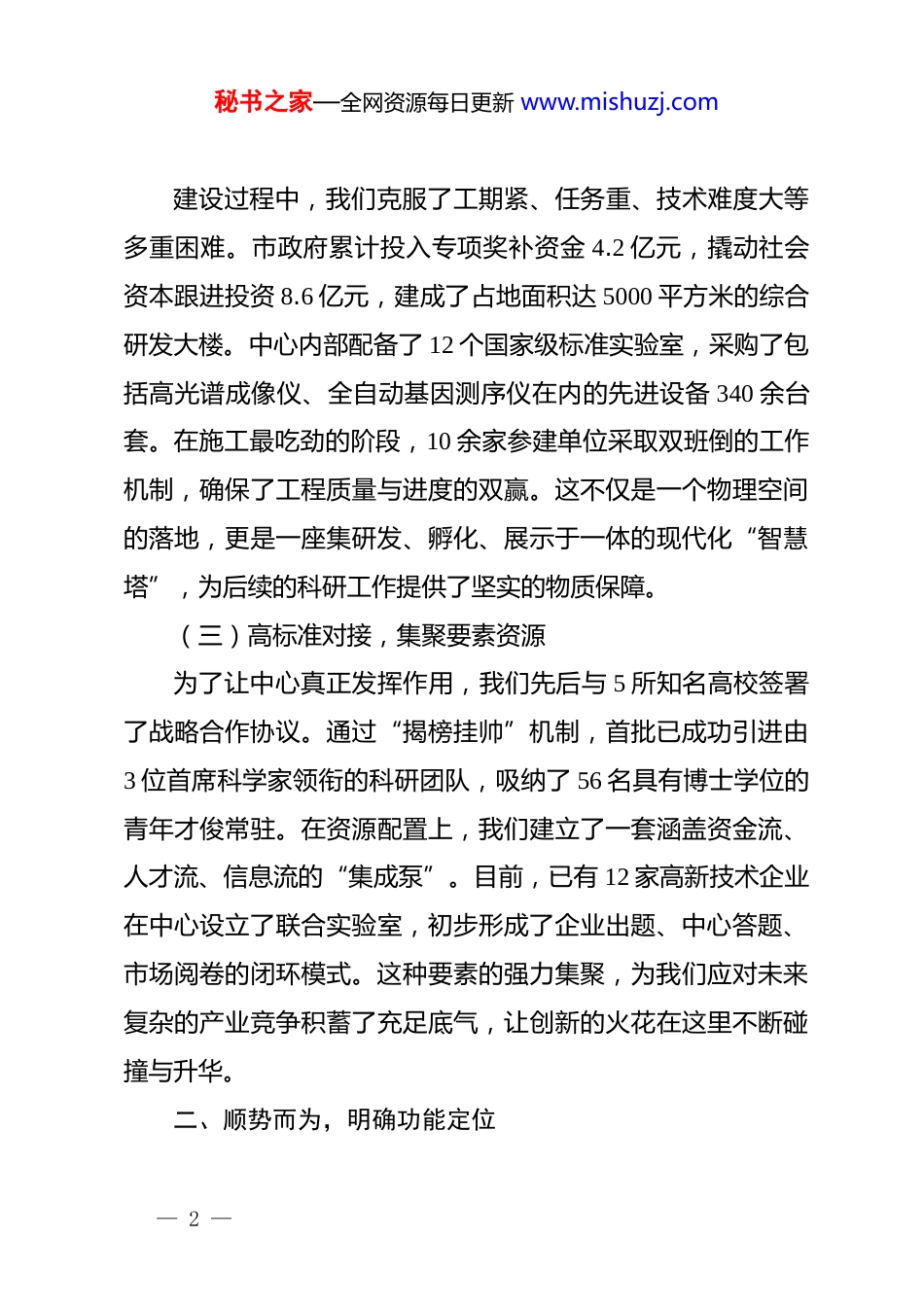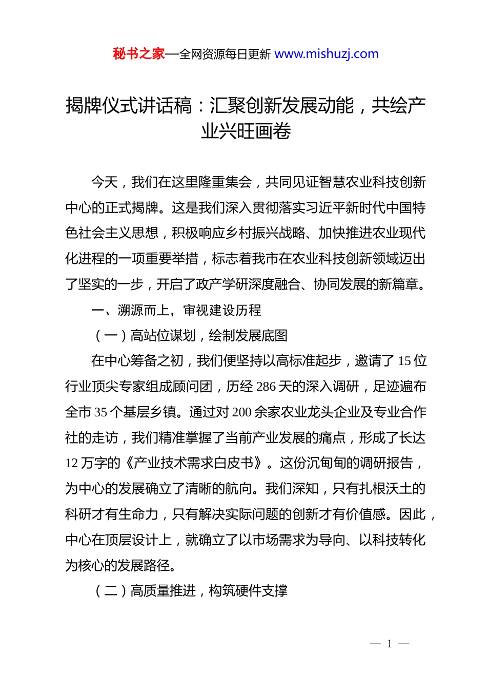 秘书之家—全网资源每日更新 www.mishuzj.com揭牌仪式讲话稿:汇聚创新发展动能,共绘产业兴旺画卷今天,我们在这里隆重集会,共同见证智慧农业科技创新中心的正式揭牌。这是我们深入贯彻落实习近平新时代中国特色社会主义思想,积极响应乡村振兴战略、加快推进农业现代化进程的一项重要举措,标志着我市在农业科技创新领域迈出了坚实的一步,开启了政产学研深度融合、协同发展的新篇章。一、溯源而上,审视建设历程(一)高站位谋划,绘制发展底图在中心筹备之初,我们便坚持以高标准起步,邀请了 15 位行业顶尖专家组成顾问团,历经 286 天的深入调研,足迹遍布全市 35 个基层乡镇。通过对 200 余家农业龙头企业及专业合作社的走访,我们精准掌握了当前产业发展的痛点,形成了长达12 万字的《产业技术需求白皮书》。这份沉甸甸的调研报告,为中心的发展确立了清晰的航向。我们深知,只有扎根沃土的科研才有生命力,只有解决实际问题的创新才有价值感。因此,中心在顶层设计上,就确立了以市场需求为导向、以科技转化为核心的发展路径。(二)高质量推进,构筑硬件支撑— 1 —秘书之家—全网资源每日更新 www.mishuzj.com建设过程中,我们克服了工期紧、任务重、技术难度大等多重困难。市政府累计投入专项奖补资金 4.2 亿元,撬动社会资本跟进投资 8.6 亿元,建成了占地面积达 5000 平方米的综合研发大楼。中心内部配备了 12 个国家级标准实验室,采购了包括高光谱成像仪、全自动基因测序仪在内的先进设备 340 余台套。在施工最吃劲的阶段,10 余家参建单位采取双班倒的工作机制,确保了工程质量与进度的双赢。这不仅是一个物理空间的落地,更是一座集研发、孵化、展示于一体的现代化“智慧塔”,为后续的科研工作提供了坚实的物质保障。(三)高标准对接,集聚要素资源为了让中心真正发挥作用,我们先后与 5 所知名高校签署了战略合作协议。通过“揭榜挂帅”机制,首批已成功引进由3 位首席科学家领衔的科研团队,吸纳了 56 名具有博士学位的青年才俊常驻。在资源配置上,我们建立了一套涵盖资金流、人才流、信息流的“集成泵”。目前,已有 12 家高新技术企业在中心设立了联合实验室,初步形成了企业出题、中心答题、市场阅卷的闭环模式。这种要素的强力集聚,为我们应对未来复杂的产业竞争积蓄了充足底气,让创新的火花在这里不断碰撞与升华。二、顺势而为,明确功能定位— 2 —秘书之家—全网资源每日更新 www.mishuzj.com(一)聚焦核心,强化科研攻关1.攻克种源关键技术我们将把种质资源的自主创新放在首位,通过基因编辑和分子标记辅助育种技术,培育具有自主知识产权的优良品种。目前,中心已启动了针对本地区 3 种主要作物的耐旱试验。我们计划通过 3 到 5 年的努力,实现核心品种的更新换代。2.研发智能农机装备针对本地区丘陵地形特征,中心将联合装备制造企业,重点研发小型化、智能化、多功能的山地农机。通过安装传感器和自动驾驶系统,让农业作业更精准。我们旨在解决农业机械化最后的一公里难题,显著降低农民的劳动强度。3.构建数据决策模型我们将建设全市农业大数据云平台,利用卫星遥感和地面物联网设备,对农情进行实时监测。通过人工智能算法,为农民提供施肥、灌溉、病虫害防治的最优方案。这种以数据驱动的决策方式,将彻底改变传统农业靠天吃饭的落后局面。(二)聚焦转化,打通应用链条1.建设中试孵化基地科研成果不能锁在抽屉里。我们在中心周边划拨了 500 亩试验田,作为科研成果的“练兵场”。任何一项新技术在推广— 3 —秘书之家—全网资源每日更新 www.mishuzj.com前,都必须在这里经过严格的实地测试。通过模拟不同的气候和土壤环境,确保技术在应用过程中的稳定性和可靠性。2.培育科技领军企业中心将建立专门的企业孵化器,为初创型科技企业提供办公场地、法务咨询、投融资对接等一站式服务。我们计划每年培育 3 至 5 家在细分领域具有影响力的“小巨人”企业。通过企业的发展带动产业链的延伸,形成具有核心竞争力的产业集群。3.完善技术服务体系我们将建立覆盖全市的农技推广网络,培养一批...