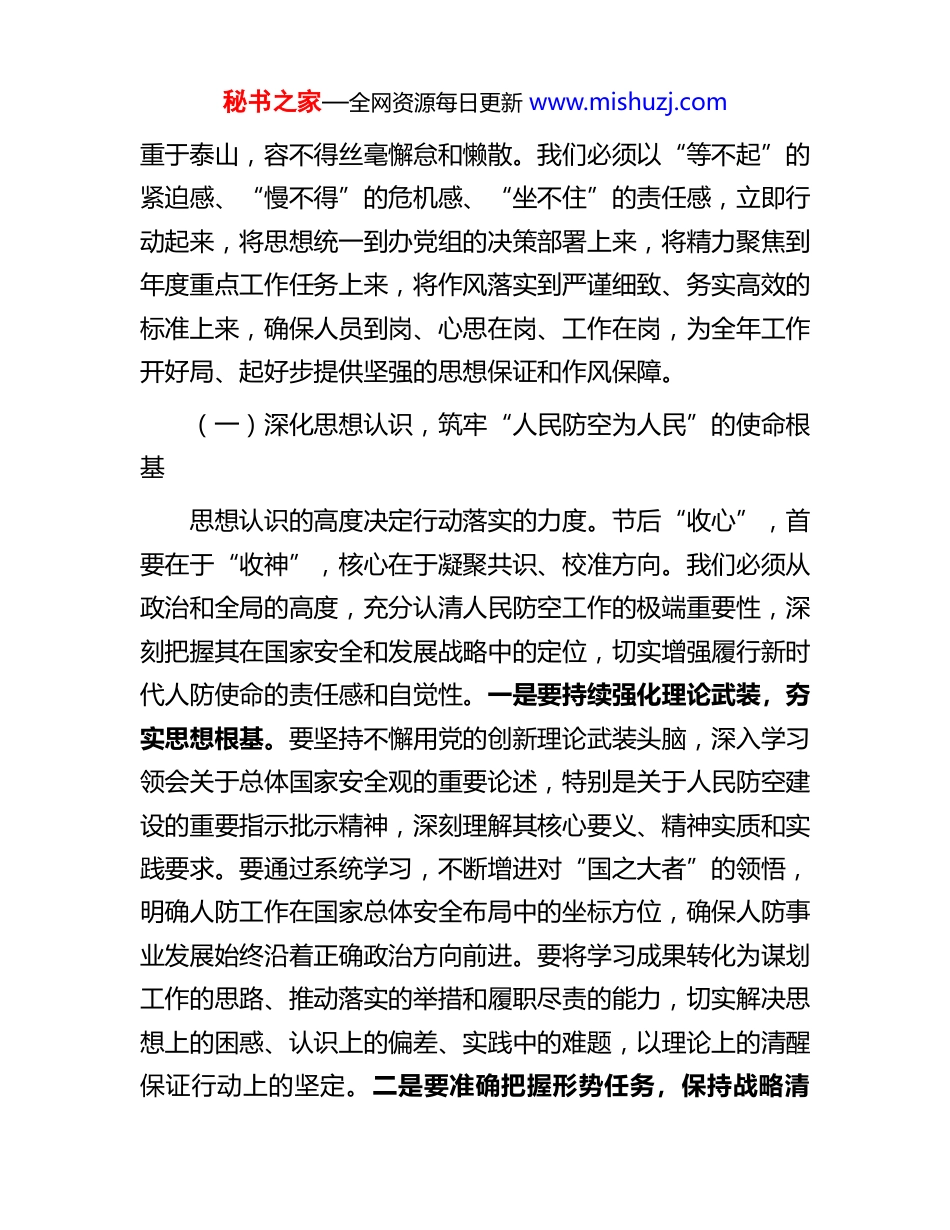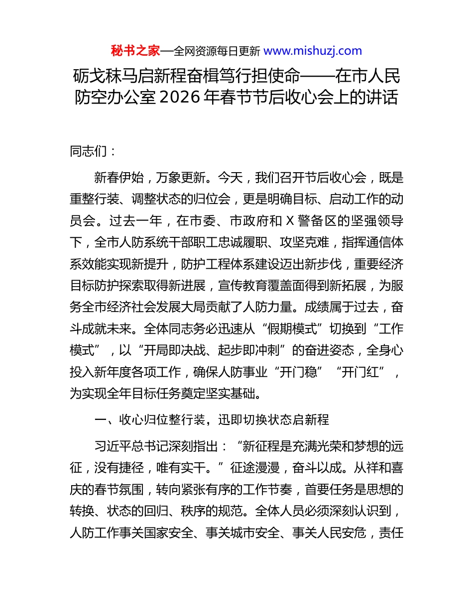 秘书之家—全网资源每日更新 www.mishuzj.com砺戈秣马启新程奋楫笃行担使命——在市人民防空办公室 2026 年春节节后收心会上的讲话同志们:新春伊始,万象更新。今天,我们召开节后收心会,既是重整行装、调整状态的归位会,更是明确目标、启动工作的动员会。过去一年,在市委、市政府和 X 警备区的坚强领导下,全市人防系统干部职工忠诚履职、攻坚克难,指挥通信体系效能实现新提升,防护工程体系建设迈出新步伐,重要经济目标防护探索取得新进展,宣传教育覆盖面得到新拓展,为服务全市经济社会发展大局贡献了人防力量。成绩属于过去,奋斗成就未来。全体同志务必迅速从“假期模式”切换到“工作模式”,以“开局即决战、起步即冲刺”的奋进姿态,全身心投入新年度各项工作,确保人防事业“开门稳”“开门红”,为实现全年目标任务奠定坚实基础。一、收心归位整行装,迅即切换状态启新程习近平总书记深刻指出:“新征程是充满光荣和梦想的远征,没有捷径,唯有实干。”征途漫漫,奋斗以成。从祥和喜庆的春节氛围,转向紧张有序的工作节奏,首要任务是思想的转换、状态的回归、秩序的规范。全体人员必须深刻认识到,人防工作事关国家安全、事关城市安全、事关人民安危,责任秘书之家—全网资源每日更新 www.mishuzj.com重于泰山,容不得丝毫懈怠和懒散。我们必须以“等不起”的紧迫感、“慢不得”的危机感、“坐不住”的责任感,立即行动起来,将思想统一到办党组的决策部署上来,将精力聚焦到年度重点工作任务上来,将作风落实到严谨细致、务实高效的标准上来,确保人员到岗、心思在岗、工作在岗,为全年工作开好局、起好步提供坚强的思想保证和作风保障。(一)深化思想认识,筑牢“人民防空为人民”的使命根基思想认识的高度决定行动落实的力度。节后“收心”,首要在于“收神”,核心在于凝聚共识、校准方向。我们必须从政治和全局的高度,充分认清人民防空工作的极端重要性,深刻把握其在国家安全和发展战略中的定位,切实增强履行新时代人防使命的责任感和自觉性。一是要持续强化理论武装,夯实思想根基。要坚持不懈用党的创新理论武装头脑,深入学习领会关于总体国家安全观的重要论述,特别是关于人民防空建设的重要指示批示精神,深刻理解其核心要义、精神实质和实践要求。要通过系统学习,不断增进对“国之大者”的领悟,明确人防工作在国家总体安全布局中的坐标方位,确保人防事业发展始终沿着正确政治方向前进。要将学习成果转化为谋划工作的思路、推动落实的举措和履职尽责的能力,切实解决思想上的困惑、认识上的偏差、实践中的难题,以理论上的清醒保证行动上的坚定。二是要准确把握形势任务,保持战略清秘书之家—全网资源每日更新 www.mishuzj.com醒。当前,国家安全环境的复杂性、严峻性、不确定性上升,传统安全威胁与非传统安全威胁相互交织。城市作为经济社会发展的重要载体,其安全防护面临新的挑战。我们必须清醒认识人防建设面临的新形势新要求,准确把握城市发展、科技进步、战争形态演变给人防工作带来的深刻影响。要增强忧患意识,树立底线思维,密切关注安全动态,深入分析风险隐患,做到见微知著、防患未然,牢牢掌握工作主动权。要摒弃和平积弊,克服麻痹思想,时刻保持“警钟长鸣、常备不懈”的战斗姿态。三是要牢固树立宗旨意识,践行初心使命。人民防空是国之大事,是国家战略,是长期战略,根本目的是保护人民生命财产安全。要始终坚持以人民为中心的发展思想,将“人民防空为人民”的宗旨贯穿于工作全过程、各方面。在规划编制、工程建设、演练组织、宣传教育等各项工作中,都要充分考虑人民群众的需求和关切,努力提升城市综合防护能力,为人民群众铸就坚不可摧的护民之盾。要畅通渠道,倾听民意,积极回应社会对人防工作的期待,不断提升人民群众对人防工作的知晓度、参与度和满意度,夯实人防事业的群众基础。(二)严明纪律规矩,淬炼“令行禁止作风硬”的过硬队伍纪律是执行路线的保证,规矩是成就事业的基石。节后状态的回稳,离不开严明的纪律约束和优良的作风保障。一支作风涣散、纪律松弛的队伍,不可能肩负起守护城市地下长城...