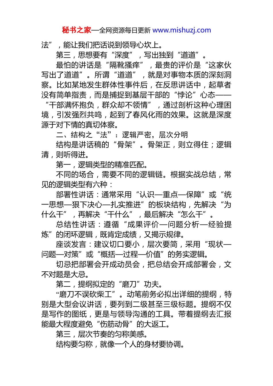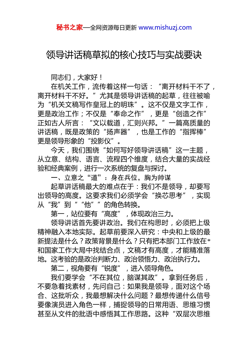 秘书之家—全网资源每日更新 www.mishuzj.com领导讲话稿草拟的核心技巧与实战要诀同志们,大家好!在机关工作,流传着这样一句话:“离开材料干不了,离开材料干不好。”尤其是领导讲话稿的起草,往往被喻为“机关文稿写作皇冠上的明珠”。这不仅是文字工作,更是政治工作;不仅是“奉命之作”,更是“创造之作”正如古人所言:“文以载道,汇则兴邦。”一篇高质量的讲话稿,既是政策的“扬声器”,也是工作的“指挥棒”更是领导形象的“投影仪”。今天,我们围绕“如何写好领导讲话稿”这一主题,从立意、结构、语言、流程四个维度,结合大量的实战经验和经典案例,进行一次系统的复盘与探讨。一、立意之“道”:身在兵位,胸为帅谋起草讲话稿最大的难点在于:我们不是领导,却要写出领导的高度。这要求我们必须学会“换芯思考”,实现从“我”到““他””的角色转换。第一,站位要有“高度”,体现政治三力。领导讲话首先要讲政治。我们在构思时,必须把上级精神融入本地实际。起草前要深入研究:中央和上级的最新提法是什么?政策背景是什么?只有把本部门工作放在*和国家工作大局中找结合点,文稿才有高度,才能精准落地。这考验的是政治判断力、政治领悟力、政治执行力。第二,视角要有“锐度”,进入领导角色。我们要学会“不在其位,脑谋其政”。拿到任务后,不要急着找素材,先问自己:如果我是领导,面对这个场合、这批听众,我最想解决什么问题?最想传递什么信号要像演员进入角色一样,捕捉领导的日常用语、思维习惯甚至从文件的批语中感悟其工作思路。这种“双层次思维秘书之家—全网资源每日更新 www.mishuzj.com法”,能让我们把话说到领导心坎上。第三,思想要有“深度”,写出独到“道道”。最怕的讲话是“隔靴搔痒”,最贵的评价是“这家伙写出了道道”。所谓“道道”,就是对事物本质的深刻洞察。比如某地发生群体性事件后,在反思讲话中,起草者没有简单指责,而是捕捉到基层干部的“悖论”心态——“干部满怀抱负,群众却不领情”,通过剖析这种心理困境,引发强烈共鸣,起到了春风化雨的效果。这就是深度源于对下情的真切体察。二、结构之“法”:逻辑严密,层次分明结构是讲话稿的“骨架”。骨架正,则立得住;逻辑清,则听得进。第一,逻辑类型的精准匹配。不同的场合,需要不同的逻辑链。根据实战总结,常见的逻辑类型有六种:部署性讲话:通常采用“认识—重点—保障”或“统一思想—狠下决心—扎实推进”的板块结构,先解决“为什么干”,再解决“干什么”,最后解决“怎么干”。总结性讲话:遵循“成果评价—问题分析—经验提炼”的闭环逻辑,既肯定成绩,又揭示规律。座谈发言:建议切口要小,层次要简,采用“现状—问题—对策”或“概括—过程—价值”的务实逻辑。切忌把部署会开成动员会,把总结会开成部署会,文不对题是大忌。第二,提纲拟定的“磨刀”功夫。“磨刀不误砍柴工”。动笔前务必拟出详细的提纲,特别是大型会议讲话,要列到二级甚至三级标题。提纲不仅是写作的图纸,更是与领导沟通的工具。带着提纲去汇报能最大程度避免“伤筋动骨”的大返工。第三,层次节奏的匀称美感。结构要匀称,就像一个人的身材要协调。秘书之家—全网资源每日更新 www.mishuzj.com层次要清晰:全文分几部分,每部分分几点,要像剥笋一样,层层递进。既要避免逻辑混乱,也要避免层次太多,让听众“头昏脑涨”。标题要鲜活:标题是文章的“眼睛”。***同志讲《组织起来》,***同志讲《精简机构是一场革命》,都是直击要害、过目不忘的典范。我们拟题时要追求准确基础上的鲜活,不要为了对仗而堆砌辞藻。三、语言之“术”:引人入胜,余音绕梁语言是思想的“外衣”。好的讲话,既能“入耳”,又能“入心”。第一,用词的分寸感——讲准确的话。机关文稿的生命是准确。每一个词都要反复掂量:力度够不够?范围准不准?感情色彩对不对?部署工作时,多用斩钉截铁的祈使句,体现力度;面对群众时,多用通俗易懂的大白话,体现温度。务必做到“文要定点,字要定音”。第二,表达的感染力——讲生动的话。比喻要贴切:******讲“像保护眼睛一样保护生态环境”,一...