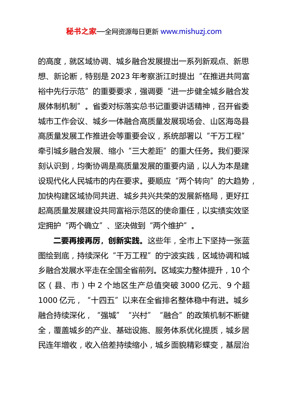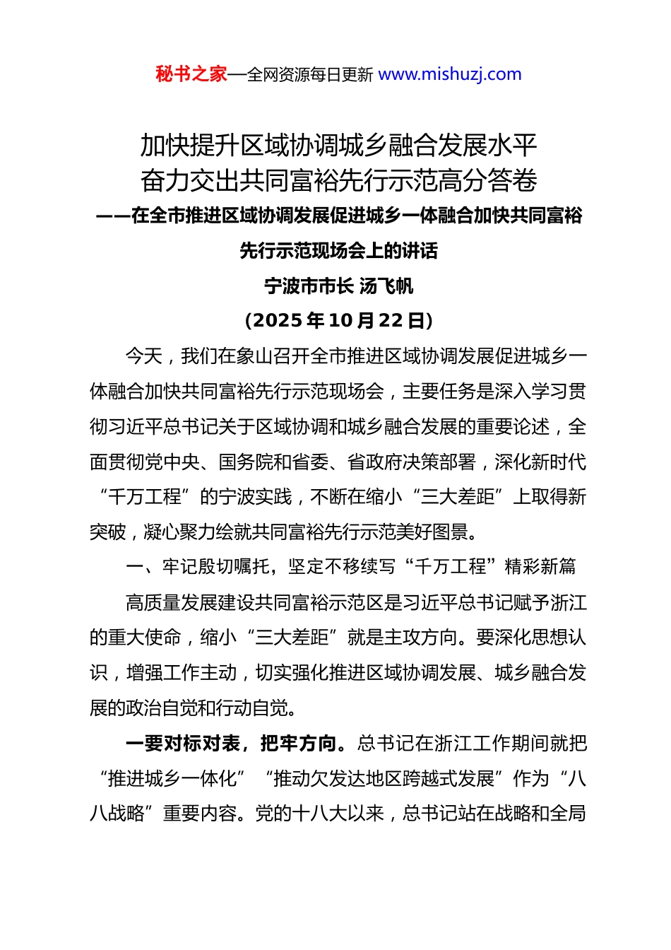 秘书之家—全网资源每日更新 www.mishuzj.com加快提升区域协调城乡融合发展水平奋力交出共同富裕先行示范高分答卷——在全市推进区域协调发展促进城乡一体融合加快共同富裕先行示范现场会上的讲话宁波市市长 汤飞帆(2025 年 10 月 22 日)今天,我们在象山召开全市推进区域协调发展促进城乡一体融合加快共同富裕先行示范现场会,主要任务是深入学习贯彻习近平总书记关于区域协调和城乡融合发展的重要论述,全面贯彻党中央、国务院和省委、省政府决策部署,深化新时代“千万工程”的宁波实践,不断在缩小“三大差距”上取得新突破,凝心聚力绘就共同富裕先行示范美好图景。一、牢记殷切嘱托,坚定不移续写“千万工程”精彩新篇高质量发展建设共同富裕示范区是习近平总书记赋予浙江的重大使命,缩小“三大差距”就是主攻方向。要深化思想认识,增强工作主动,切实强化推进区域协调发展、城乡融合发展的政治自觉和行动自觉。一要对标对表,把牢方向。总书记在浙江工作期间就把“推进城乡一体化”“推动欠发达地区跨越式发展”作为“八八战略”重要内容。党的十八大以来,总书记站在战略和全局秘书之家—全网资源每日更新 www.mishuzj.com的高度,就区域协调、城乡融合发展提出一系列新观点、新思想、新论断,特别是 2023 年考察浙江时提出“在推进共同富裕中先行示范”的重要要求,强调要“进一步健全城乡融合发展体制机制”。省委对标落实总书记重要讲话精神,召开省委城市工作会议、城乡一体融合高质量发展现场会、山区海岛县高质量发展工作推进会等重要会议,系统部署以“千万工程”牵引城乡融合发展、缩小“三大差距”的重大任务。我们要深刻认识到,均衡协调是高质量发展的重要内涵,以人为本是建设现代化人民城市的内在要求。要顺应“两个转向”的大趋势,加快构建区域协同共进、城乡共兴共荣的发展新格局,更好扛起高质量发展建设共同富裕示范区的使命重任,以实绩实效坚定拥护“两个确立”、坚决做到“两个维护”。二要再接再厉,创新实践。这些年,全市上下坚持一张蓝图绘到底,持续深化“千万工程”的宁波实践,区域协调和城乡融合发展水平走在全国全省前列。区域实力整体提升,10 个区(县、市)中 2 个地区生产总值突破 3000 亿元、9 个超1000 亿元,“十四五”以来在全省排名整体稳中有进。城乡融合持续深化,“强城”“兴村”“融合”的政策机制不断健全,覆盖城乡的产业、基础设施、服务体系优化提质,城乡居民连年增收,收入倍差持续缩小,城乡面貌精彩蝶变,基层治秘书之家—全网资源每日更新 www.mishuzj.com理底座进一步夯实,15 次获评中国最具幸福感城市,生动印证了“千万工程”蕴含的实践伟力。要持续深化“千万工程”的市域实践,形成更多可复制可推广的改革创新成果。三要聚焦聚力,补齐短板。面向“十五五”,对标“先行示范”的更高要求,对照人民对美好生活的新期待,我市区域和城乡高质量发展仍存在不少薄弱环节,主要体现在四个方面:一是统筹机制还不够完善。市域统筹、条块协同有待加强,一些优质资源要素的利用还存在碎片化问题,各方面政策举措的集成性、协同性需要进一步提升。二是区域发展还不够协调。龙头区(县、市)引领带动作用发挥还不够,南北差距呈扩大趋势,一些地方城镇化水平还要加快提升。三是共富基础还不够坚实。近两年全体居民人均可支配收入增速均低于地区生产总值增速,农民人均可支配收入增速呈逐年放缓趋势。促进就业增收,产业创新提质是关键。目前我市新兴产业发展与先进城市还有差距,农业农村领域特色产业链、增值链拓展也不够。四是服务供给还不够均衡。城乡路网、水网等基础设施建设需要加强,“15 分钟上高速”尚未实现乡镇全覆盖,一些地方农村生活污水处理设施仍有短板,管道燃气镇街、村社通达率有待提高。公共服务资源城乡布局还需进一步均衡,全市 170 万60 岁以上户籍老年人口约 2/3 在农村,但三星级以上养老机构,秘书之家—全网资源每日更新 www.mishuzj.com农村地区只占 1/3,农村机构养老床位数占比不到 1/2、持证护理员数占比仅 1/3。村级医疗卫生服务能力还不够强,非公办...