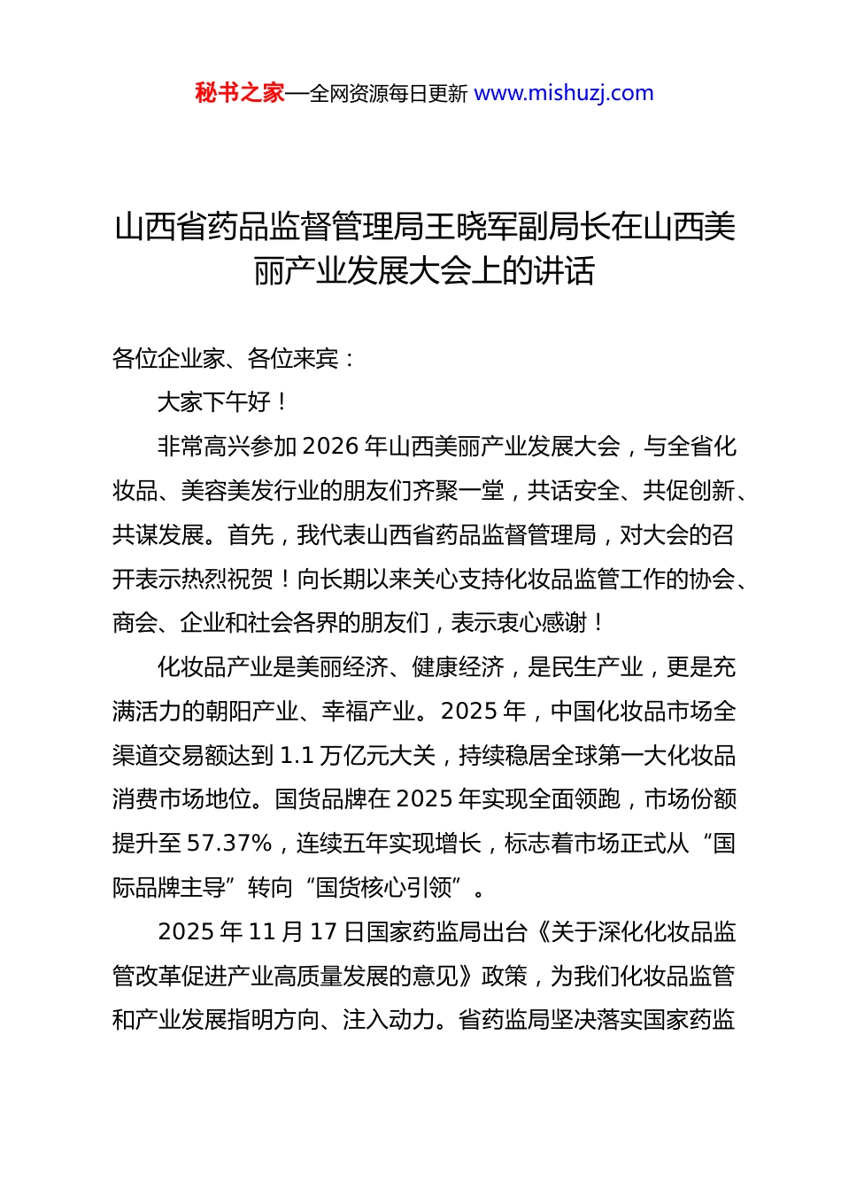 秘书之家—全网资源每日更新 www.mishuzj.com山西省药品监督管理局王晓军副局长在山西美丽产业发展大会上的讲话各位企业家、各位来宾:大家下午好!非常高兴参加 2026 年山西美丽产业发展大会,与全省化妆品、美容美发行业的朋友们齐聚一堂,共话安全、共促创新、共谋发展。首先,我代表山西省药品监督管理局,对大会的召开表示热烈祝贺!向长期以来关心支持化妆品监管工作的协会、商会、企业和社会各界的朋友们,表示衷心感谢!化妆品产业是美丽经济、健康经济,是民生产业,更是充满活力的朝阳产业、幸福产业。2025 年,中国化妆品市场全渠道交易额达到 1.1 万亿元大关,持续稳居全球第一大化妆品消费市场地位。国货品牌在 2025 年实现全面领跑,市场份额提升至 57.37%,连续五年实现增长,标志着市场正式从“国际品牌主导”转向“国货核心引领”。2025 年 11 月 17 日国家药监局出台《关于深化化妆品监管改革促进产业高质量发展的意见》政策,为我们化妆品监管和产业发展指明方向、注入动力。省药监局坚决落实国家药监秘书之家—全网资源每日更新 www.mishuzj.com局部署,立足山西实际,近期也在制定出台《山西省深化化妆品监管改革促进产业高质量发展若干措施》,为全省化妆品的产业发展加油助力。为做好化妆品监管工作我们联合省美容美发化妆品协会、省化妆品行业商会建立化妆品质量安全社会共治工作机制,就是要以监管创新赋能产业创新,以安全底线护航发展高线,推动我省“美丽产业”做大做强、行稳致远。下面,我讲三点意见。一、把握政策机遇,以改革红利激活产业新动能2025 年底,国家药监局印发《关于深化化妆品监管改革促进产业高质量发展的意见》,推出 24 项改革意见、48 项具体举措,力度空前、含金量极高。核心导向就是:支持创新、简化流程、强化服务、严守底线。我们对标国家政策,结合山西产业特点,正在制定出台落实举措,覆盖创新支持、备案效能、生产经营、智慧监管、社会共治全链条,就是要把国家改革红利转化为山西产业发展实效。一是支持创新研发,培育新质生产力。畅通新功效化妆品、新原料注册备案通道,建立省级“研发—审评”前置咨询机制,让企业少走弯路、降低成本。鼓励发展银发化妆品、特色植物化妆品,支持个性化服务、电子标签试点,引导企业向研发、品牌、服务高端化转型。二是优化备案服务,提速产品上市。推行“前置咨询、中期指导、秘书之家—全网资源每日更新 www.mishuzj.com后期跟踪”全流程服务,简化备案资料,允许近似配方共用安全资料、共享功效数据,推进原料信息企业自行存档备查,编制统一备案指南,真正为企业松绑减负、提质增效。三是创新监管方式,提升治理效能。全面推行分级分类监管,对诚信企业、低风险企业“无事不扰”;对高风险产品、重点场所“有事管好”。强化网络经营监测、不良反应监测、全链条执法,严厉打击非法添加、虚假备案、虚假宣传等行为,守牢安全底线。四是强化技术支撑,建强智慧监管。加强检验检测、标准体系、人才队伍建设,打通注册备案、生产经营、抽检执法、不良反应数据,构建全省化妆品智慧监管平台,以数字化、智能化提升监管精准度。可以说,当前山西化妆品产业正处在政策最优、环境最好、机遇最大的黄金发展期。希望广大企业研判大势、抢抓机遇,走创新路、打品质牌、强竞争力,在规范中发展、在发展中提升。二、压实主体责任,以安全底线筑牢发展根基安全是产业的生命线,也是最美的品牌。习近平总书记强调,要坚持最严谨的标准、最严格的监管、最严厉的处罚、最严肃的问责,保障人民群众用药用妆安全。企业是质量安全第一责任人。特此,我向全省化妆品生产经营企业、美容美发机构提四点要求:一要严把准入关。依法注册备案,不生产、不秘书之家—全网资源每日更新 www.mishuzj.com经营、不使用未经注册备案、来源不明、标签违规产品。二要严把质量关。严格执行生产质量管理规范,落实进货查验、索证索票、台账记录、追溯管理,确保产品来源可查、去向可追、责任可究。三要严把宣称关。坚持科学宣称、理性宣传,杜绝虚假宣传、违规宣称,自觉维护市场秩序。四要严把责...
