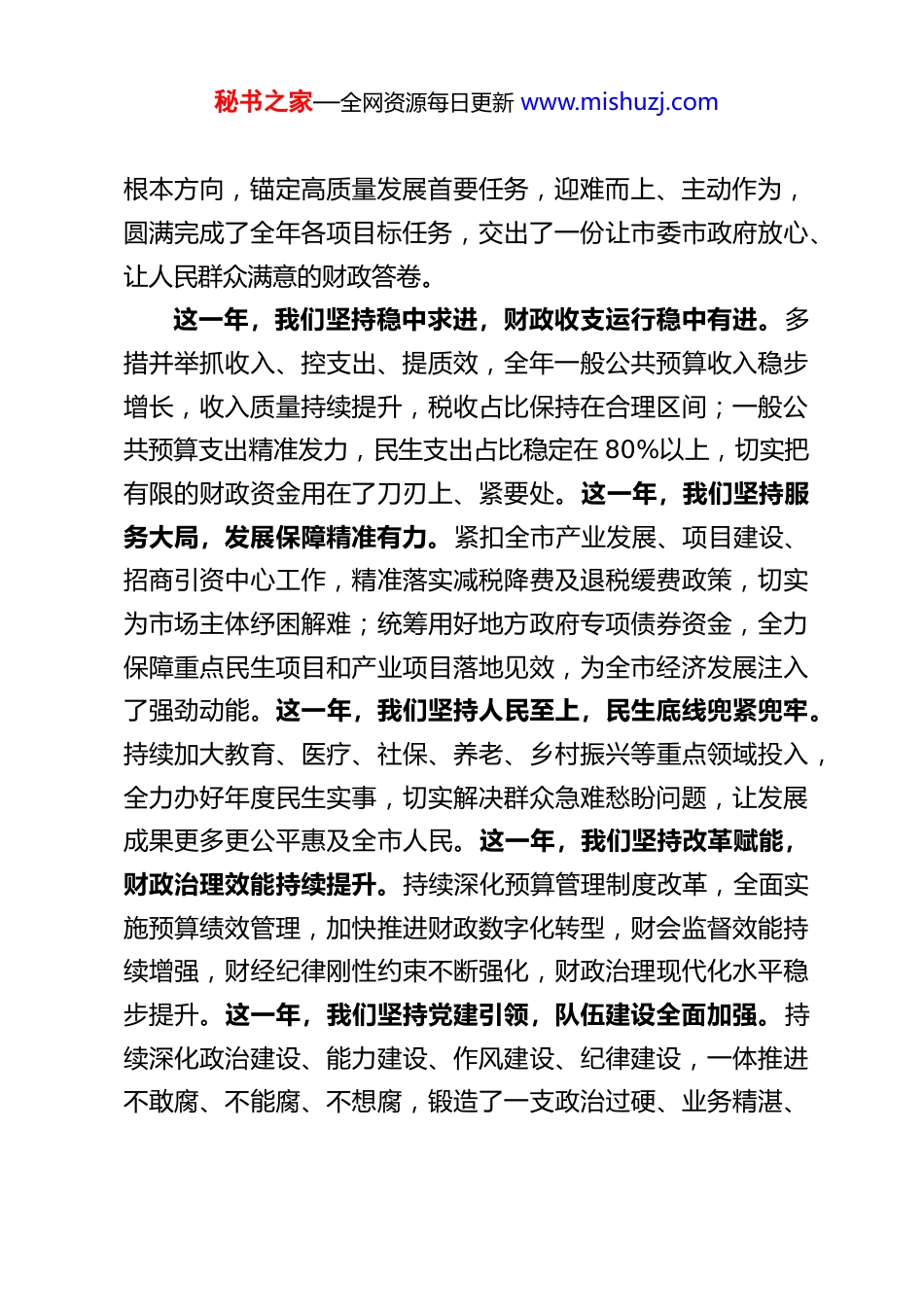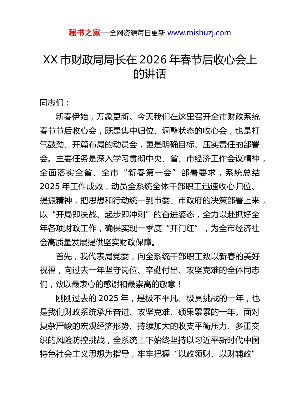 秘书之家—全网资源每日更新 www.mishuzj.comXX 市财政局局长在 2026 年春节后收心会上的讲话同志们:新春伊始,万象更新。今天我们在这里召开全市财政系统春节节后收心会,既是集中归位、调整状态的收心会,也是打气鼓劲、开篇布局的动员会,更是明确目标、压实责任的部署会。主要任务是深入学习贯彻中央、省、市经济工作会议精神,全面落实全省、全市“新春第一会”部署要求,系统总结2025 年工作成效,动员全系统全体干部职工迅速收心归位、提振精神,把思想和行动统一到市委、市政府的决策部署上来,以“开局即决战、起步即冲刺”的奋进姿态,全力以赴抓好全年各项财政工作,确保实现一季度“开门红”,为全市经济社会高质量发展提供坚实财政保障。首先,我代表局党委,向全系统干部职工致以新春的美好祝福,向过去一年坚守岗位、辛勤付出、攻坚克难的全体同志们,致以最衷心的感谢和最崇高的敬意!刚刚过去的 2025 年,是极不平凡、极具挑战的一年,也是我们财政系统承压奋进、攻坚克难、硕果累累的一年。面对复杂严峻的宏观经济形势、持续加大的收支平衡压力、多重交织的风险防控挑战,全系统上下始终坚持以习近平新时代中国特色社会主义思想为指导,牢牢把握“以政领财、以财辅政”秘书之家—全网资源每日更新 www.mishuzj.com根本方向,锚定高质量发展首要任务,迎难而上、主动作为,圆满完成了全年各项目标任务,交出了一份让市委市政府放心、让人民群众满意的财政答卷。这一年,我们坚持稳中求进,财政收支运行稳中有进。多措并举抓收入、控支出、提质效,全年一般公共预算收入稳步增长,收入质量持续提升,税收占比保持在合理区间;一般公共预算支出精准发力,民生支出占比稳定在 80%以上,切实把有限的财政资金用在了刀刃上、紧要处。这一年,我们坚持服务大局,发展保障精准有力。紧扣全市产业发展、项目建设、招商引资中心工作,精准落实减税降费及退税缓费政策,切实为市场主体纾困解难;统筹用好地方政府专项债券资金,全力保障重点民生项目和产业项目落地见效,为全市经济发展注入了强劲动能。这一年,我们坚持人民至上,民生底线兜紧兜牢。持续加大教育、医疗、社保、养老、乡村振兴等重点领域投入,全力办好年度民生实事,切实解决群众急难愁盼问题,让发展成果更多更公平惠及全市人民。这一年,我们坚持改革赋能,财政治理效能持续提升。持续深化预算管理制度改革,全面实施预算绩效管理,加快推进财政数字化转型,财会监督效能持续增强,财经纪律刚性约束不断强化,财政治理现代化水平稳步提升。这一年,我们坚持党建引领,队伍建设全面加强。持续深化政治建设、能力建设、作风建设、纪律建设,一体推进不敢腐、不能腐、不想腐,锻造了一支政治过硬、业务精湛、秘书之家—全网资源每日更新 www.mishuzj.com作风优良、清正廉洁的财政铁军,为财政事业发展提供了坚强的组织保障。这些成绩的取得,离不开市委、市政府的坚强领导,更离不开全系统每一位干部职工的辛勤付出和无私奉献,在此,我再次向大家表示衷心的感谢!同志们,春回大地,奋进当时。2026 年是实施“十五五”规划的开局之年,也是我们加快推动全市经济社会高质量发展、奋力谱写中国式现代化 XX 篇章的攻坚之年。做好今年的财政工作,意义重大、使命光荣、责任如山。春节假期已经结束,部分同志可能还沉浸在节日的氛围里,思想上还处于“放松模式”,行动上还处于“缓行状态”,存在“年没过完、事不愿干”的懈怠心态,存在“人在岗、心不在岗”的散漫现象。今天的会议,首先就是要给大家拧拧螺丝、上上发条、鼓鼓干劲,动员全体干部职工迅速从“过年状态”切换到“工作状态”,从“假期模式”调整到“战斗模式”,坚决克服“节后综合征”,切实做到人到岗、心到位、责到肩,以“满格电、拉满弓、踩满油”的状态,全身心投入到新一年的工作中来。第一,要收心归位、振奋精神,以“满格状态”迎战新挑战。良好的精神状态,是做好一切工作的重要前提。新年新征程,我们必须以全新的面貌、饱满的热情、昂扬的斗志,迅速进入工作状态,为全年工作开好头、起好步。一是思想上要迅速“归位...