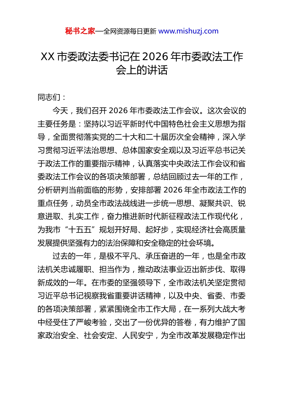 秘书之家—全网资源每日更新 www.mishuzj.comXX 市委政法委书记在 2026 年市委政法工作会上的讲话同志们:今天,我们召开 2026 年市委政法工作会议。这次会议的主要任务是:坚持以习近平新时代中国特色社会主义思想为指导,全面贯彻落实党的二十大和二十届历次全会精神,深入学习贯彻习近平法治思想、总体国家安全观以及习近平总书记关于政法工作的重要指示精神,认真落实中央政法工作会议和省委政法工作会议的各项决策部署,总结回顾过去一年的工作,分析研判当前面临的形势,安排部署 2026 年全市政法工作的重点任务,动员全市政法战线进一步统一思想、凝聚共识、锐意进取、扎实工作,奋力推进新时代新征程政法工作现代化,为我市“十五五”规划开好局、起好步,实现经济社会高质量发展提供坚强有力的法治保障和安全稳定的社会环境。过去的一年,是极不平凡、承压奋进的一年,也是全市政法机关忠诚履职、担当作为,推动政法事业迈出新步伐、取得新成效的一年。在市委的坚强领导下,全市政法机关坚定贯彻习近平总书记视察我省重要讲话精神,以及中央、省委、市委的各项决策部署,紧紧围绕全市工作大局,在一系列大战大考中经受住了严峻考验,交出了一份优异的答卷,有力维护了国家政治安全、社会安定、人民安宁,为全市改革发展稳定作出秘书之家—全网资源每日更新 www.mishuzj.com了重要贡献。一、凝心聚力,实干担当,2025 年全市政法工作取得长足发展进步回顾 2025 年,全市政法战线以高度的政治自觉和行动自觉,推动各项工作取得了显著成效,主要体现在以下几个方面:(一)党对政法工作的绝对领导持续加强。我们始终把政治建设摆在首位,确保政法工作坚定正确的政治方向。连续 4年举办政法领导干部专题研讨班,分层次、分系统开展全员政治轮训,不断筑牢政治忠诚的思想根基。全面贯彻《中国共产党政法工作条例》,严格落实政治督察、纪律作风督查巡查、重大事项请示报告等各项制度,确保党的路线方针政策在政法系统不折不扣地贯彻执行。不断加强党委政法委自身建设,完善制度机制,体系运行更加顺畅高效,党管政法的制度优势得到充分彰显。(二)维护国家安全和社会稳定更加有力。我们牢固树立总体国家安全观,坚决捍卫国家政治安全。圆满完成了一系列重大活动、重要节点的安保维稳任务,如我市举办的航空展、光博会、国际马拉松、汽博会、农博会等大型活动的安保整体工作,实现了“绝对安全、万无一失”的目标,得到了省市领导的充分肯定和好评。有效防范化解了各类风险隐患,确保了社会大局持续稳定。(三)社会治安防控能力水平不断提升。我们坚持打防结秘书之家—全网资源每日更新 www.mishuzj.com合、标本兼治,人民群众的安全感、满意度显著提升。常态化推进扫黑除恶斗争,始终保持对黑恶势力的严打高压态势,重拳打击各类突出违法犯罪活动。命案发案率同比下降 40%,现案破案率连续 8 年保持 100%,打击犯罪效能持续走在全省前列。2025 年,全市群众安全感同比提升 0.83 个百分点,平安建设的根基更加牢固。坚持和发展新时代“枫桥经验”,累计排查化解各类矛盾纠纷 50707 件,将大量风险隐患化解在基层、消除在萌芽状态。(四)法治服务保障高质量发展的成效更加凸显。全市政法机关主动融入发展大局,以高水平法治护航高质量发展。市法院创新设立全国首个“梅花鹿产业法庭”、东北首家企业庭外重组中心、全省首家农业知识产权司法保护工作站等特色平台,精准服务特色产业和市场主体。市检察院制定出台《服务我市全面振兴取得新突破十条措施》,研发应用大数据企业涉险自检系统,帮助多家企业有效规避了经营风险,体现了检察担当。市公安局大力推行“放管服”改革,实现 106 项业务“零跑审批”,窗口业务办理时长平均缩短 62%,“高效办成一件事”成为服务新常态。市司法局不断完善公共法律服务体系,深入开展“千名律师助企发展促振兴”等专项行动,为 30个重大建设项目提供了全过程、全方位的法律服务。市民政局在兜底保障、普惠民生等公共服务领域作出了积极贡献。我市智慧法务区建设持续完善法治服务生态,加快推进“法商融秘书之家...