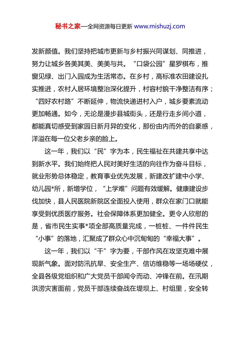 秘书之家—全网资源每日更新 www.mishuzj.com县委书记在 2026 年元旦前夕的新年贺词 同志们,朋友们:时光奔涌不息,奋斗未有穷期。值此 2026 年元旦来临之际,我谨代表县委、县人大、县政府、县政协,向全县广大干部群众,向所有关心支持发展的各界朋友,致以最诚挚的新年祝福!向节日期间仍坚守岗位的劳动者、守护平安的公安干警、救死扶伤的医护人员、辛勤耕耘的教育工作者,以及所有为这片土地默默奉献的人们,表示最崇高的敬意!回望 2025,是极不平凡、极具挑战,也极富成效的一年。面对复杂多变的外部环境和艰巨繁重的改革发展稳定任务,全县上下坚持以党的创新理论为指引,深入贯彻落实党的二十届四中全会精神,锚定高质量发展首要任务,迎难而上、锐意进取,在危机中育新机,于变局中开新局,交出了一份厚重提气、温暖人心的发展答卷。这一年,我们以“稳”字当头,经济大盘在承压前行中实现新突破。面对需求收缩、供给冲击等多重压力,我们坚持系统思维、精准施策,打出一套稳增长、调结构、促转型的“组合拳”。这一年,我们以“实”字托底,城乡面貌在精雕细琢中焕秘书之家—全网资源每日更新 www.mishuzj.com发新颜值。我们坚持把城市更新与乡村振兴同谋划、同推进,努力让城乡各美其美、美美与共。“口袋公园”星罗棋布,推窗见绿、出门入园成为生活常态。在乡村,高标准农田建设扎实推进,农村人居环境整治深化提升,村容村貌干净整洁有序;“四好农村路”不断延伸,物流快递进村入户,城乡要素流动更加畅通。如今,无论是漫步县城街头,还是行走乡间小道,都能真切感受到家园日新月异的变化,那份由内而外的自豪感,洋溢在每一位父老乡亲的脸上。这一年,我们以“民”字为本,民生福祉在共建共享中达到新水平。我们始终把人民对美好生活的向往作为奋斗目标,就业形势总体稳定,教育事业优先发展,新建改扩建中小学、幼儿园*所,新增学位,“上学难”问题有效缓解。健康建设步伐加快,县人民医院新院区全面投入使用,群众在家门口就能享受到优质医疗服务。社会保障体系更加健全。更令人欣慰的是,省市民生实事*项全部高质量完成,一桩桩、一件件民生“小事”的落地,汇聚成了群众心中沉甸甸的“幸福大事”。这一年,我们以“干”字为要,干部作风在攻坚克难中展现新气象。面对防汛抗旱、安全生产、信访维稳等一场场硬仗,全县各级党组织和广大党员干部闻令而动、冲锋在前。在汛期洪涝灾害面前,党员干部连续奋战在堤坝上、村组里,安全转秘书之家—全网资源每日更新 www.mishuzj.com移群众,实现了人员零伤亡、财产少损失;在优化营商环境一线,干部们主动靠前服务,为企业解决难题,用“辛苦指数”换取了企业的“发展指数”;在田间地头、工厂车间,大家用脚步丈量民情,用实干破解难题,真正把“办公室”搬到了群众身边。这种“时时放心不下”的责任感和“事事落实到位”的执行力,是我们战胜一切艰难险阻最坚实的底气。成绩来之不易,经验弥足珍贵。这一切的取得,根本在于党中央的坚强领导和省委、市委的正确指引,得益于历届班子打下的坚实基础,更凝聚着全县*万人民的智慧、心血与汗水。在此,我要向每一位热爱**、建设**、奉献**的奋斗者,致以最衷心的感谢!同时,我们也清醒地认识到,前进道路上仍有诸多挑战:产业结构还需进一步优化,新兴产业的支撑作用有待加强;部分民生领域还存在短板,优质公共服务供给仍需扩容提质;基层治理的精细化水平有待提升,一些历史遗留问题亟待化解。对此,我们必须保持清醒头脑,以更大的决心和更实的举措加以解决。展望 2026,新程已启,未来可期。我们将继续高举旗帜、感恩奋进,以更加昂扬的姿态、更加务实的作风,奋力谱写高质量发展新篇章。秘书之家—全网资源每日更新 www.mishuzj.com我们将坚定不移推动高质量发展,全力构建现代化产业体系。聚焦新质生产力培育,加快布局人工智能、绿色能源、生物医药等未来产业,推动传统产业“智改数转”,让创新成为驱动发展的最强引擎。我们将持续优化营商环境,当好服务企业的“店小二”,让每一个在投资兴业的市场主体都能安心、顺心、舒心。我们将持之以恒增...