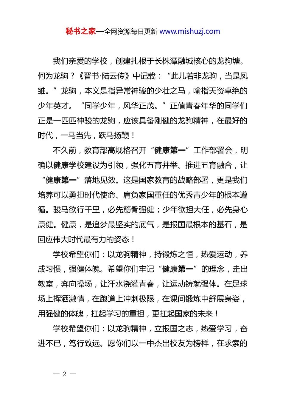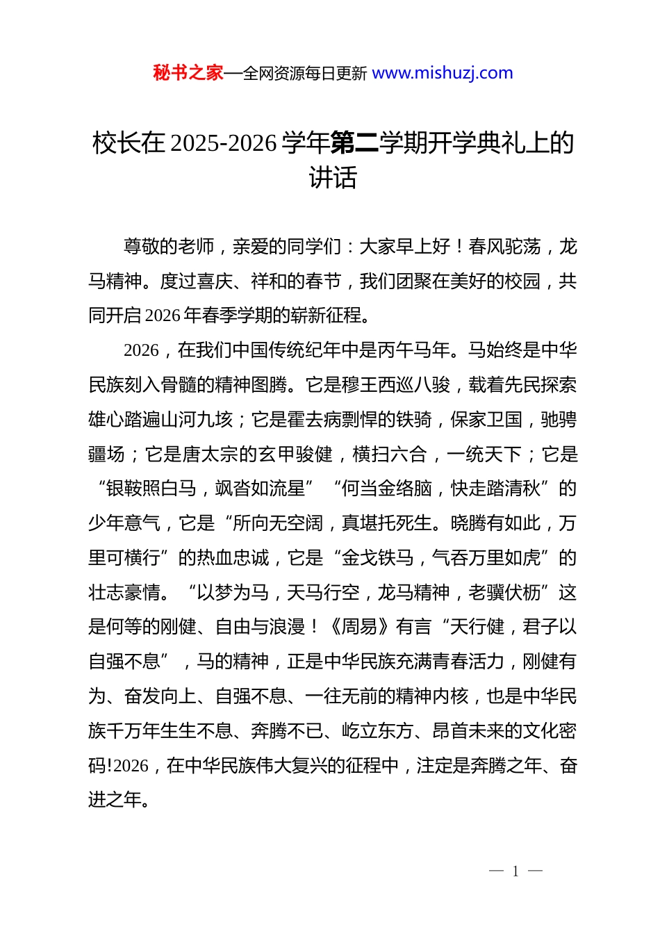 秘书之家—全网资源每日更新 www.mishuzj.com校长在 2025-2026 学年第二学期开学典礼上的讲话尊敬的老师,亲爱的同学们:大家早上好!春风驼荡,龙马精神。度过喜庆、祥和的春节,我们团聚在美好的校园,共同开启 2026 年春季学期的崭新征程。2026,在我们中国传统纪年中是丙午马年。马始终是中华民族刻入骨髓的精神图腾。它是穆王西巡八骏,载着先民探索雄心踏遍山河九垓;它是霍去病剽悍的铁骑,保家卫国,驰骋疆场;它是唐太宗的玄甲骏健,横扫六合,一统天下;它是“银鞍照白马,飒沓如流星”“何当金络脑,快走踏清秋”的少年意气,它是“所向无空阔,真堪托死生。晓腾有如此,万里可横行”的热血忠诚,它是“金戈铁马,气吞万里如虎”的壮志豪情。“以梦为马,天马行空,龙马精神,老骥伏枥”这是何等的刚健、自由与浪漫!《周易》有言“天行健,君子以自强不息”,马的精神,正是中华民族充满青春活力,刚健有为、奋发向上、自强不息、一往无前的精神内核,也是中华民族千万年生生不息、奔腾不已、屹立东方、昂首未来的文化密码!2026,在中华民族伟大复兴的征程中,注定是奔腾之年、奋进之年。— 1 —秘书之家—全网资源每日更新 www.mishuzj.com我们亲爱的学校,创建扎根于长株潭融城核心的龙驹塘。何为龙驹?《晋书·陆云传》中记载:“此儿若非龙驹,当是凤雏。”龙驹,本义是指异常神骏的少壮之马,喻指天资卓绝的少年英才。“同学少年,风华正茂。”正值青春年华的同学们正是一匹匹神骏的龙驹,应该具备刚健的龙驹精神,在最好的时代,一马当先,跃马扬鞭!不久前,教育部高规格召开“健康第一”工作部署会,明确以健康学校建设为引领,强化五育并举、推进五育融合,让“健康第一”落地见效。这是国家教育的战略部署,更是我们培养可以勇担时代使命、肩负家国重任的优秀青少年的根本遵循。骏马欲行千里,必先筋骨强健;少年欲担大任,必先身心康健。健康,是追梦最坚实的底气,是报国最根本的基石,是回应伟大时代最有力的姿态!学校希望你们:以龙驹精神,持锻炼之恒,热爱运动,养成习惯,强健体魄。希望你们牢记“健康第一”的理念,走出教室,奔向操场,让汗水浇灌青春,让运动铸就强体。在足球场上挥洒激情,在跑道上冲刺极限,在课间锻炼中舒展身姿,用强健的体魄,扛起学习的重担,更扛起国家的未来!学校希望你们:以龙驹精神,立报国之志,热爱学习,奋进不已,笃行致远。愿你们以一中杰出校友为榜样,在求索的— 2 —秘书之家—全网资源每日更新 www.mishuzj.com道路上勇毅前行,把个人理想融入国家发展大局,以真才实学筑牢成长根基,以坚定志向指引前行方向,不辞山海,追光逐梦,美好同行,芬芳致远!学校希望你们:以龙驹精神,创生活之美,热爱劳动,勇于探索,幸福快乐。这个寒假,我欣喜地看到很多同学分享自己的假期生活:有人坚持晨跑打卡,有人在球场尽情挥汗,有人陪伴父母登山远足,还有人学会了做第一道拿手菜。这些看似平常的小事,恰恰是最珍贵的成长,都是“健康第一”理念的最好践行。龙驹沐春风,健康创美好。新学期,学校也将以健康学校建设为引领,让“健康第一”的理念在城南校园落地生根。我们将高质量落实每天综合体育活动时间不低于 2 小时,让体育课、大课间真正成为大家强健体魄的活力时光;我们将持续深化心理健康教育,让每一位学生都被看见、被珍视;我们将健全校家社协同育人机制,凝聚育人合力,让健康种子在共育中茁壮成长。龙驹塘畔春风暖,奋楫扬帆正当时。让我们在新的学期,新的征程,身心健康,生活美好,学习进步,未来可期!— 3 —