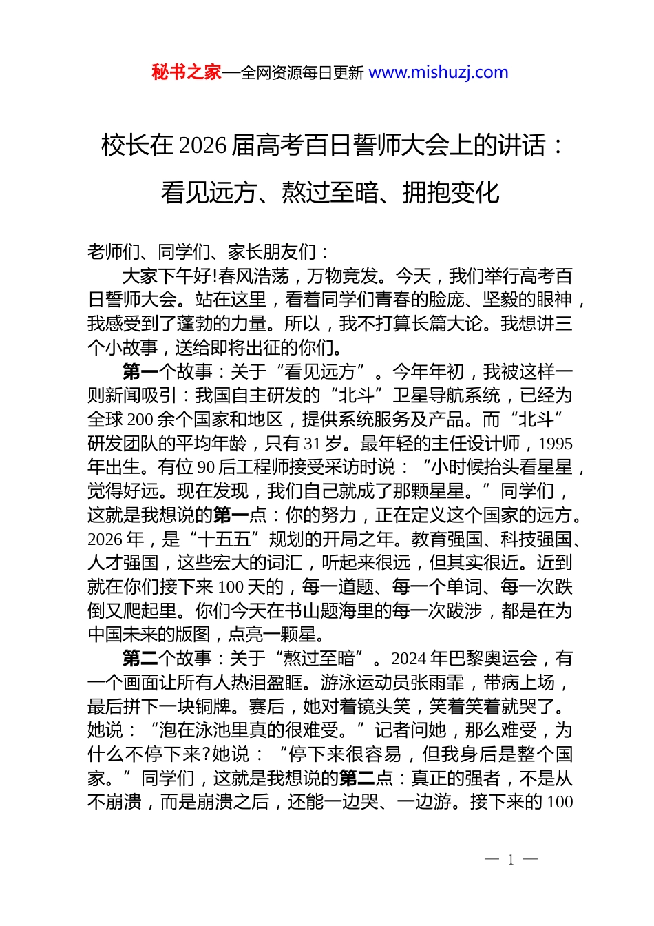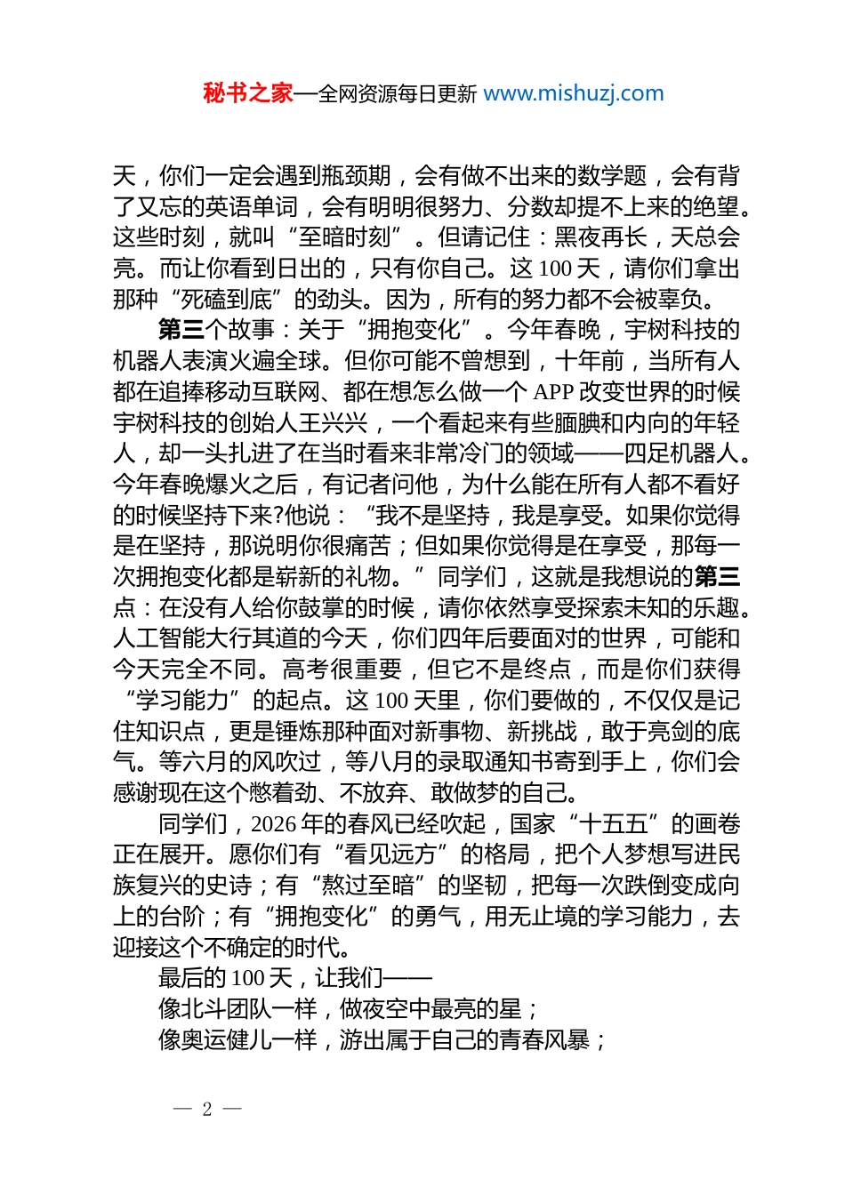 秘书之家—全网资源每日更新 www.mishuzj.com校长在 2026 届高考百日誓师大会上的讲话:看见远方、熬过至暗、拥抱变化老师们、同学们、家长朋友们:大家下午好!春风浩荡,万物竞发。今天,我们举行高考百日誓师大会。站在这里,看着同学们青春的脸庞、坚毅的眼神,我感受到了蓬勃的力量。所以,我不打算长篇大论。我想讲三个小故事,送给即将出征的你们。第一个故事:关于“看见远方”。今年年初,我被这样一则新闻吸引:我国自主研发的“北斗”卫星导航系统,已经为全球 200 余个国家和地区,提供系统服务及产品。而“北斗”研发团队的平均年龄,只有 31 岁。最年轻的主任设计师,1995年出生。有位 90 后工程师接受采访时说:“小时候抬头看星星,觉得好远。现在发现,我们自己就成了那颗星星。”同学们,这就是我想说的第一点:你的努力,正在定义这个国家的远方。2026 年,是“十五五”规划的开局之年。教育强国、科技强国、人才强国,这些宏大的词汇,听起来很远,但其实很近。近到就在你们接下来 100 天的,每一道题、每一个单词、每一次跌倒又爬起里。你们今天在书山题海里的每一次跋涉,都是在为中国未来的版图,点亮一颗星。第二个故事:关于“熬过至暗”。2024 年巴黎奥运会,有一个画面让所有人热泪盈眶。游泳运动员张雨霏,带病上场,最后拼下一块铜牌。赛后,她对着镜头笑,笑着笑着就哭了。她说:“泡在泳池里真的很难受。”记者问她,那么难受,为什么不停下来?她说:“停下来很容易,但我身后是整个国家。”同学们,这就是我想说的第二点:真正的强者,不是从不崩溃,而是崩溃之后,还能一边哭、一边游。接下来的 100— 1 —秘书之家—全网资源每日更新 www.mishuzj.com天,你们一定会遇到瓶颈期,会有做不出来的数学题,会有背了又忘的英语单词,会有明明很努力、分数却提不上来的绝望。这些时刻,就叫“至暗时刻”。但请记住:黑夜再长,天总会亮。而让你看到日出的,只有你自己。这 100 天,请你们拿出那种“死磕到底”的劲头。因为,所有的努力都不会被辜负。第三个故事:关于“拥抱变化”。今年春晚,宇树科技的机器人表演火遍全球。但你可能不曾想到,十年前,当所有人都在追捧移动互联网、都在想怎么做一个 APP 改变世界的时候宇树科技的创始人王兴兴,一个看起来有些腼腆和内向的年轻人,却一头扎进了在当时看来非常冷门的领域——四足机器人。今年春晚爆火之后,有记者问他,为什么能在所有人都不看好的时候坚持下来?他说:“我不是坚持,我是享受。如果你觉得是在坚持,那说明你很痛苦;但如果你觉得是在享受,那每一次拥抱变化都是崭新的礼物。”同学们,这就是我想说的第三点:在没有人给你鼓掌的时候,请你依然享受探索未知的乐趣。人工智能大行其道的今天,你们四年后要面对的世界,可能和今天完全不同。高考很重要,但它不是终点,而是你们获得“学习能力”的起点。这 100 天里,你们要做的,不仅仅是记住知识点,更是锤炼那种面对新事物、新挑战,敢于亮剑的底气。等六月的风吹过,等八月的录取通知书寄到手上,你们会感谢现在这个憋着劲、不放弃、敢做梦的自己。同学们,2026 年的春风已经吹起,国家“十五五”的画卷正在展开。愿你们有“看见远方”的格局,把个人梦想写进民族复兴的史诗;有“熬过至暗”的坚韧,把每一次跌倒变成向上的台阶;有“拥抱变化”的勇气,用无止境的学习能力,去迎接这个不确定的时代。最后的 100 天,让我们——像北斗团队一样,做夜空中最亮的星;像奥运健儿一样,游出属于自己的青春风暴;— 2 —秘书之家—全网资源每日更新 www.mishuzj.com像所有改变世界的年轻人一样,用这 100 天,去赢一个无悔的夏天!谢谢大家!— 3 —