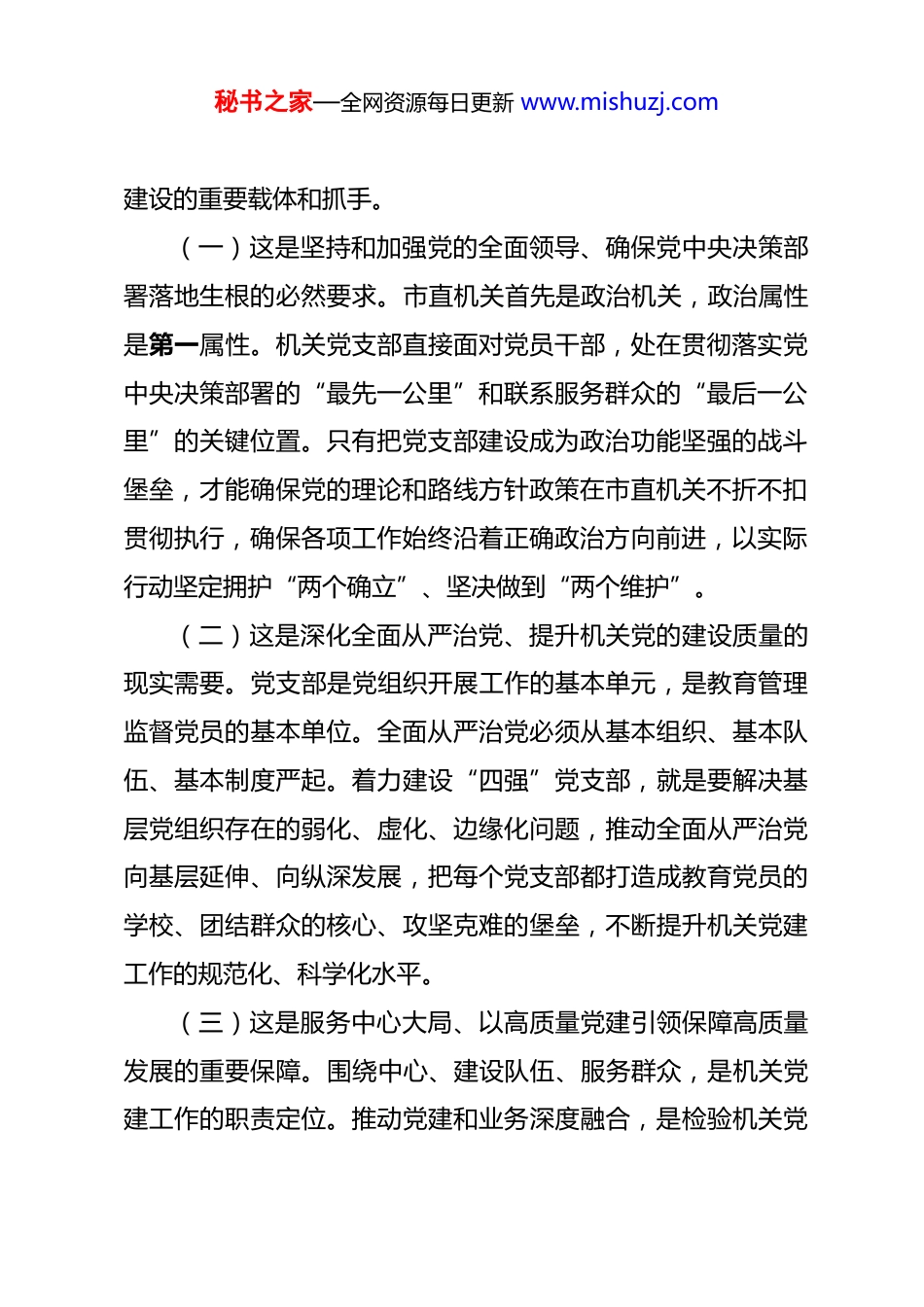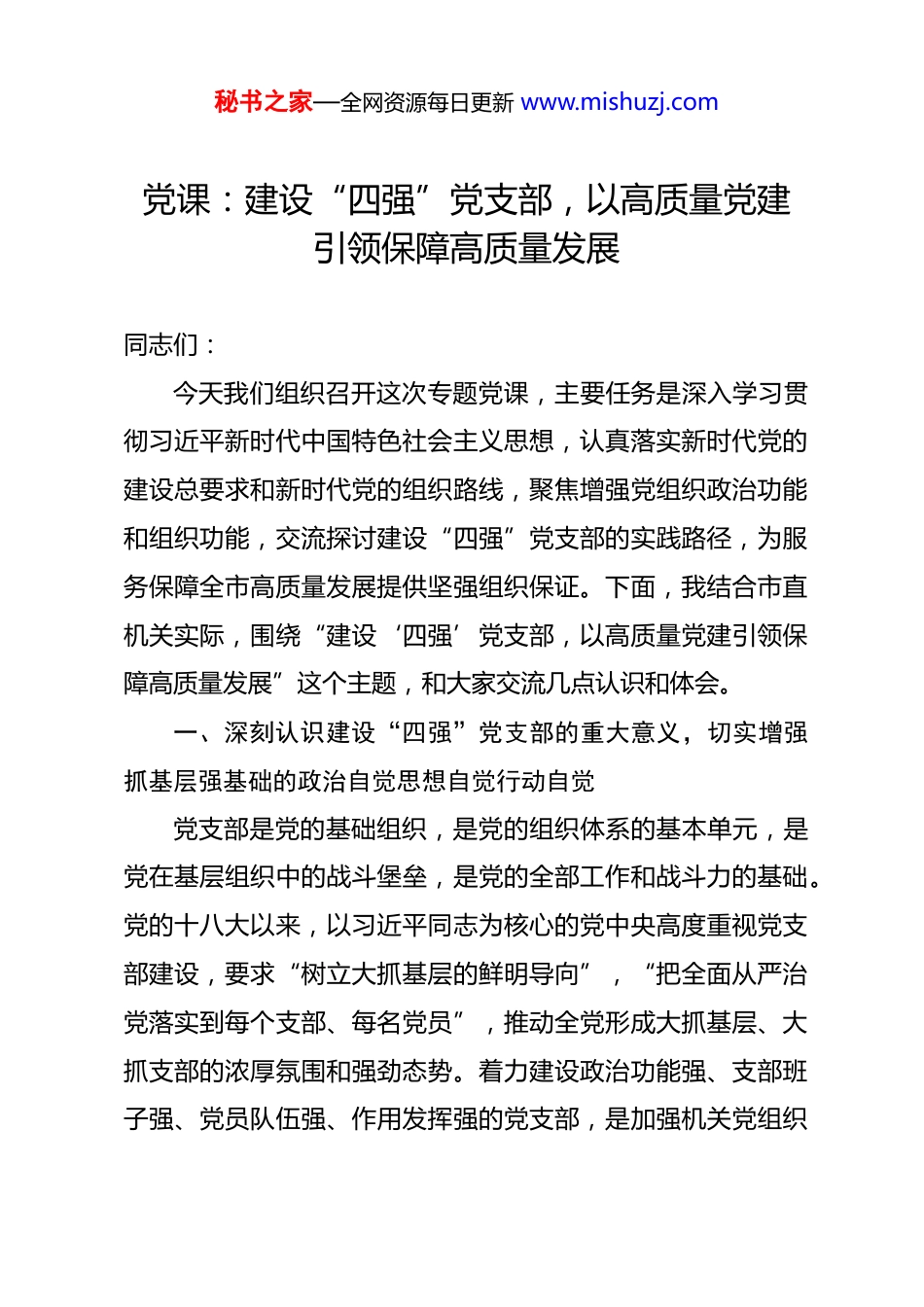 秘书之家—全网资源每日更新 www.mishuzj.com党课:建设“四强”党支部,以高质量党建引领保障高质量发展 同志们:今天我们组织召开这次专题党课,主要任务是深入学习贯彻习近平新时代中国特色社会主义思想,认真落实新时代党的建设总要求和新时代党的组织路线,聚焦增强党组织政治功能和组织功能,交流探讨建设“四强”党支部的实践路径,为服务保障全市高质量发展提供坚强组织保证。下面,我结合市直机关实际,围绕“建设‘四强’党支部,以高质量党建引领保障高质量发展”这个主题,和大家交流几点认识和体会。一、深刻认识建设“四强”党支部的重大意义,切实增强抓基层强基础的政治自觉思想自觉行动自觉党支部是党的基础组织,是党的组织体系的基本单元,是党在基层组织中的战斗堡垒,是党的全部工作和战斗力的基础。党的十八大以来,以习近平同志为核心的党中央高度重视党支部建设,要求“树立大抓基层的鲜明导向”,“把全面从严治党落实到每个支部、每名党员”,推动全党形成大抓基层、大抓支部的浓厚氛围和强劲态势。着力建设政治功能强、支部班子强、党员队伍强、作用发挥强的党支部,是加强机关党组织秘书之家—全网资源每日更新 www.mishuzj.com建设的重要载体和抓手。(一)这是坚持和加强党的全面领导、确保党中央决策部署落地生根的必然要求。市直机关首先是政治机关,政治属性是第一属性。机关党支部直接面对党员干部,处在贯彻落实党中央决策部署的“最先一公里”和联系服务群众的“最后一公里”的关键位置。只有把党支部建设成为政治功能坚强的战斗堡垒,才能确保党的理论和路线方针政策在市直机关不折不扣贯彻执行,确保各项工作始终沿着正确政治方向前进,以实际行动坚定拥护“两个确立”、坚决做到“两个维护”。(二)这是深化全面从严治党、提升机关党的建设质量的现实需要。党支部是党组织开展工作的基本单元,是教育管理监督党员的基本单位。全面从严治党必须从基本组织、基本队伍、基本制度严起。着力建设“四强”党支部,就是要解决基层党组织存在的弱化、虚化、边缘化问题,推动全面从严治党向基层延伸、向纵深发展,把每个党支部都打造成教育党员的学校、团结群众的核心、攻坚克难的堡垒,不断提升机关党建工作的规范化、科学化水平。(三)这是服务中心大局、以高质量党建引领保障高质量发展的重要保障。围绕中心、建设队伍、服务群众,是机关党建工作的职责定位。推动党建和业务深度融合,是检验机关党秘书之家—全网资源每日更新 www.mishuzj.com建成效的根本标准。建设“四强”党支部,就是要紧紧围绕全市中心工作,找准党建与业务工作的结合点、发力点,把党组织的政治优势、组织优势转化为推动发展的强大动力,引导广大党员干部在改革发展稳定第一线担当作为、建功立业,为我市高质量发展提供坚强政治保证和组织保障。二、总结实践,把握关键,扎实推进“四强”党支部建设近年来,市直机关各级党组织认真贯彻落实中央、省委和市委部署要求,以提升组织力为重点,突出政治功能,持续用力抓基层、打基础,积极探索“四强”党支部建设的有效路径,取得了阶段性成效。我们立足市直机关实际,围绕“四强”目标,进行了初步的实践探索。(一)牢牢把握“政治功能强”这个首要,持续用力强基固本、把准方向。始终将党的政治建设摆在首位,教育引导党员干部不断提高政治判断力、政治领悟力、政治执行力。一是强化理论武装,拧紧“总开关”。坚持把学懂弄通做实习近平新时代中国特色社会主义思想作为重中之重,健全并落实“党组(党委)理论学习中心组领学、机关党委督学、党支部研学、青年理论学习小组深学、党员自学”的“五学联动”机制。围绕学习贯彻党的二十届四中全会精神、中央经济工作会议精神、省市党代会精神及树立和践行正确政绩观学习教育等,组织专秘书之家—全网资源每日更新 www.mishuzj.com题学习研讨、集中轮训余场次,覆盖党员干部万余人次,推动党的创新理论入脑入心、见行见效。二是强化政治训练,锤炼“忠诚度”。常态化开展政治机关意识教育、对党忠诚教育、理想信念教育,严格执行“第一议题”制度,及时传达学习习近平总书...