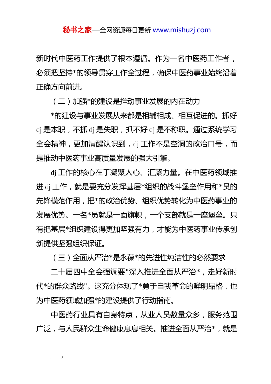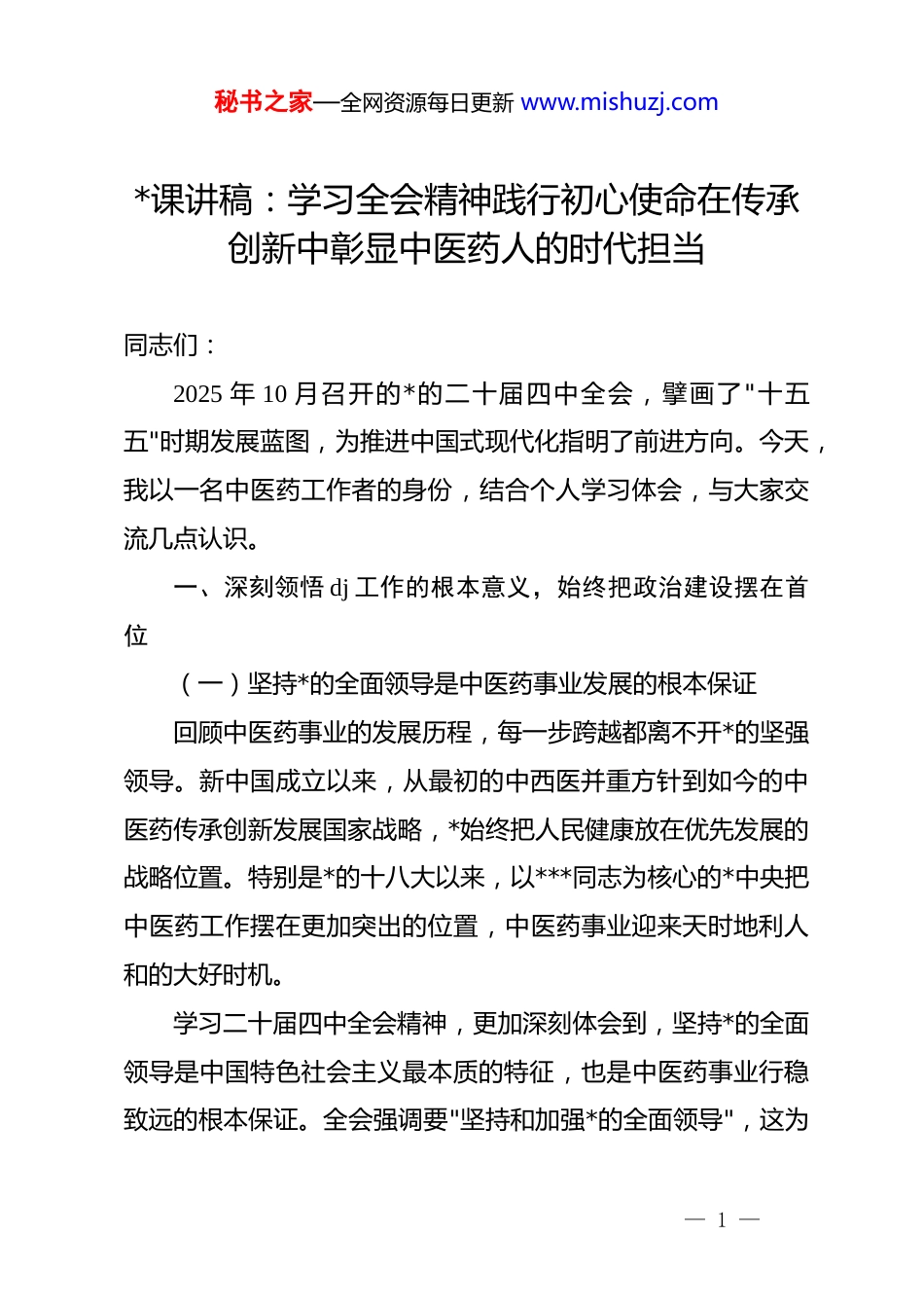 秘书之家—全网资源每日更新 www.mishuzj.com*课讲稿:学习全会精神践行初心使命在传承创新中彰显中医药人的时代担当同志们:2025 年 10 月召开的*的二十届四中全会,擘画了"十五五"时期发展蓝图,为推进中国式现代化指明了前进方向。今天,我以一名中医药工作者的身份,结合个人学习体会,与大家交流几点认识。一、深刻领悟 dj 工作的根本意义,始终把政治建设摆在首位(一)坚持*的全面领导是中医药事业发展的根本保证回顾中医药事业的发展历程,每一步跨越都离不开*的坚强领导。新中国成立以来,从最初的中西医并重方针到如今的中医药传承创新发展国家战略,*始终把人民健康放在优先发展的战略位置。特别是*的十八大以来,以***同志为核心的*中央把中医药工作摆在更加突出的位置,中医药事业迎来天时地利人和的大好时机。学习二十届四中全会精神,更加深刻体会到,坚持*的全面领导是中国特色社会主义最本质的特征,也是中医药事业行稳致远的根本保证。全会强调要"坚持和加强*的全面领导",这为— 1 —秘书之家—全网资源每日更新 www.mishuzj.com新时代中医药工作提供了根本遵循。作为一名中医药工作者,必须把坚持*的领导贯穿工作全过程,确保中医药事业始终沿着正确方向前进。(二)加强*的建设是推动事业发展的内在动力*的建设与事业发展从来都是相辅相成、相互促进的。抓好dj 是本职,不抓 dj 是失职,抓不好 dj 是不称职。通过系统学习全会精神,更加清醒认识到,dj 工作不是空洞的政治口号,而是推动中医药事业高质量发展的强大引擎。dj 工作的核心在于凝聚人心、汇聚力量。在中医药领域推进 dj 工作,就是要充分发挥基层*组织的战斗堡垒作用和*员的先锋模范作用,把*的政治优势、组织优势转化为中医药事业的发展优势。一名*员就是一面旗帜,一个支部就是一座堡垒。只有把基层*组织建设得更加坚强有力,才能为中医药事业传承创新提供坚强组织保证。(三)全面从严治*是永葆*的先进性纯洁性的必然要求二十届四中全会强调要"深入推进全面从严治*,走好新时代*的群众路线"。这充分体现了*勇于自我革命的鲜明品格,也为中医药领域加强*的建设提供了行动指南。中医药行业具有自身特点,从业人员数量众多,服务范围广泛,与人民群众生命健康息息相关。推进全面从严治*,就是— 2 —秘书之家—全网资源每日更新 www.mishuzj.com要营造风清气正的行业生态,确保中医药事业始终服务人民、造福社会。作为中医药工作者,要自觉把纪律规矩挺在前面,守住底线、不越红线,以实际行动践行共产*员的初心使命。二、系统把握二十届四中全会精神实质,深刻理解中国式现代化的丰富内涵(一)中国式现代化是全体人民共同富裕的现代化全会指出,共同富裕是中国式现代化的重要特征和本质要求。"十五五"时期,要把扎实推进共同富裕作为经济社会发展的重要目标,在高质量发展中促进共同富裕。共同富裕不是少数人的富裕,而是全体人民的富裕。在中医药领域推进共同富裕,就是要让优质中医药服务更加普惠可及,让人民群众在家门口就能享受到高质量的中医药服务。近年来,国家大力推进基层中医药服务能力建设,推动中医药进社区、进乡村、进家庭,正是共同富裕理念在卫生健康领域的生动实践。(二)中国式现代化是物质文明和精神文明相协调的现代化物质富足、精神富有是社会主义现代化的根本要求。全会强调要扎实推进文化强国建设,发展具有强大思想引领力、精神凝聚力、价值感召力、国际影响力的***********文化。— 3 —秘书之家—全网资源每日更新 www.mishuzj.com中医药文化是中华优秀传统文化的重要组成部分,承载着中华民族几千年的健康养生理念和实践经验。在推进中国式现代化进程中,既要传承好中医药这一宝贵财富,又要推动中医药文化创造性转化、创新性发展,让古老智慧焕发新的时代光芒。物质文明与精神文明协调发展,在中医药事业中体现为既要提升服务能力和产业水平,又要弘扬中医药文化精髓,实现"形神兼备"的全面发展。(三)以经济建设为中心是推进中国式现代化的坚实支撑发展是解决一切问题的基础和关键。全会指出,高质量发展是全面建设社会主义现代化国家...