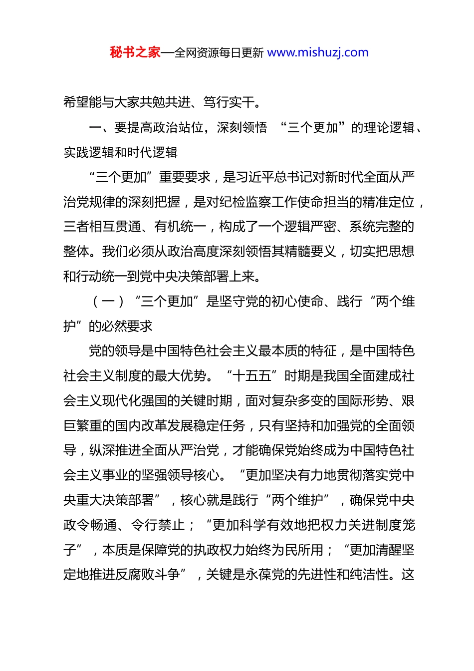 秘书之家—全网资源每日更新 www.mishuzj.com市纪委书记党课讲稿:坚持“三个更加”以全面从严治党新成效护航“十五五”开局起步 同志们:习近平总书记在二十届中央纪委五次全会上发表的重要讲话,高屋建瓴、思想深邃、内涵丰富,为新征程纵深推进全面从严治党、党风廉政建设和反腐败斗争提供了根本遵循。讲话中提出的 “更加坚决有力地贯彻落实党中央重大决策部署,更加科学有效地把权力关进制度笼子,更加清醒坚定地推进反腐败斗争”这“三个更加”重要要求,立足党和国家事业发展全局,紧扣“十五五”时期目标任务,从目标导向、实践路径、核心关键三个维度,勾勒出新时代全面从严治党的“施工图”和“任务书”。作为纪检监察机关,我们身处全面从严治党的最前沿,是推进党的自我革命的重要力量。当前,全市正处于抢抓“十五五”开局机遇、推动高质量发展的关键时期,改革发展稳定任务艰巨繁重,全面从严治党的责任更加重大、使命更加光荣。今天,我以“坚持“三个更加”以全面从严治党新成效护航‘十五五’”开局起步”为主题,结合全市纪检监察工作实际,与同志们作一次交流,既是对中央纪委五次全会精神的再学习、再领会,也是对下一步工作的再部署、再动员,秘书之家—全网资源每日更新 www.mishuzj.com希望能与大家共勉共进、笃行实干。一、要提高政治站位,深刻领悟 “三个更加”的理论逻辑、实践逻辑和时代逻辑“三个更加”重要要求,是习近平总书记对新时代全面从严治党规律的深刻把握,是对纪检监察工作使命担当的精准定位,三者相互贯通、有机统一,构成了一个逻辑严密、系统完整的整体。我们必须从政治高度深刻领悟其精髓要义,切实把思想和行动统一到党中央决策部署上来。(一)“三个更加”是坚守党的初心使命、践行“两个维护”的必然要求党的领导是中国特色社会主义最本质的特征,是中国特色社会主义制度的最大优势。“十五五”时期是我国全面建成社会主义现代化强国的关键时期,面对复杂多变的国际形势、艰巨繁重的国内改革发展稳定任务,只有坚持和加强党的全面领导,纵深推进全面从严治党,才能确保党始终成为中国特色社会主义事业的坚强领导核心。“更加坚决有力地贯彻落实党中央重大决策部署”,核心就是践行“两个维护”,确保党中央政令畅通、令行禁止;“更加科学有效地把权力关进制度笼子”,本质是保障党的执政权力始终为民所用;“更加清醒坚定地推进反腐败斗争”,关键是永葆党的先进性和纯洁性。这秘书之家—全网资源每日更新 www.mishuzj.com“三个更加”,归根结底是为了坚守党的初心使命,确保党在新征程上不变质、不变色、不变味。(二)“三个更加”是总结新时代全面从严治党实践经验的科学提炼党的十八大以来,以习近平同志为核心的党中央以前所未有的决心和力度推进全面从严治党,刹住了一些长期没有刹住的歪风,纠治了一些多年未除的顽瘴痼疾,反腐败斗争取得压倒性胜利并全面巩固,党的自我净化、自我完善、自我革新、自我提高能力显著增强。二十届中央纪委五次全会提出的 “三个更加”,正是对新时代全面从严治党实践经验的升华。从“坚决有力贯彻落实党中央决策部署”的政治监督实践,到“科学有效制约权力”的制度建设探索,再到“坚定推进反腐败斗争”的攻坚战持久战,“三个更加”既延续了新时代全面从严治党的基本方略,又结合“十五五”时期的新特点提出了更高标准、更实举措,体现了党中央对全面从严治党规律认识的不断深化。(三)“三个更加”是护航“十五五”时期目标任务实现的坚强保障“十五五”时期,我国将迎来全面建设社会主义现代化国家的关键节点,各项改革发展任务事关全局、事关长远。当前,秘书之家—全网资源每日更新 www.mishuzj.com我市正处于转型升级、提质增效的攻坚期,XX、XX 等特色产业面临转型升级的压力,民生保障、基层治理等领域还存在不少短板,各种风险挑战交织叠加。越是任务艰巨,越要坚持全面从严治党;越是攻坚克难,越要强化党的纪律保障。“三个更加”重要要求,精准对接“十五五”时期的发展需求,通过强化政治监督确保党中央重大决策部署在我市落地生根,通过扎紧制度笼子规范权力运...